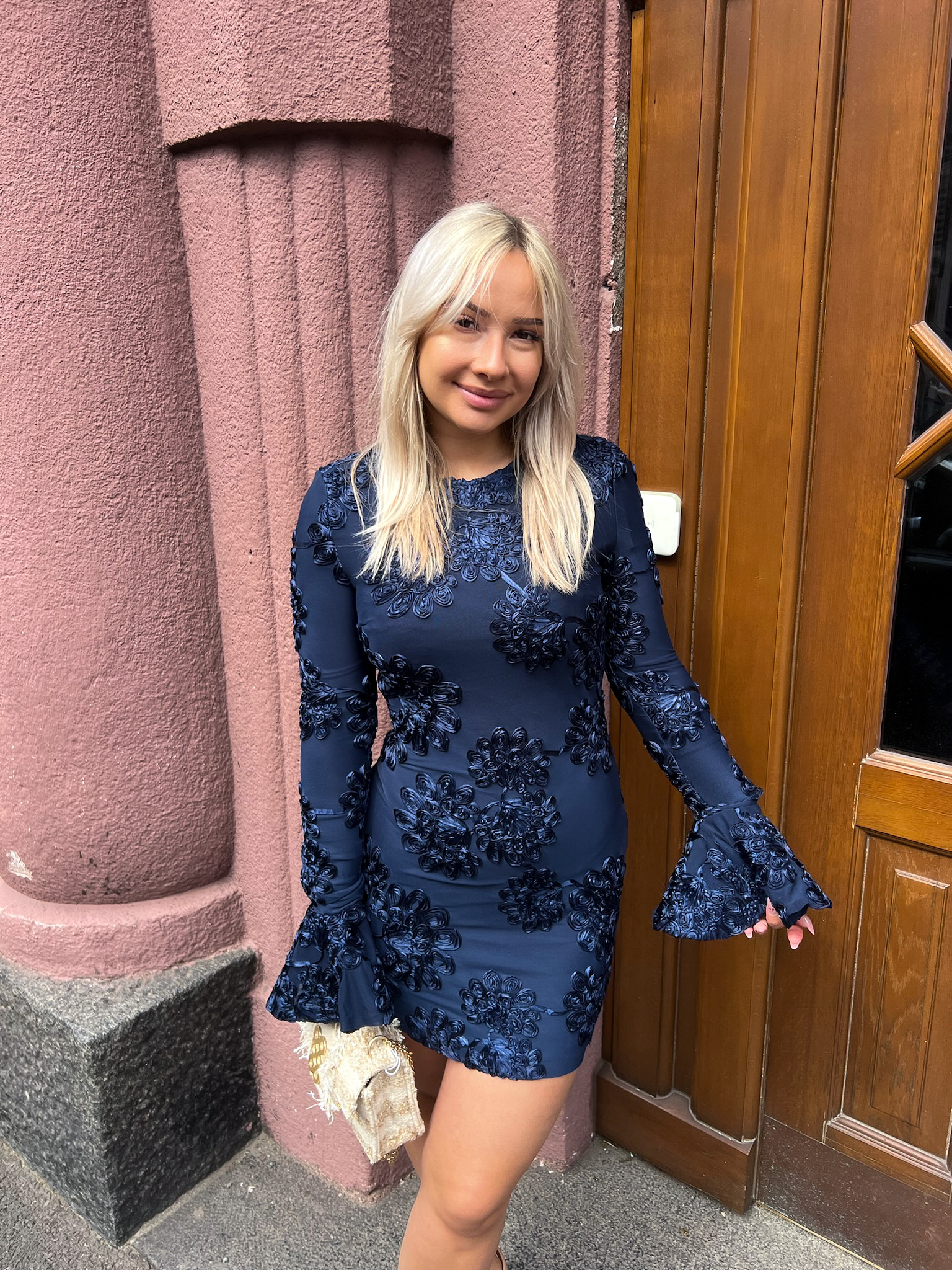 "3D Mesh Mini Dress" fra ROTATE Birger Christensen. Vakker minikjole fra ROTATE med ton-i-ton blomster. Flower Mesh Mini Dress har lange, smale ermer med lang, utsvingt mansjett. Kjolen har kort lengde og kroppsnær silhuett. Knappelukking i nakken og åpen i ryggen.