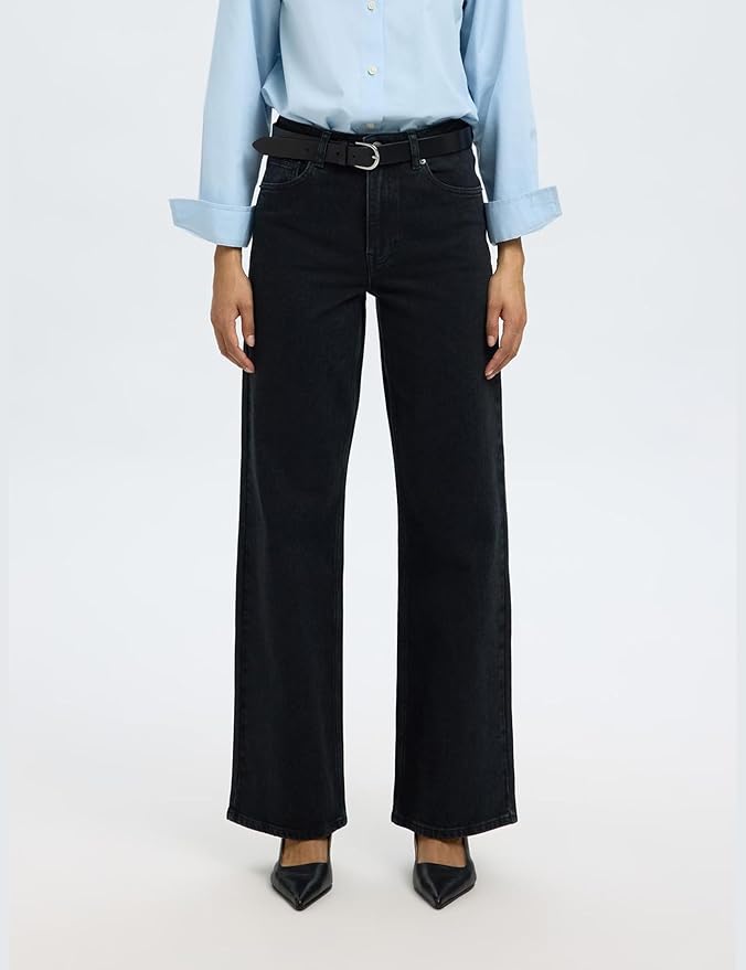 Enkel og klassisk jeans fra Selected Femme med en avslappet og komfortabel passform. Modellen har høy midje, et lett vidt ben som starter fra hoften og går nedover, samt lommer både foran og bak. Laget av 99 % økologisk bomull med et lite innslag av stretch.