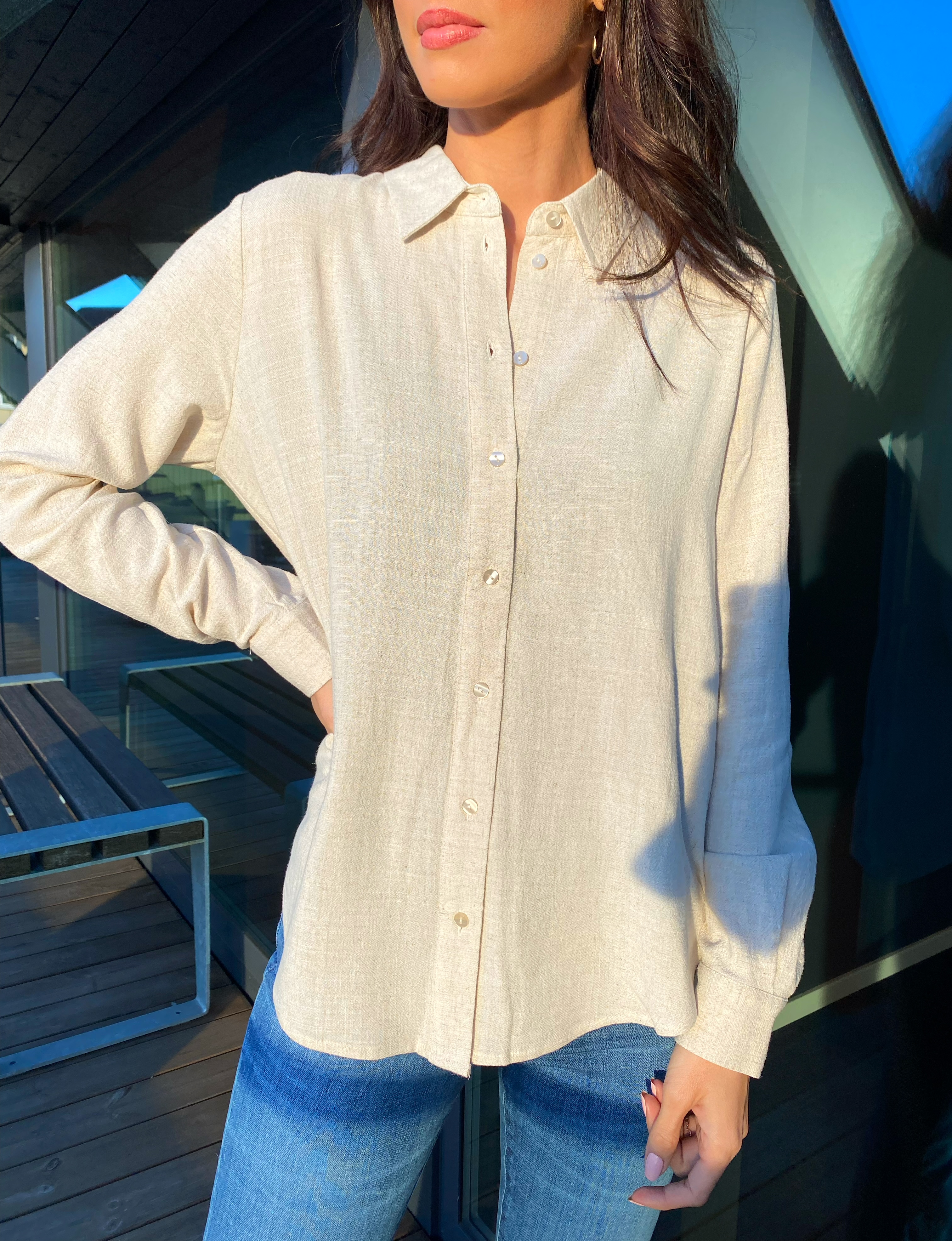 «Viva shirt» fra Selected Femme er en klassisk skjorte i fargen «Sandshell». Skjorten har krage, lang erm og lukkes med knapper. Normal i størrelsen.