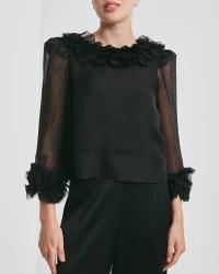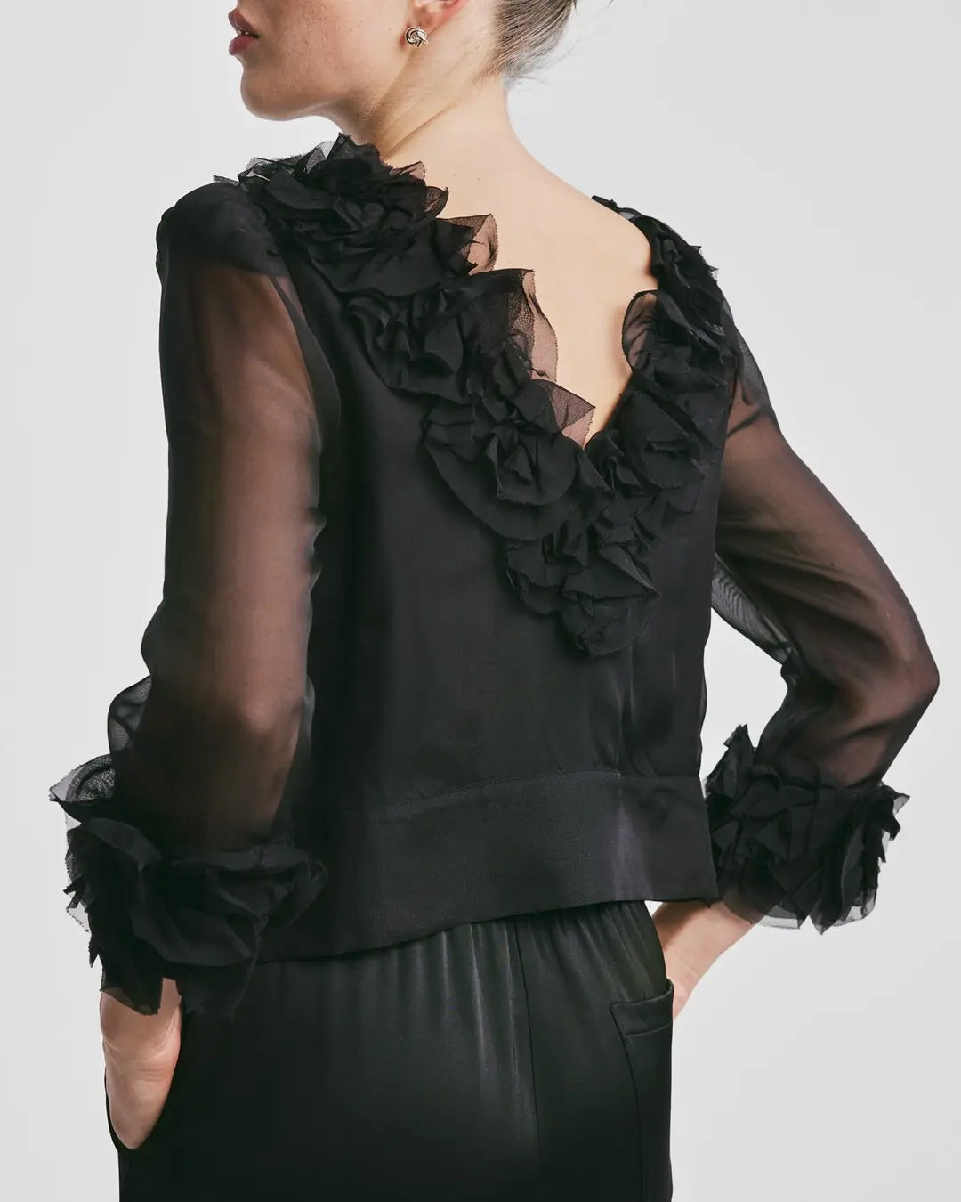 "Organza Frilly Top" fra byTiMo. Denne toppen er laget av en deilig viskoseblanding. Toppen har volangkant rundt halsen og ved mansjettene. Toppen har v-rygg med volangkant, halvlange ermer og liten skulderpute.