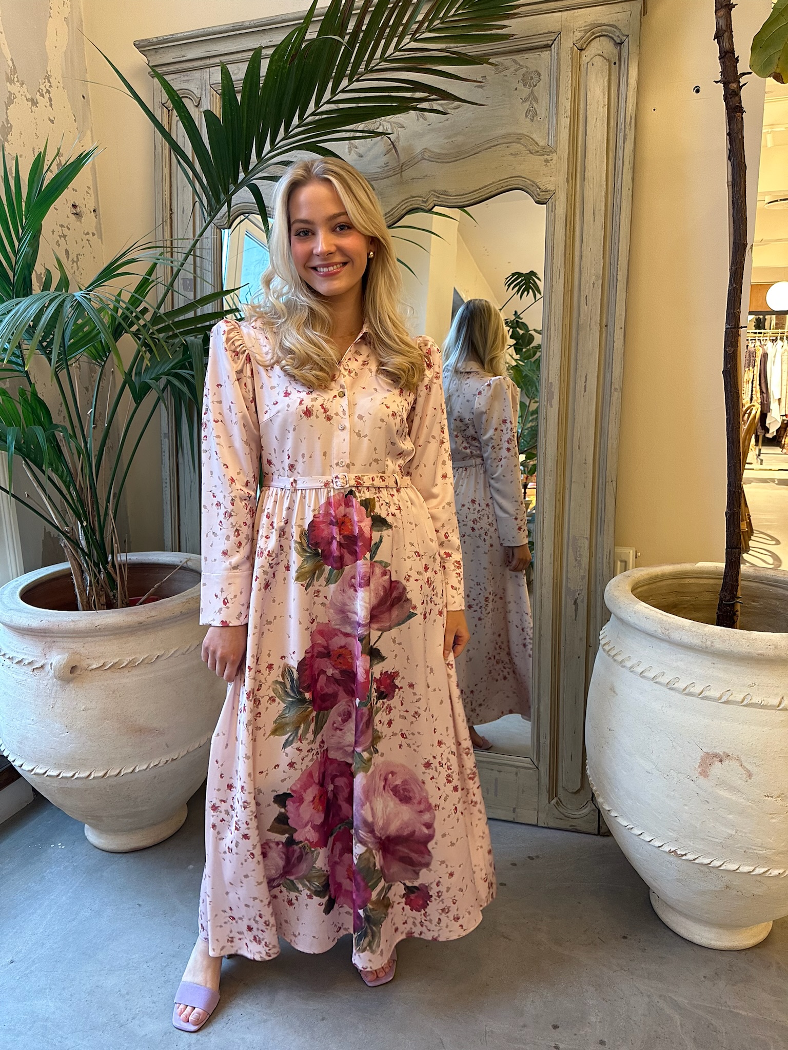 "Tailored Satin Shirt Dress" fra byTiMo. Nydelig midi kjole med a-formet skjørt og lange feminine ermer. Kjolen har en vakker krage og avtagbart belte i midjen.