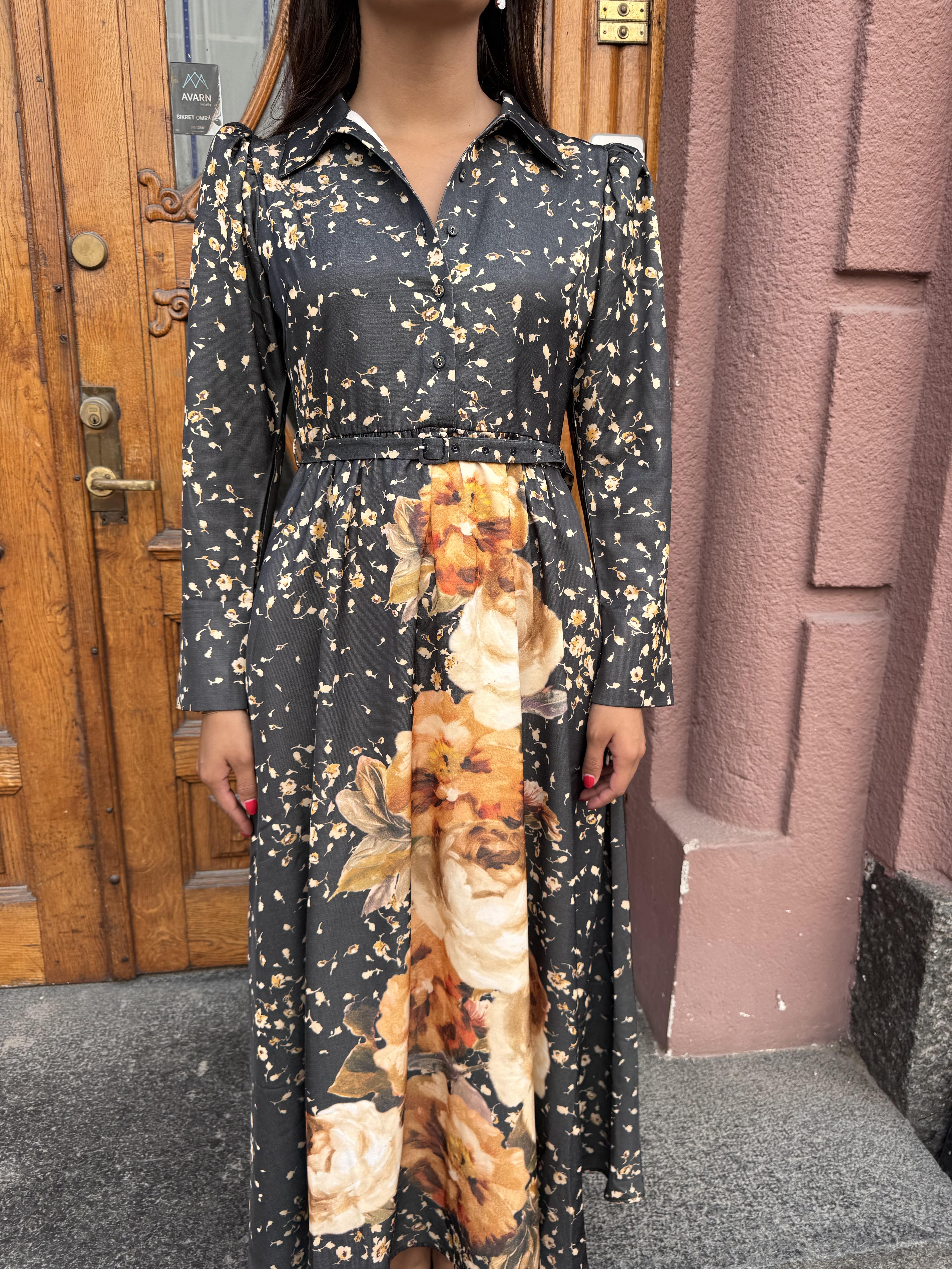 "Tailored Satin Shirt Dress" fra byTiMo. Nydelig midi kjole med a-formet skjørt og lange feminine ermer. Kjolen har en vakker krage og avtagbart belte i midjen.