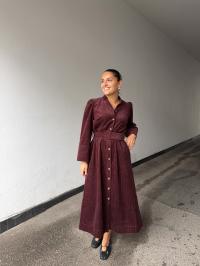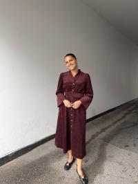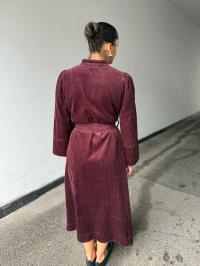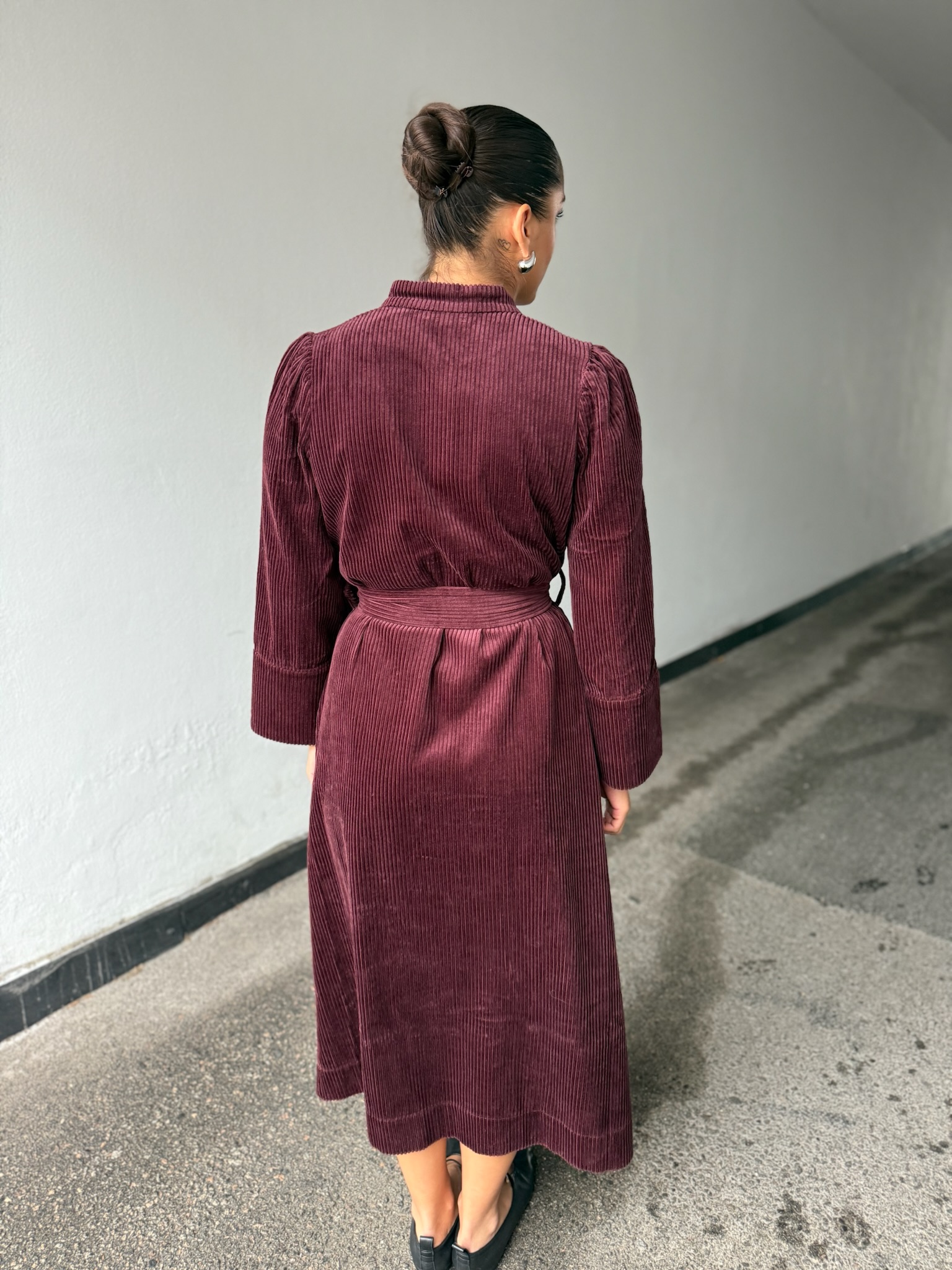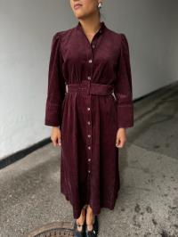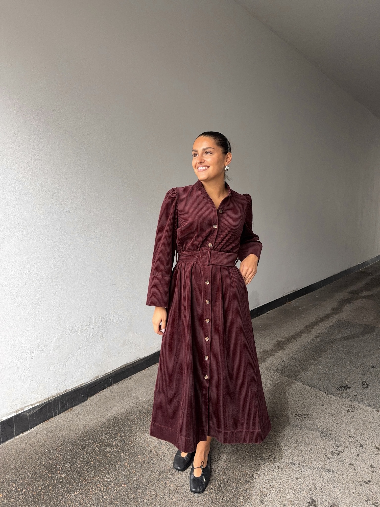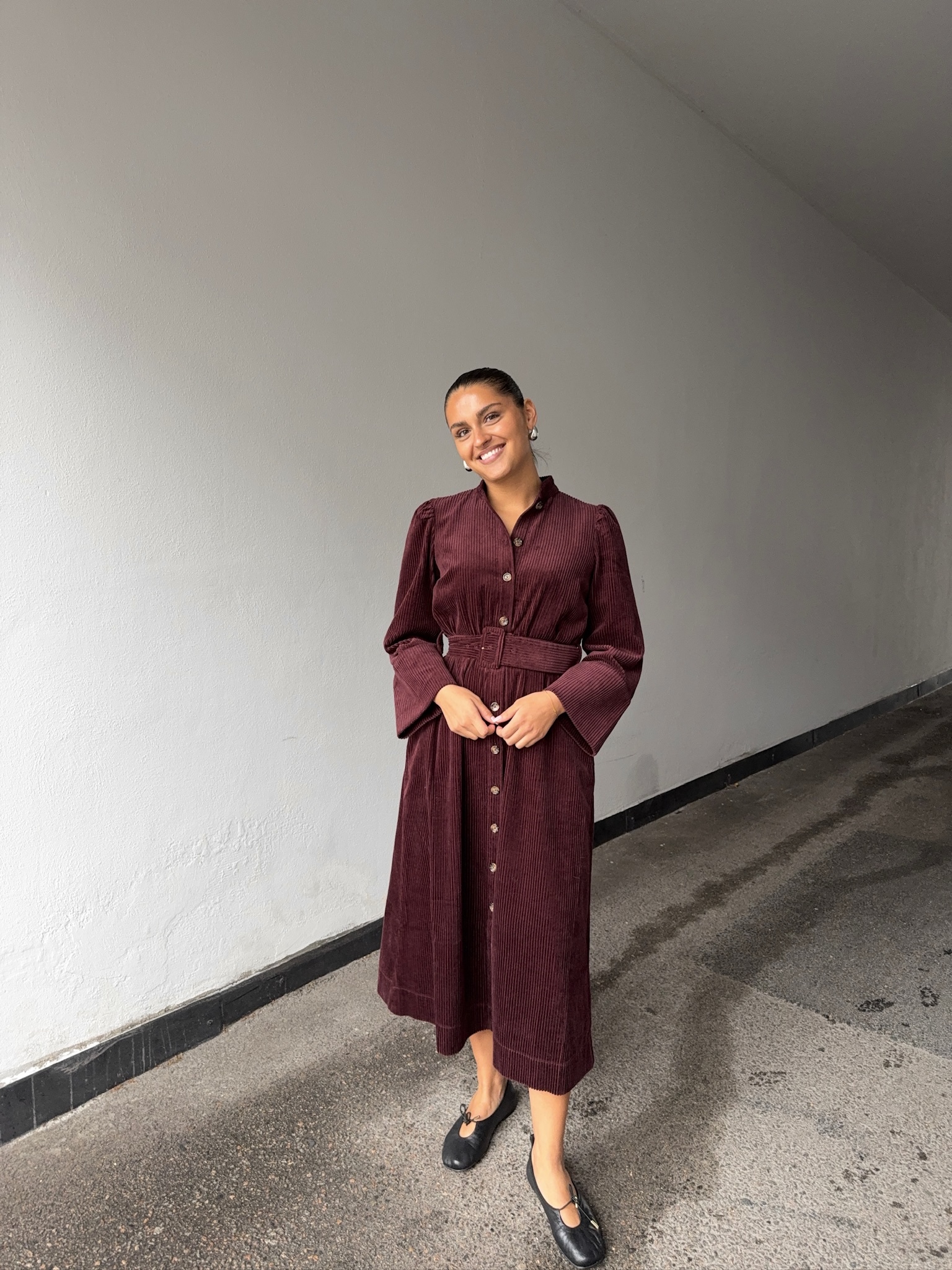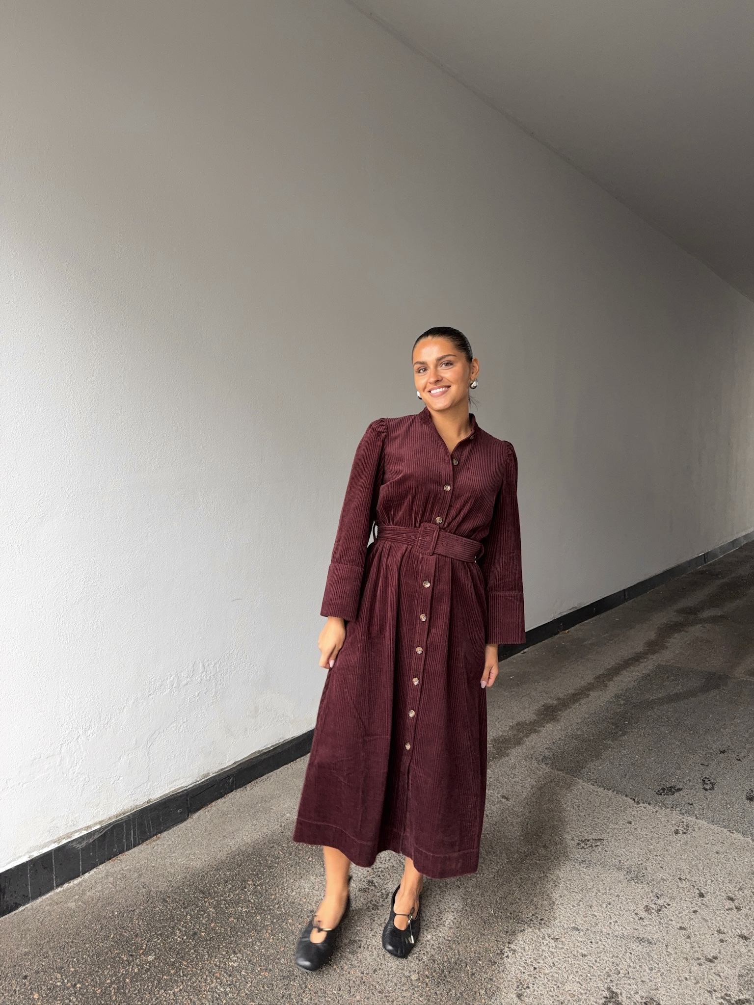 "Baby Cord Belt Dress "fra byTiMo. Denne kjolen er har en midilengde, et tilpasset topp, et A-formet skjørt, mandarinkrage, knapper nedover fronten og bjelleermer. Den leveres med et løst, matchende belte. Kjolen er sammensatt av 100% bomull, og er BCI-sertifisert. Perfekt for enhver anledning.