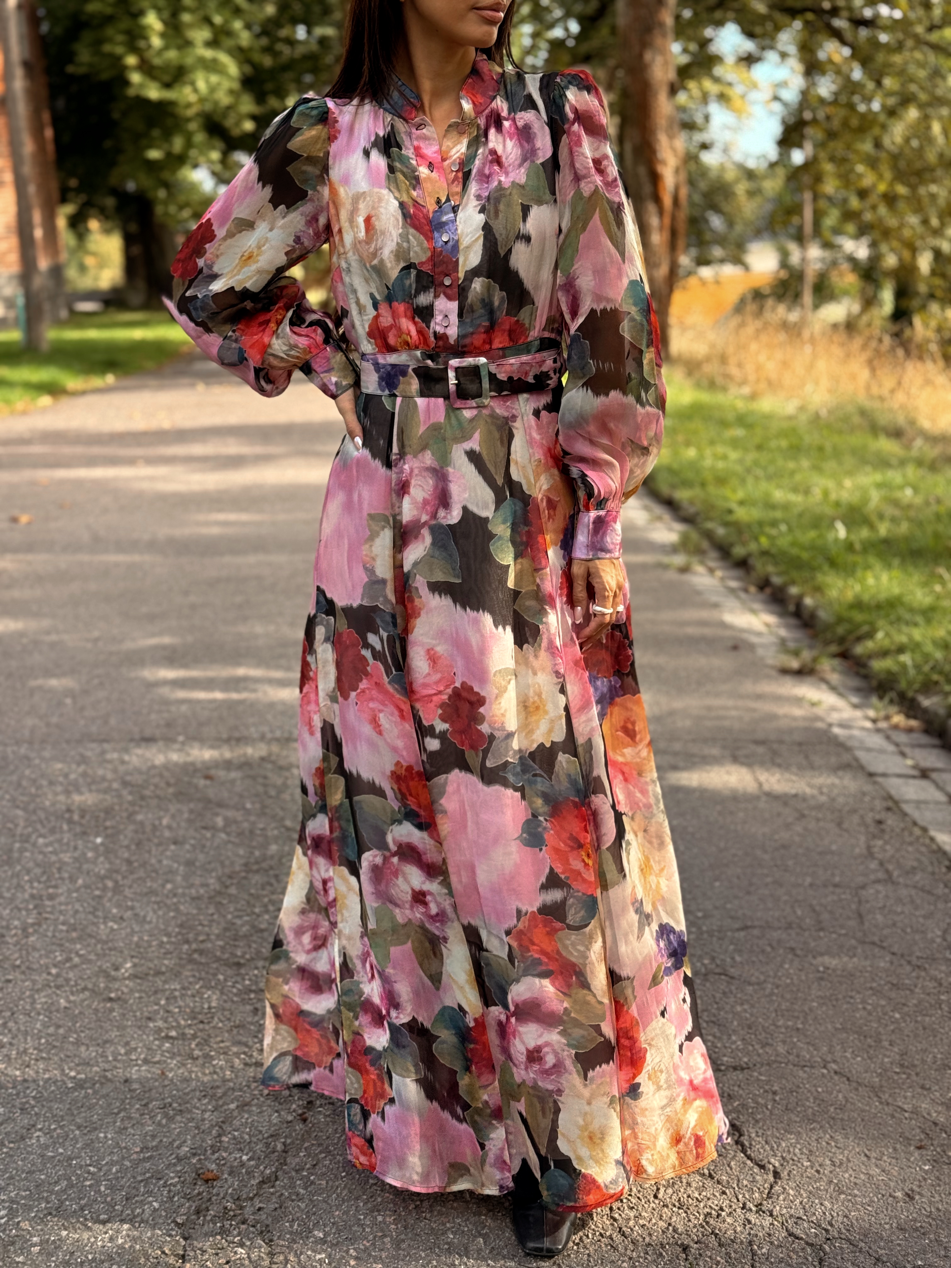"Organza Maxi Dress" fra byTiMo. Organza Maxi Dress er laget i litt gjennomsiktige, FSC-sertifiserte viskosekvalitet. Denne maxikjolen har en innsvinget midje, mandarinkrage med knapper på toppen og lange puffermer med stramme mansjetter. Kjolen har beltehemper i midjen og leveres med et løst, matchende belte.
