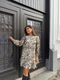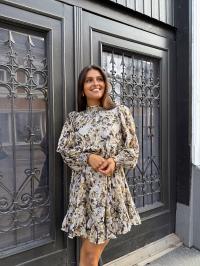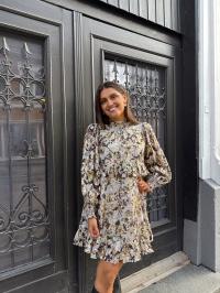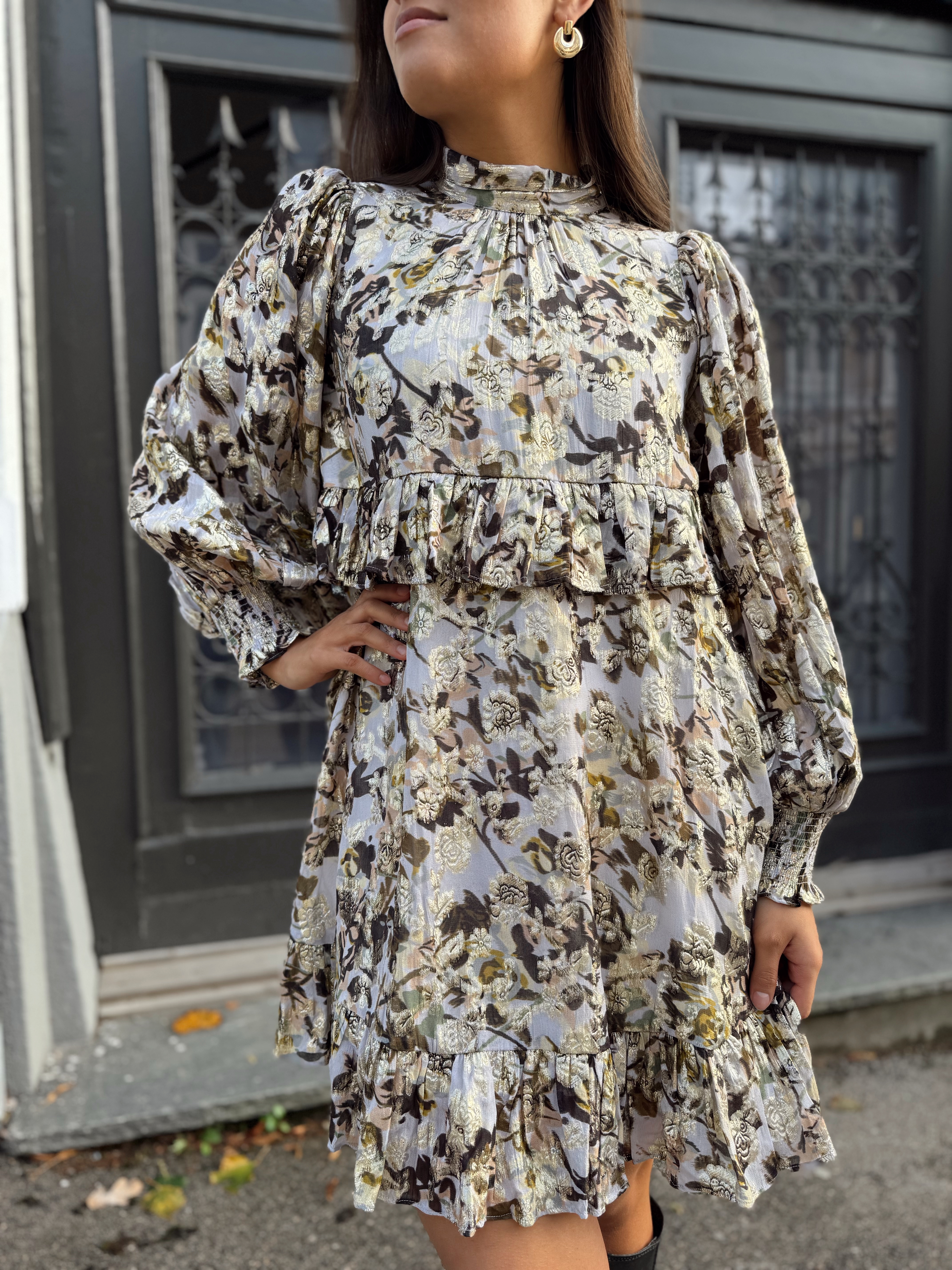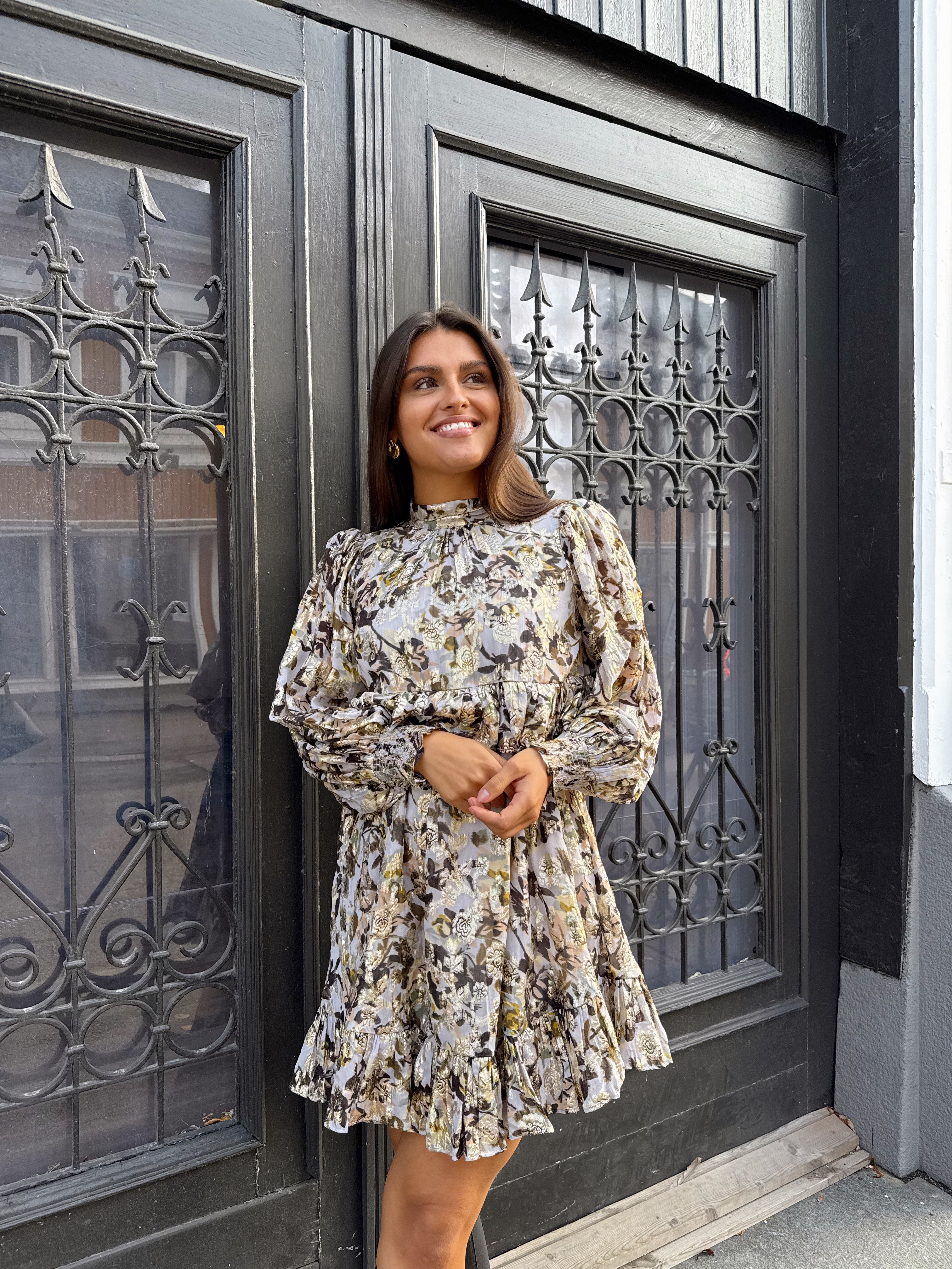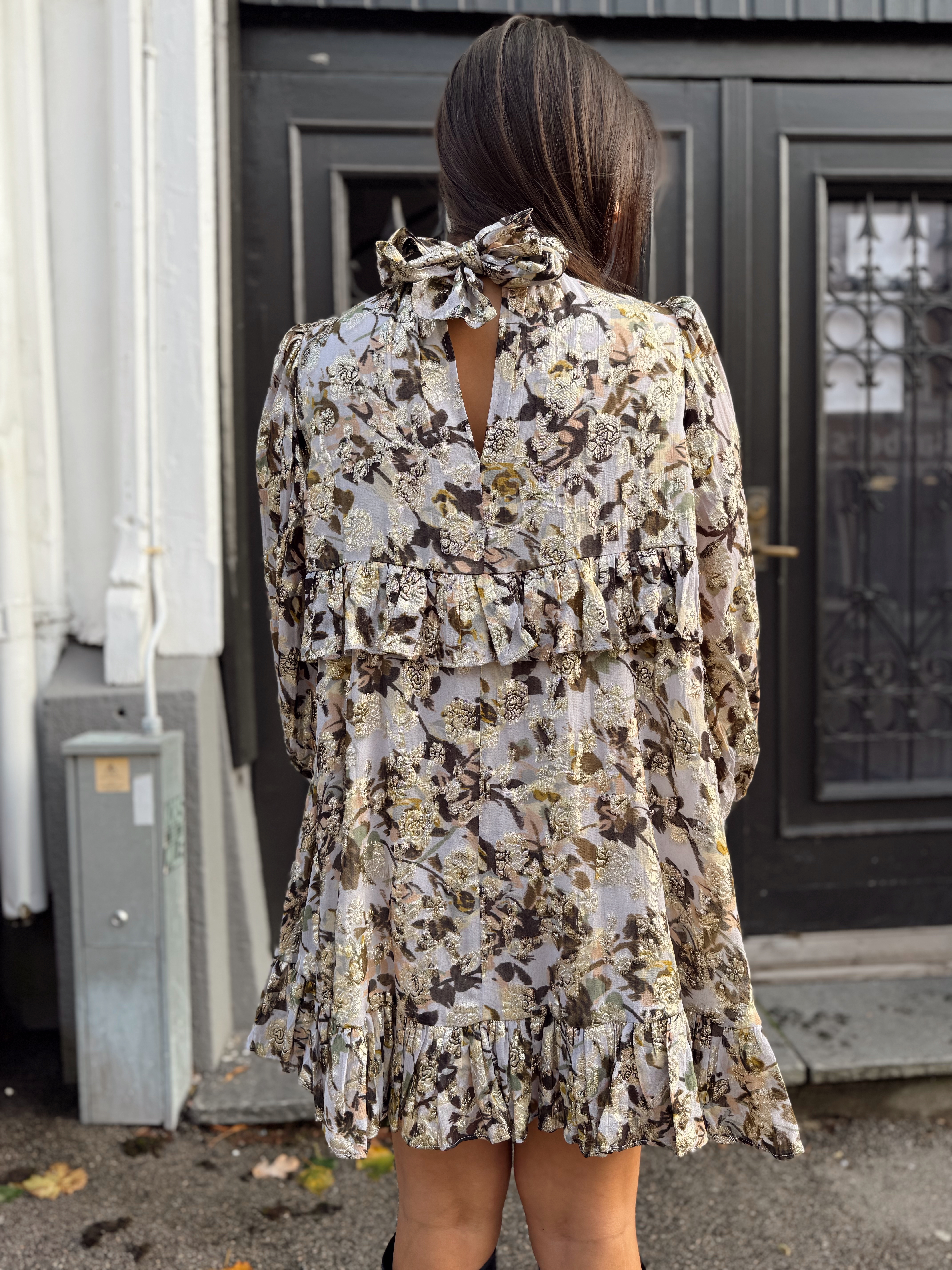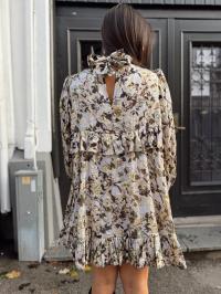 «Georgette Tieband Dress» fra byTiMo. Nydelig avslappet mini kjole kuttet i byTiMo sin lette gjennomsiktige, sertifiserte viskosekvalitet. Kjolen har aform og lange ballong ermer.