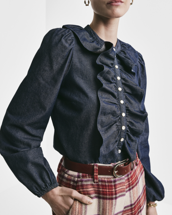 «Denim Flounce Blouse» fra byTiMo