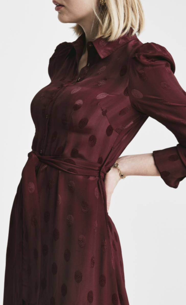 "Viscose Shirt Dress" fra byTiMo. Nydelig midi kjole med a-formet skjørt og lange ballong ermer. Kjolen har en vakker krage og et løst avtagbart belte.