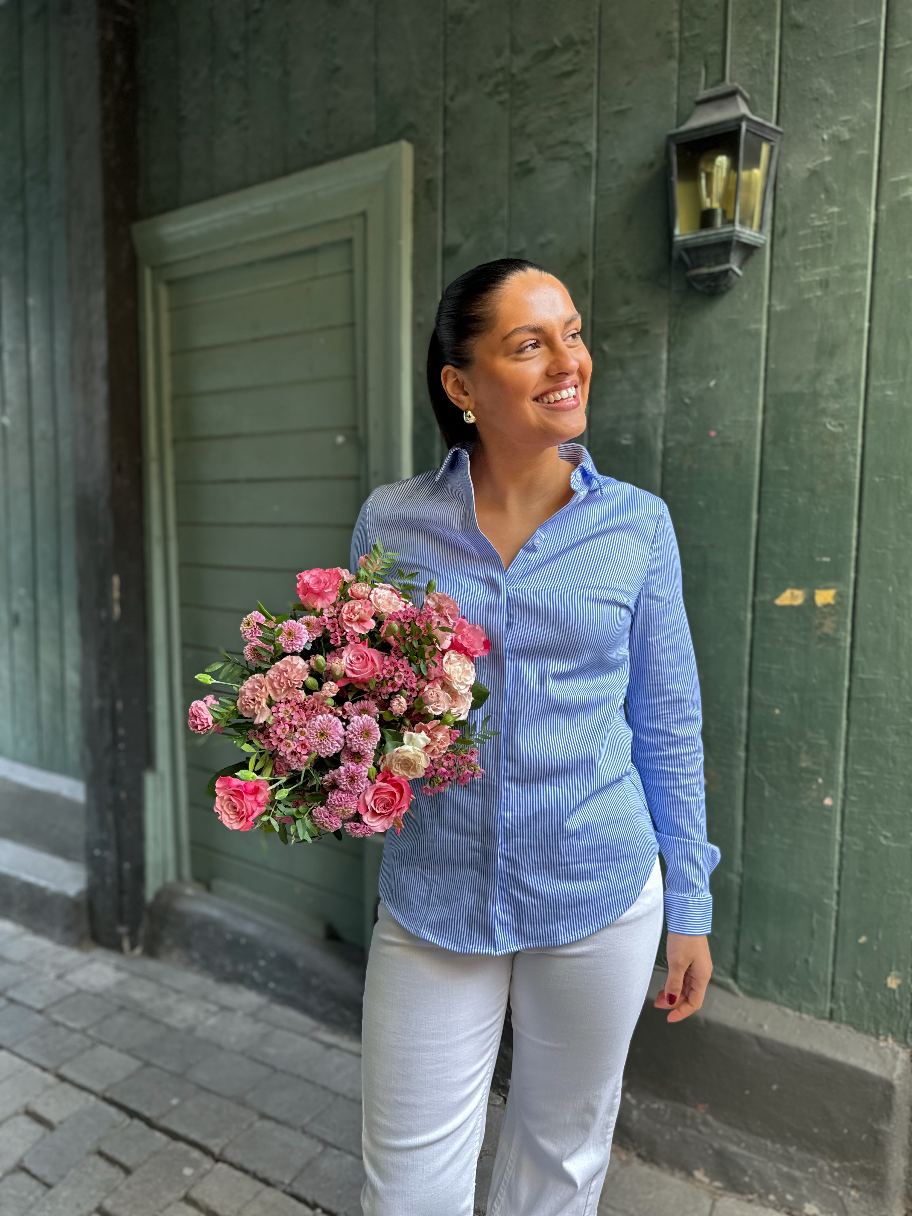 Romie Striped Fitted Shirt - Bright White/Blue er en klassisk, litt innsvinget skjorte med striper og knappelukning.