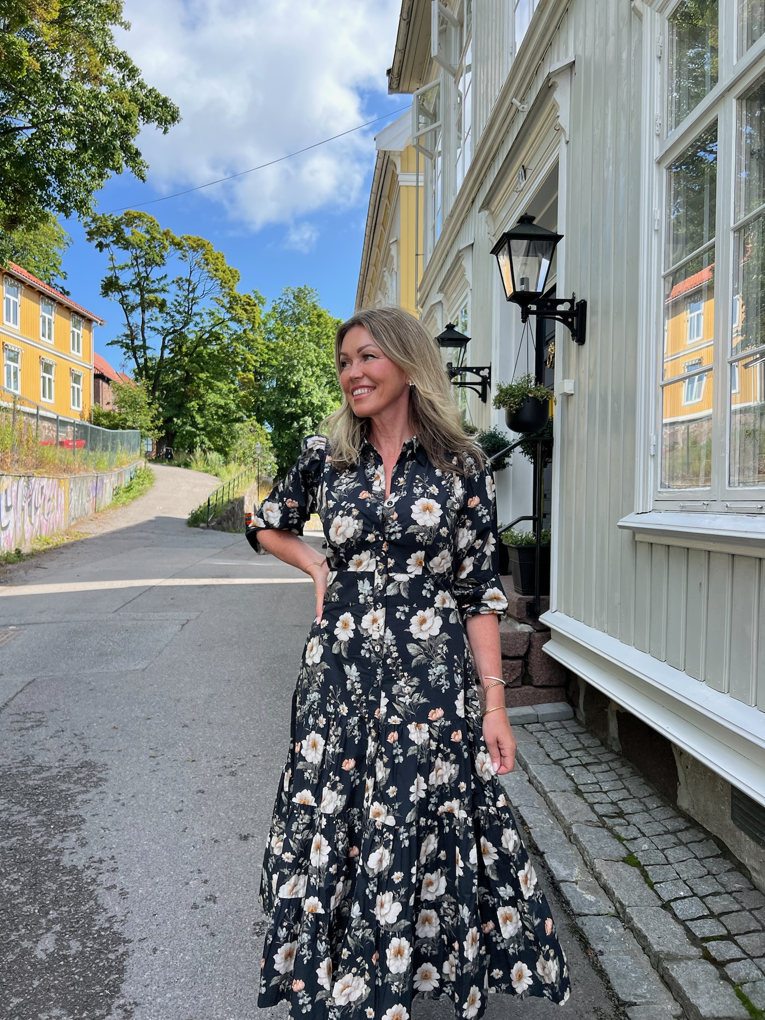 Vicky Midi Dress fra Missamaya er sydd i en lett og pustende bomullspoplin, og kombinerer tidløs stil med komfort. Den har en midi-lengde, innsvinget midje og et langt, A-formet skjørt som faller flatterende. Lange, puffede ermer og en klassisk skjortekrage gir kjolen et elegant uttrykk, mens knappelukkingen i front tilfører et stilrent preg.