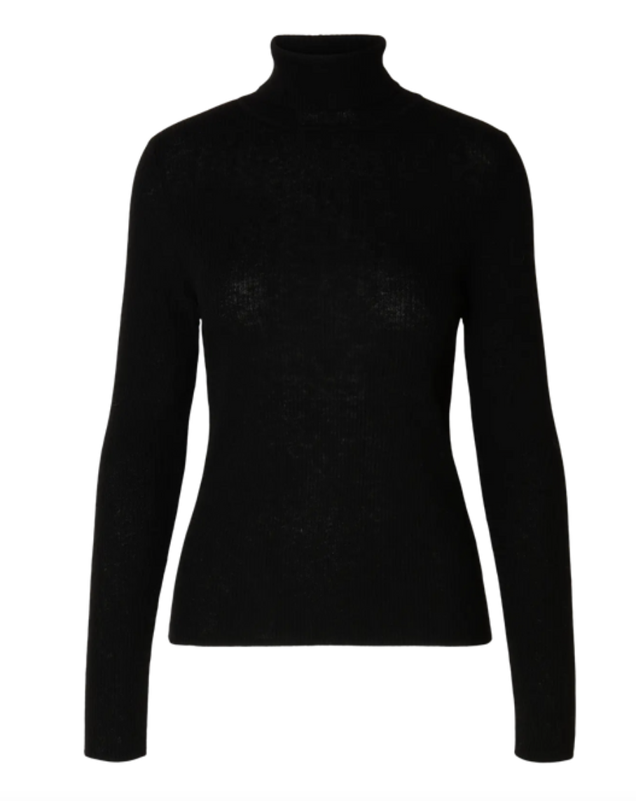 "Ingrid Knit Wool Roll neck" fra Selected Femme. En nydelig topp med høy hals, superfin basic som enhver bør ha i garderoben. Ingrid knit er en enkel ribbestrikket genser, med tett passform og høy hals.
