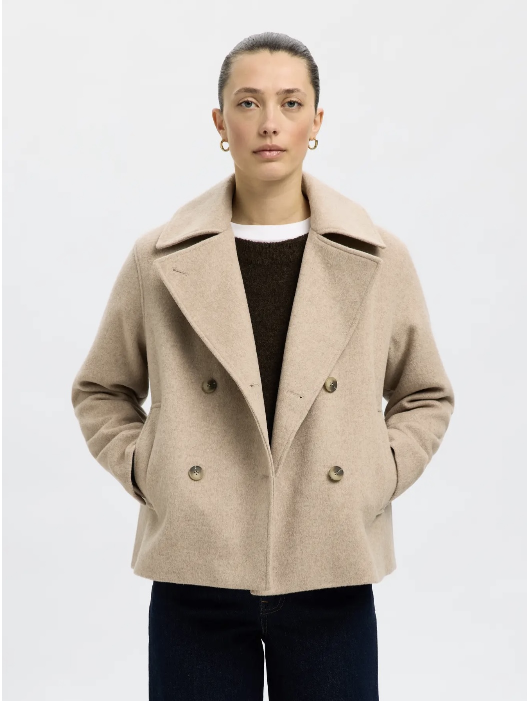 «Alma short wool blend jacket» Selected Femme. Klassisk kort ullkåpe i rett fasong med knappelukking og stikklommer.