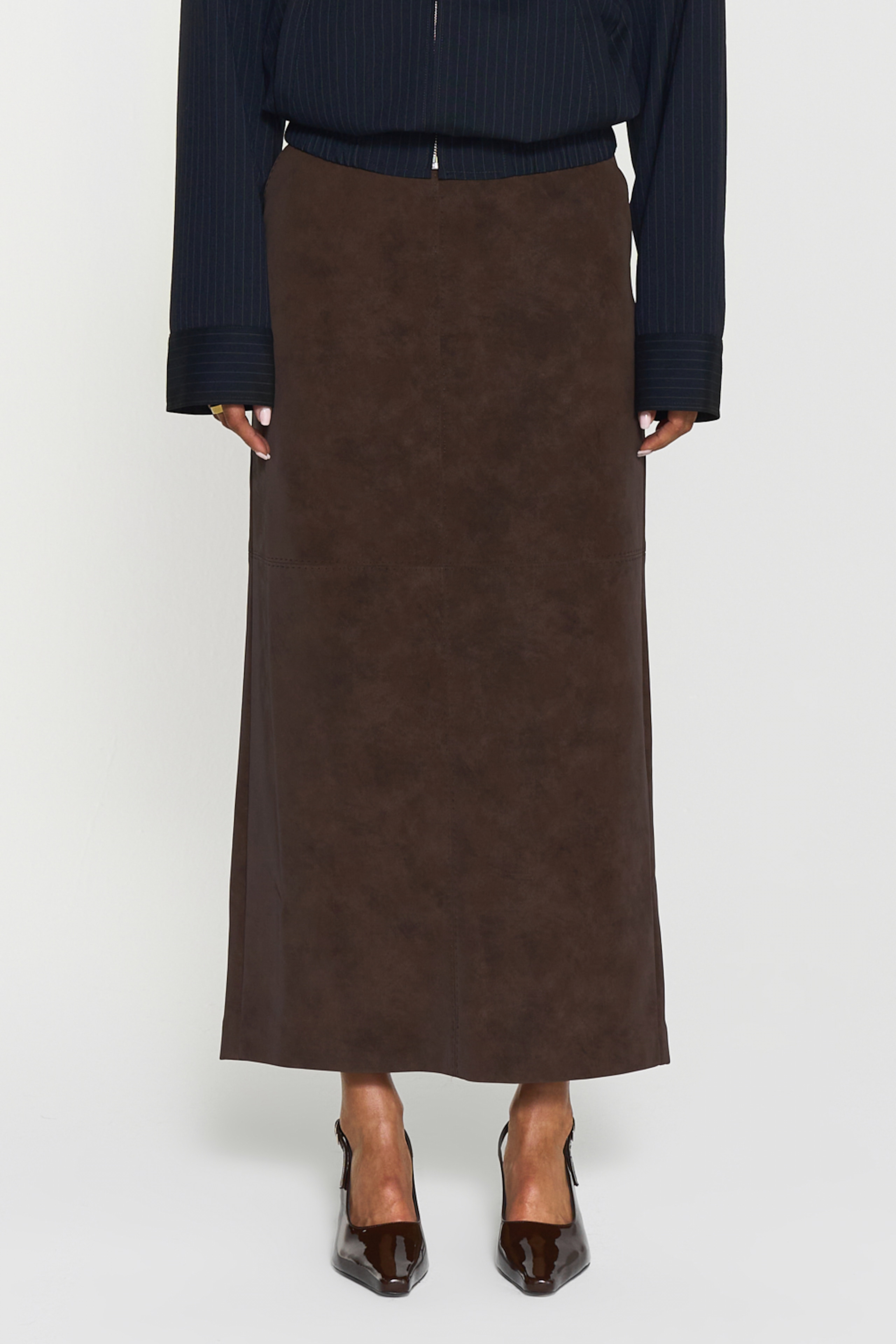 "Yara Faux Suede" fra Twist&Tango. Vi introduserer Yara-skjørtet: Et elegant skjørt med rett fasong, laget av bio-basert imitert skinn. Det har midi-lengde, skjult glidelåslukking, splitt bak og dekorative sømmer.