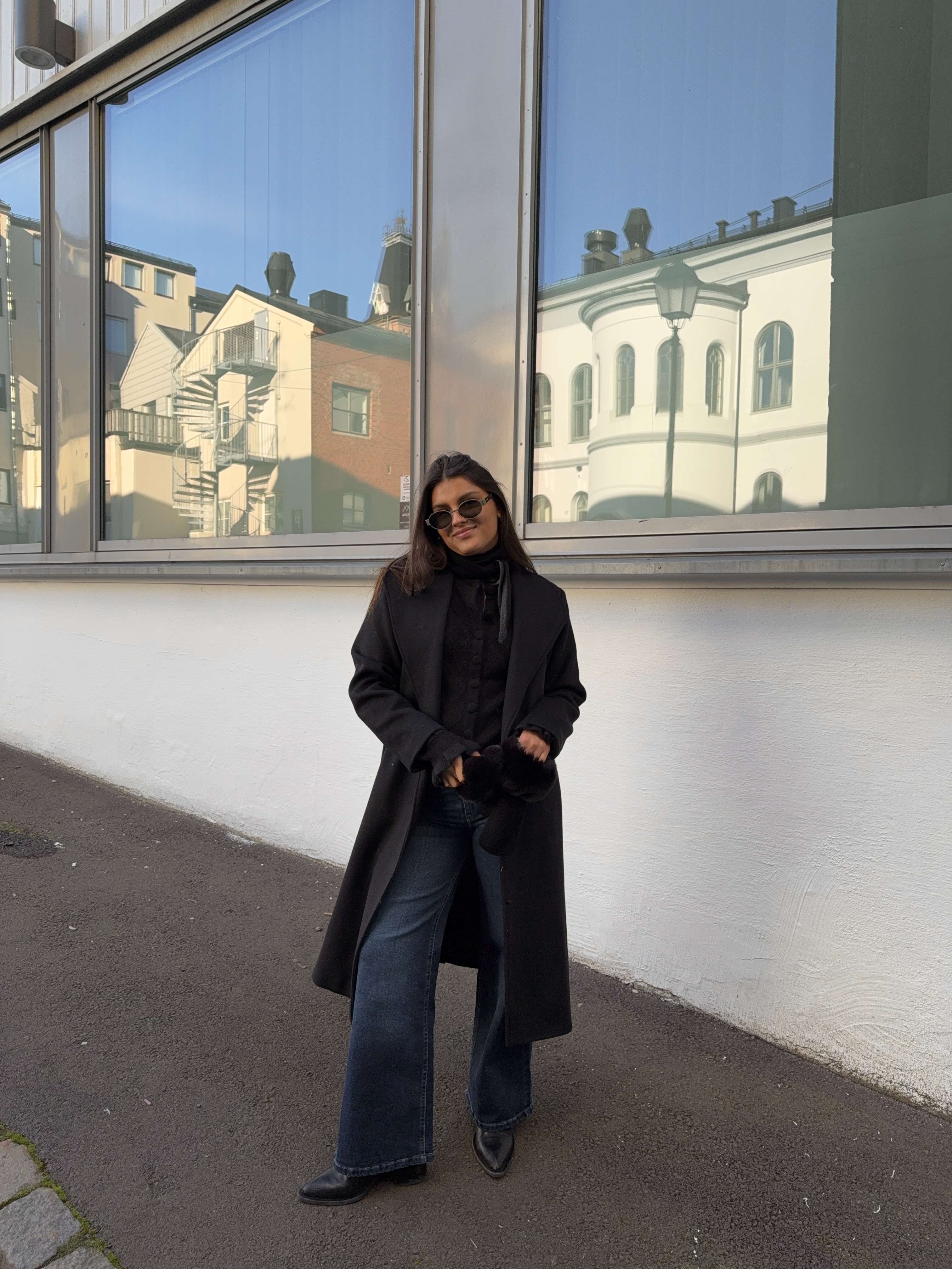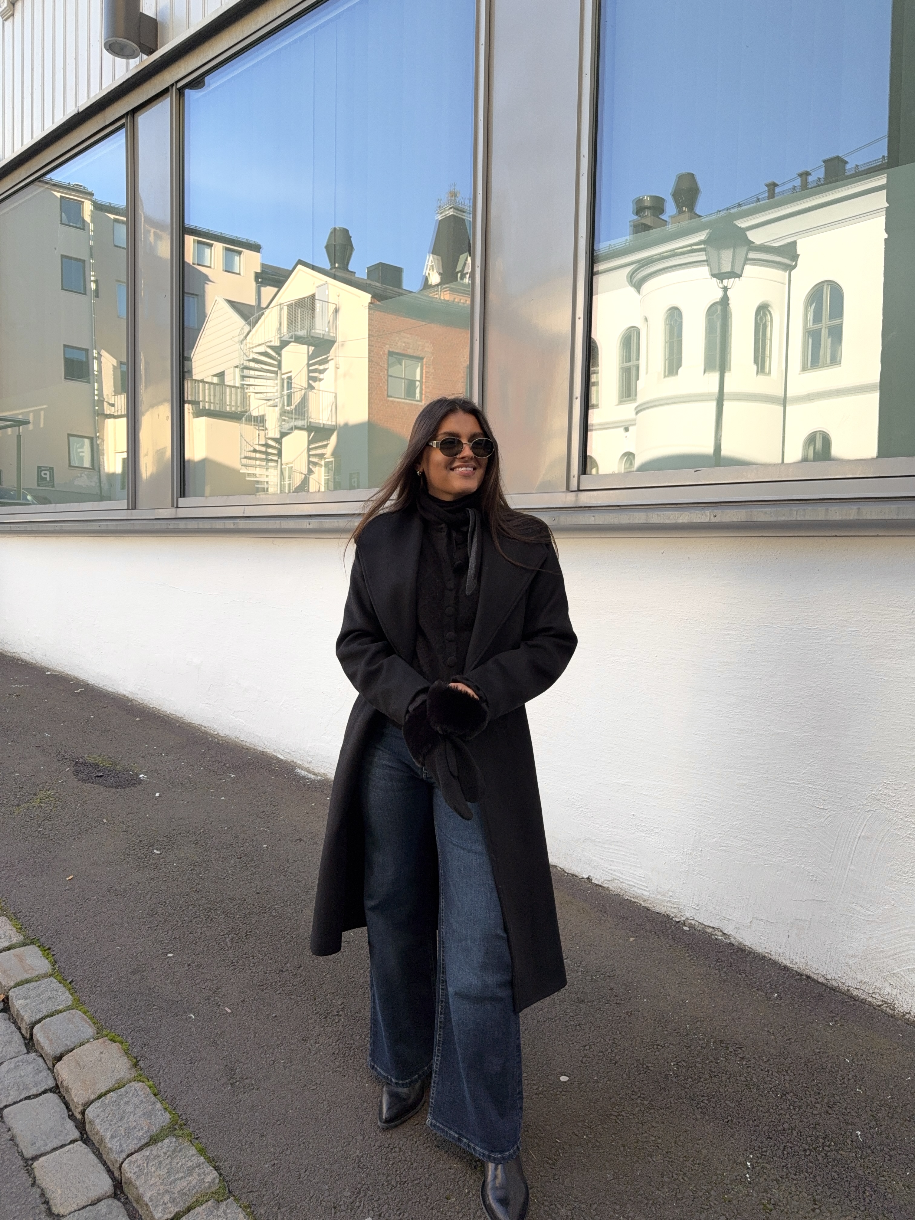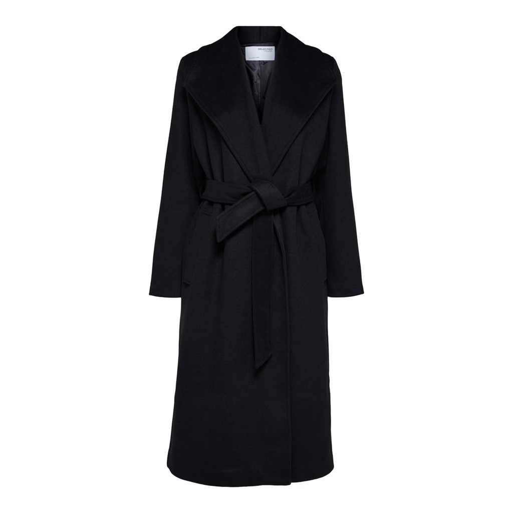 "Rosa Wool Blend Coat" fra Selected Femme. Rosa Wool Coat fra Selected Femme. Denne enkle, men likevel elegante ullfrakken er alt annet enn basic. Den har en åpen front og et knytebelte, som du kan stramme for å beskytte deg mot kulden og skape en flatterende silhuett. De innskårede jakkeslagene er stjernen på denne frakken og gir et moderne preg, og de passpolerte sidelommene fullfører looken