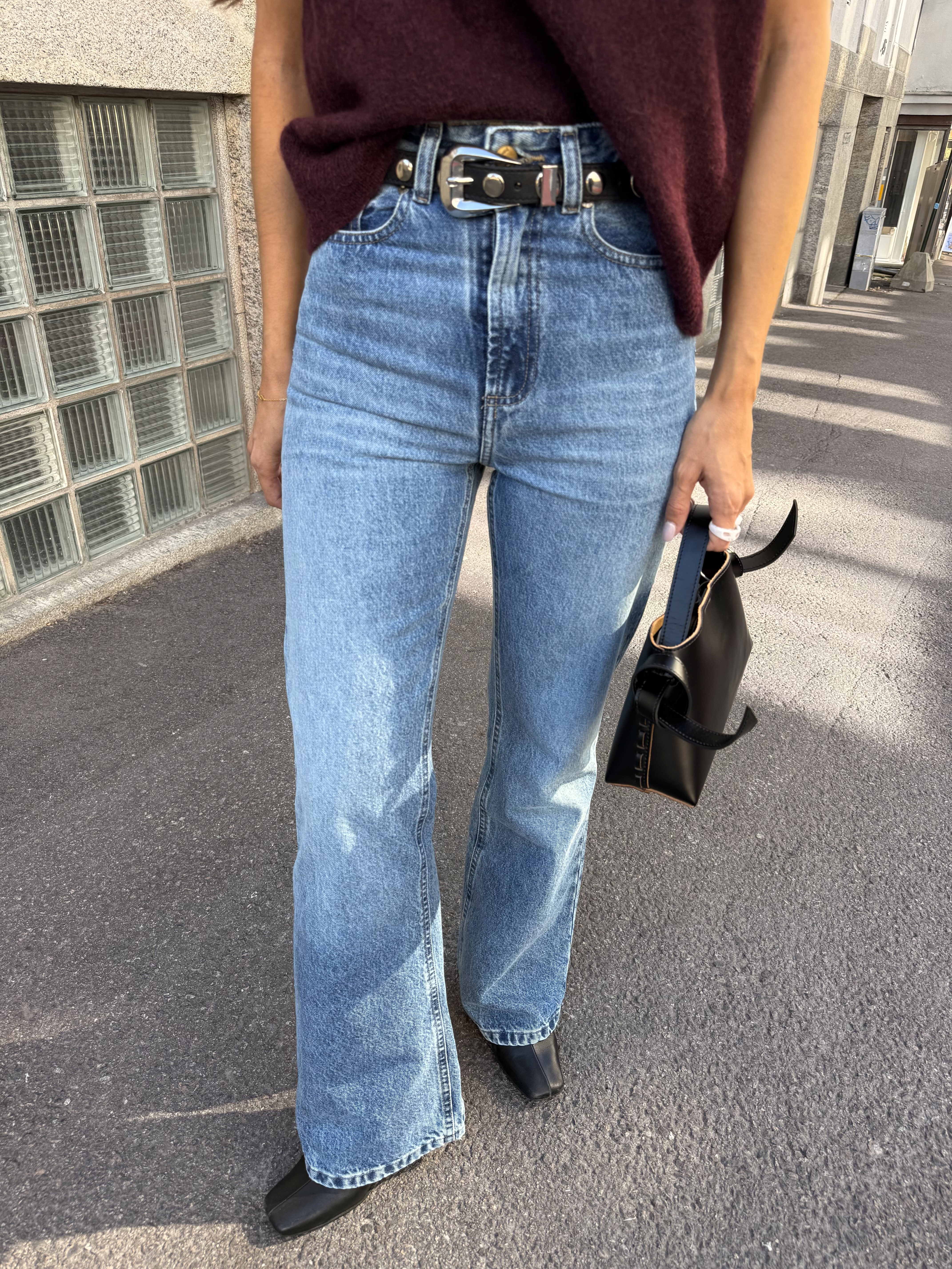 Denne jeansmodellen har høyt liv, vide bein og ingen stretch.