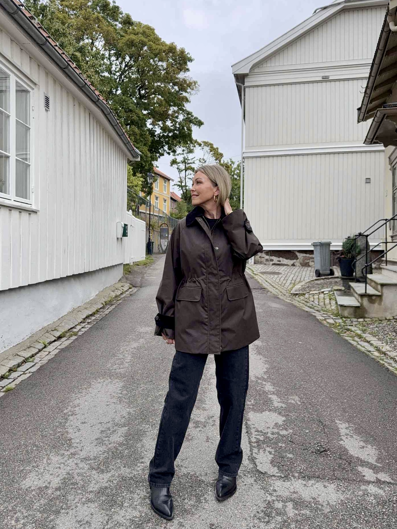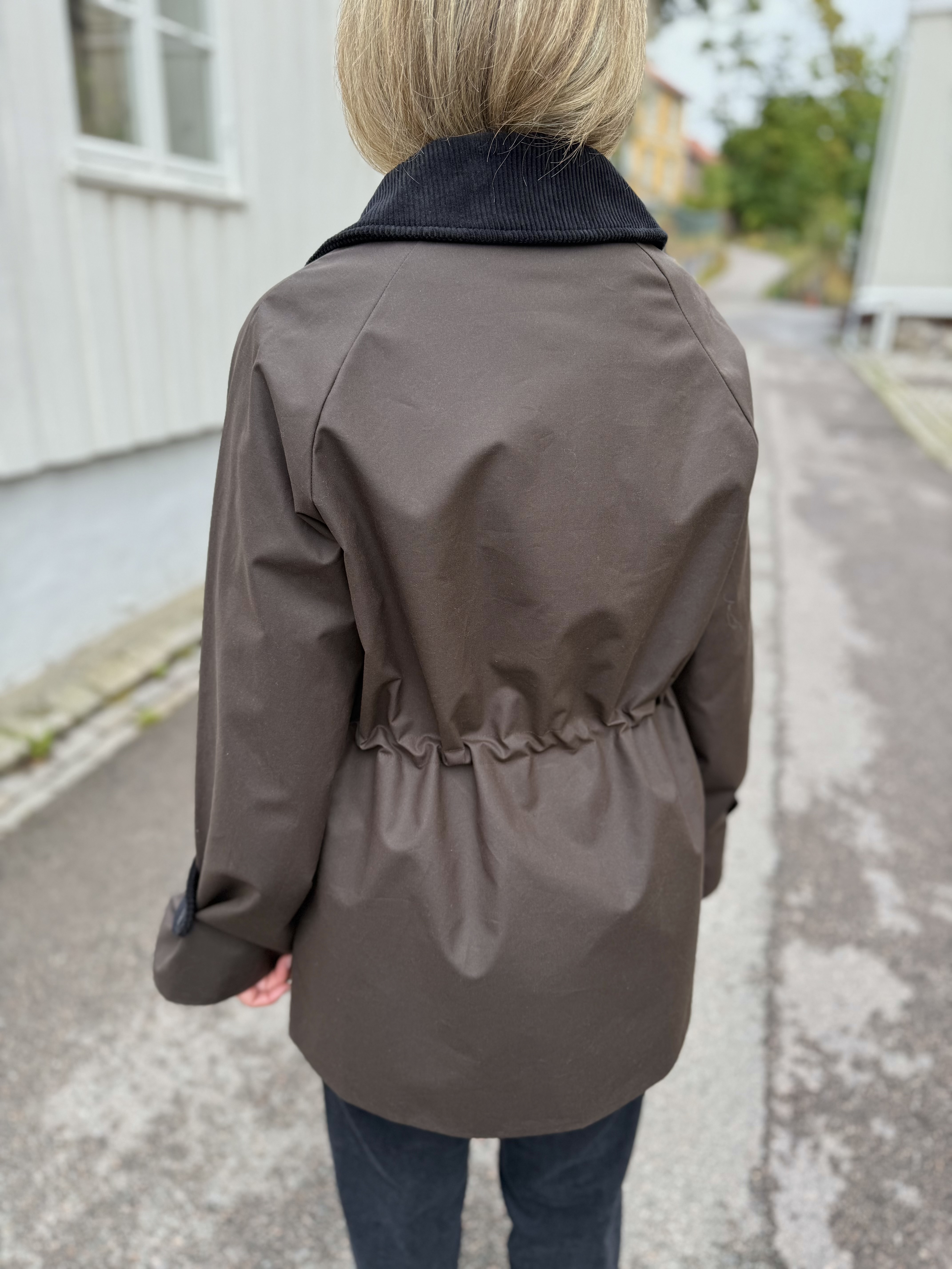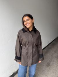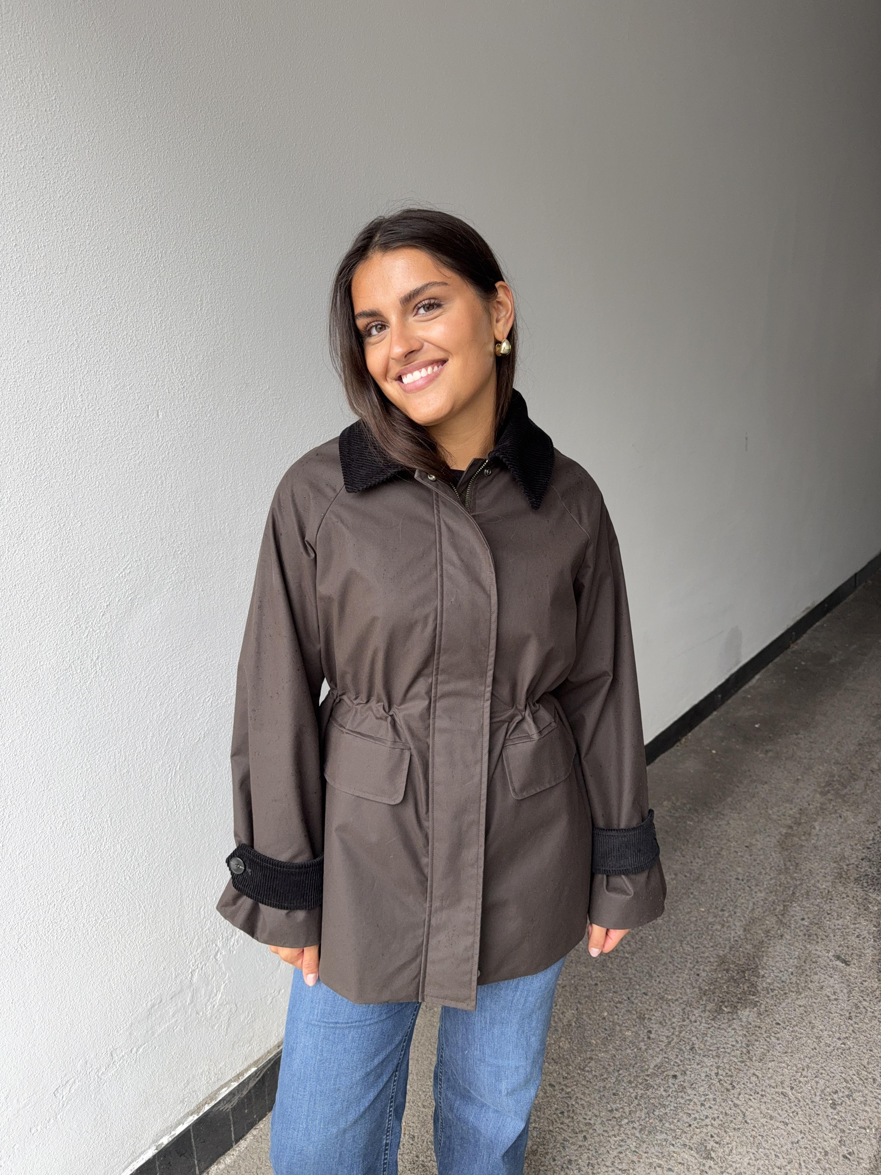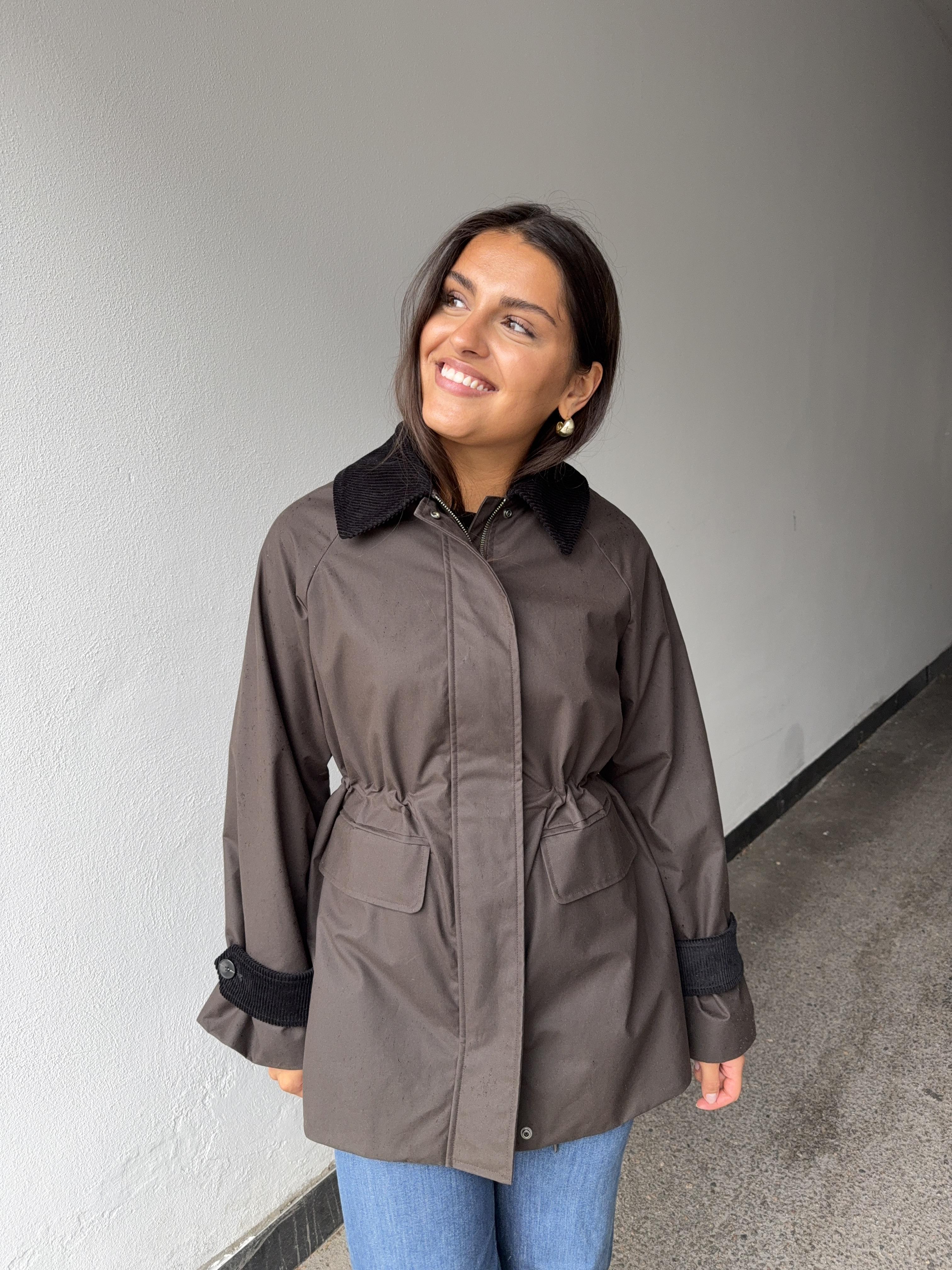 «Wilma Jacket» Fra Selected Femme. Stilig jakke med oilskin overflate som kombinerer stil og komfort. Den har spiss krage og lange ledige ermer med hempe og to knapper på mansjetten. Kragen og hempen på mansjetten er i myk kordfløyel. To lommer nederst på front med klaff. Jakken lukkes med glidelås og skjulte knapper. Mykt og skimrende fòr.