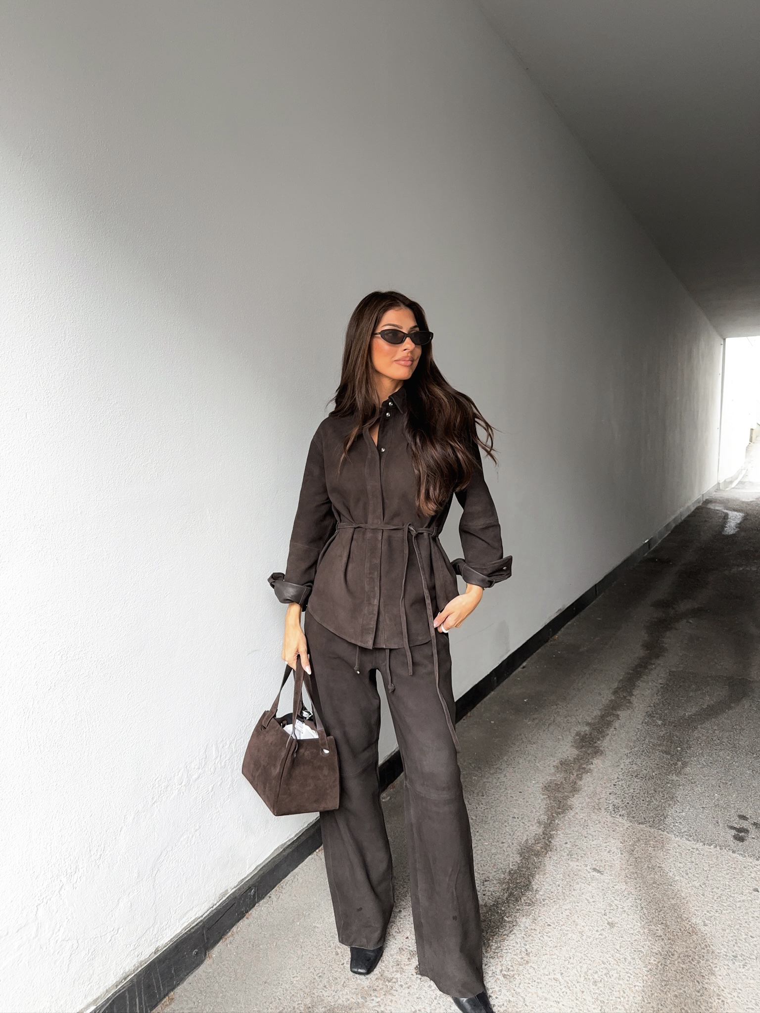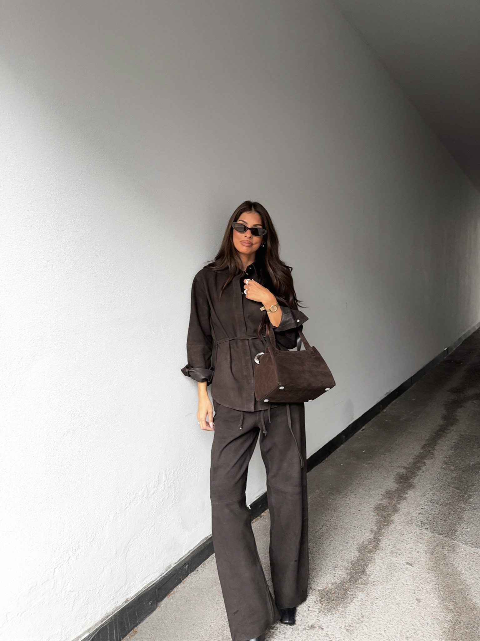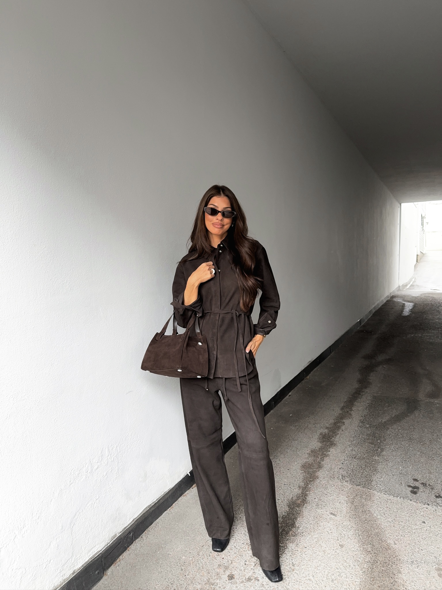 "Fia Suede Pants" fra Selected Femme. Kule semsket skinn bukser med normal passform. Buksen har knyting i midjen.