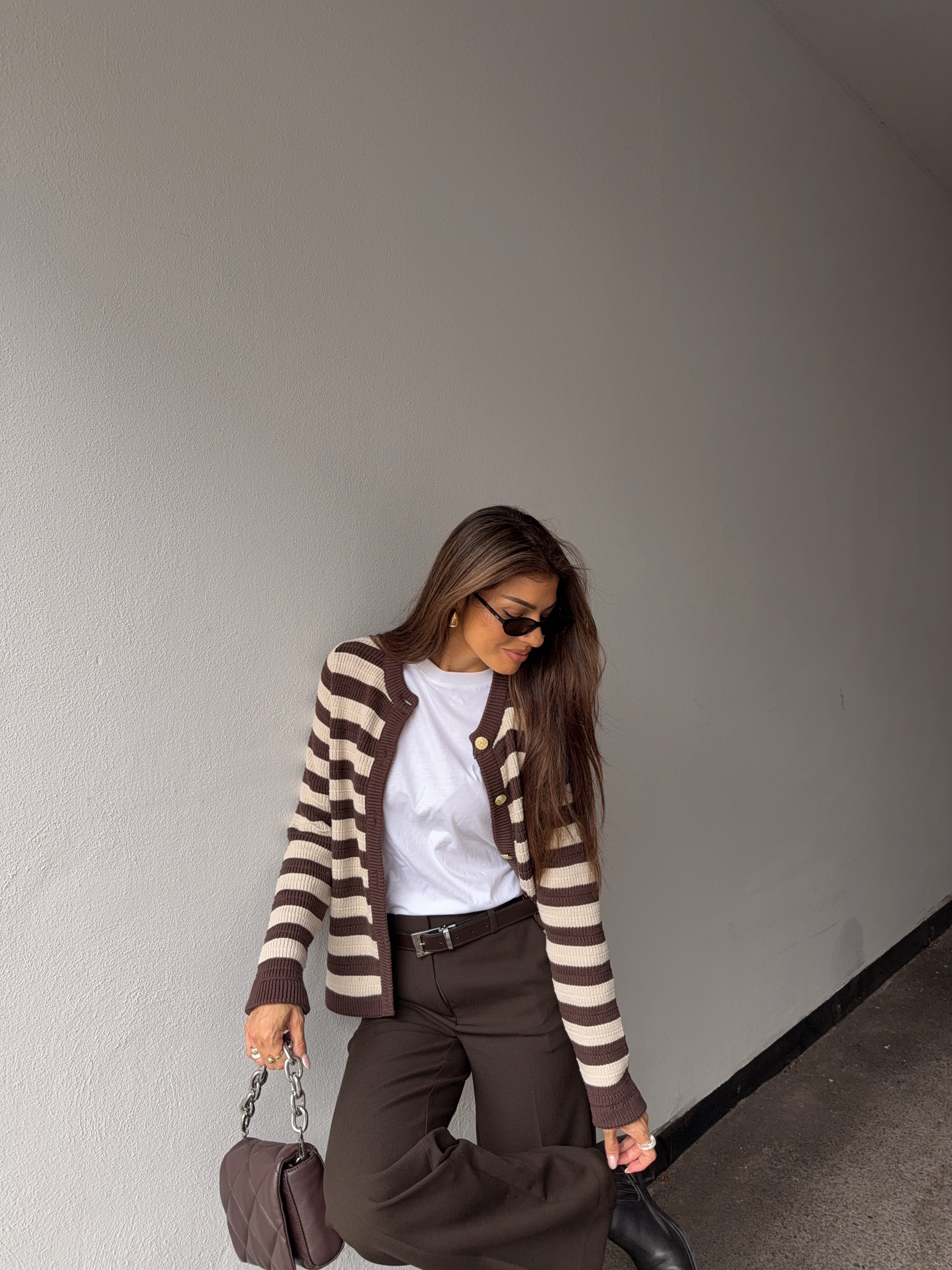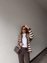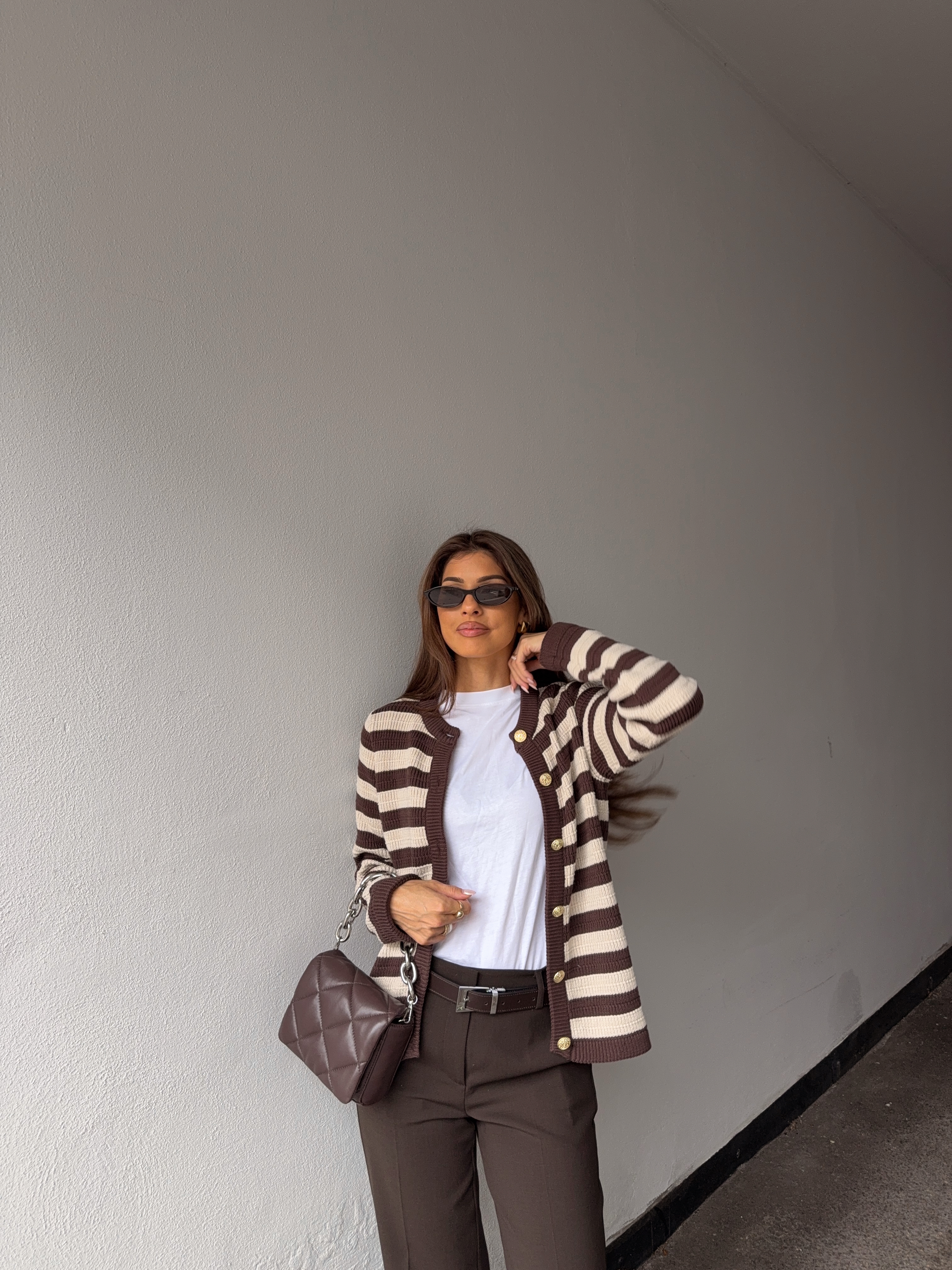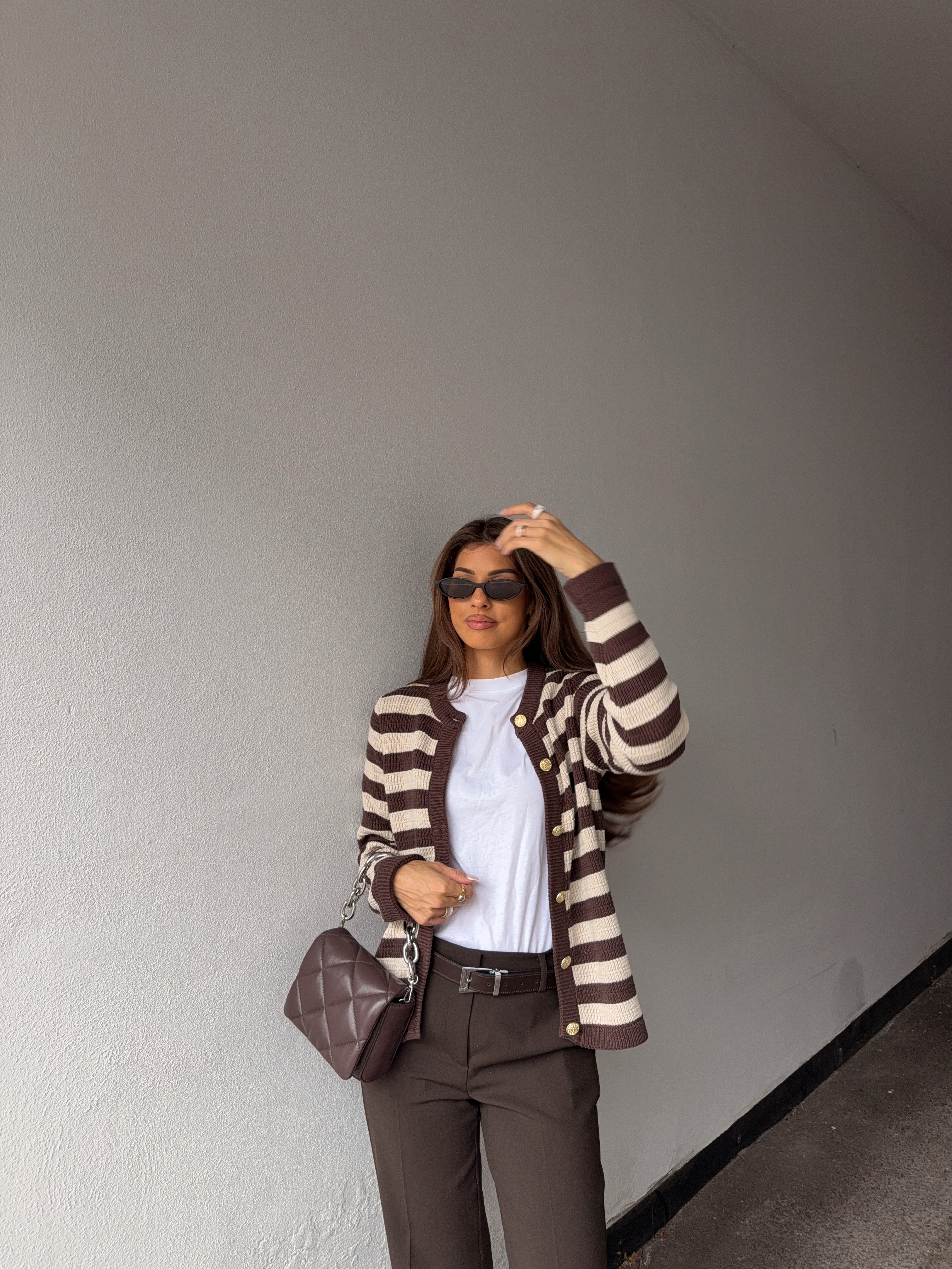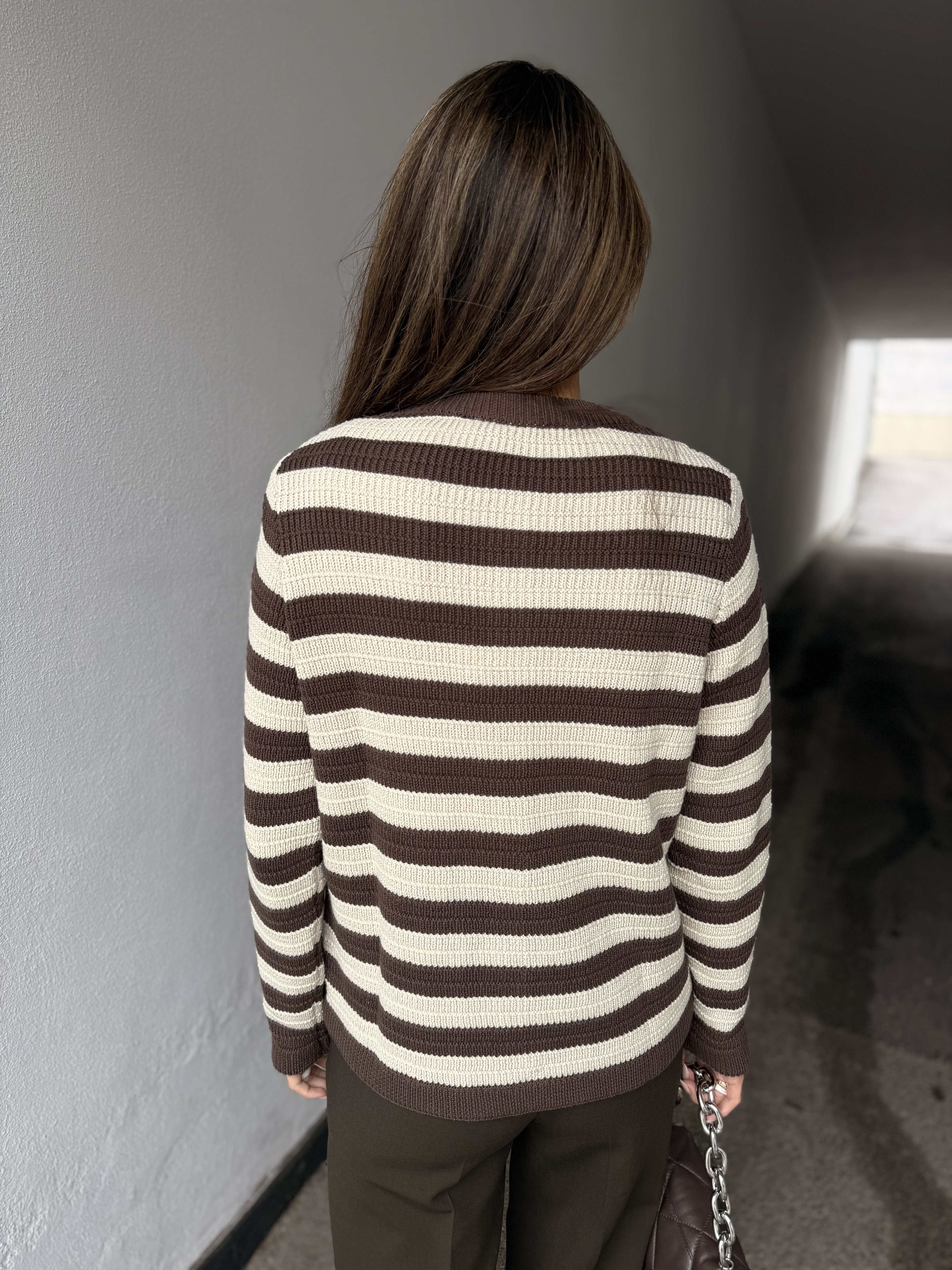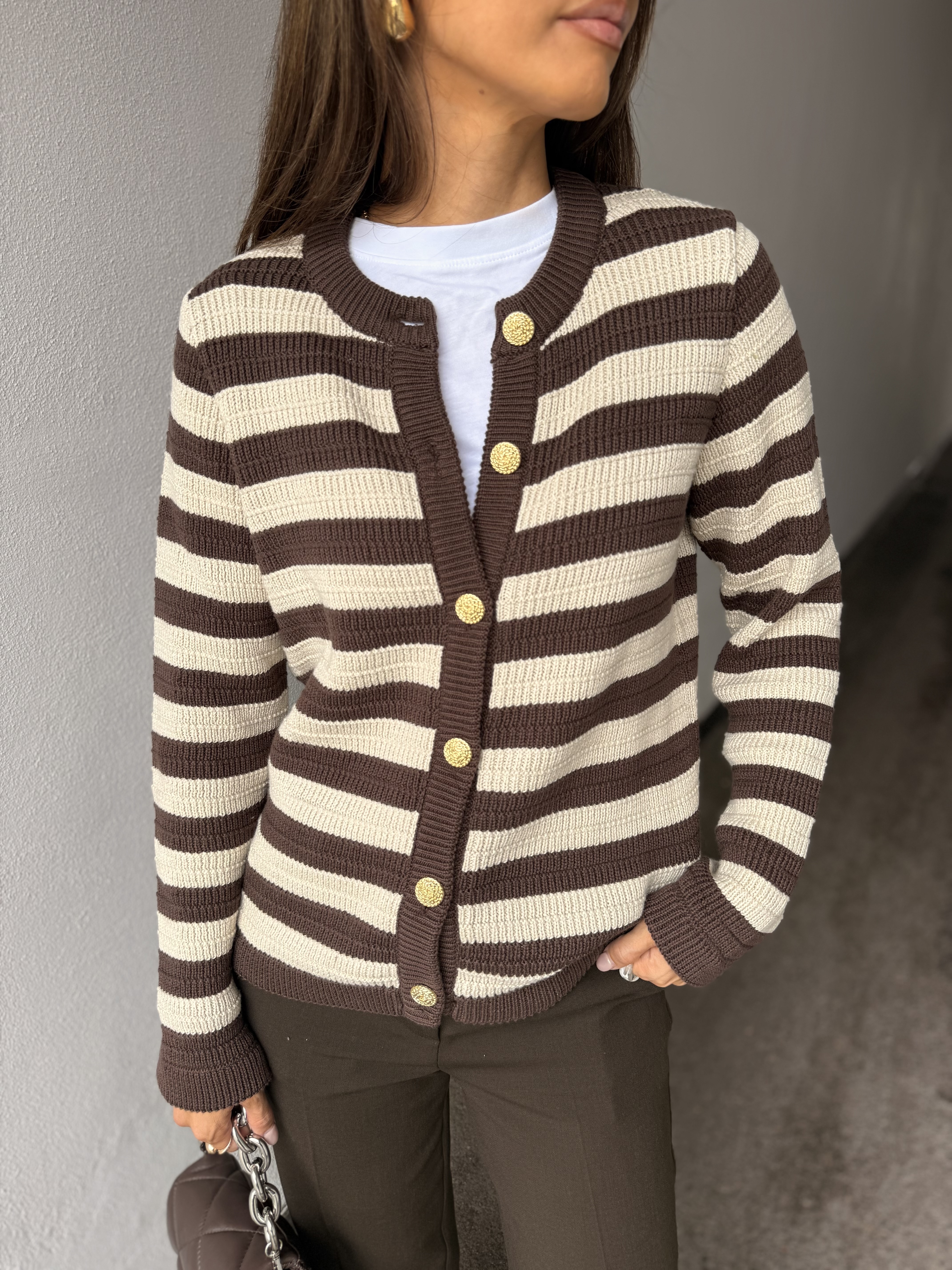 Yassironi Ls Knit Cardigan fra Y.A.S. Stripete cardigan i myk bomullsblanding fra Y.A.S. Yassironi kommer i en klassisk sort og beige palett med horisontale striper og dekorative gullknapper i front. Den har rund hals, ribbestrikkede mansjetter og en rett passform som gjør den enkel å style både til hverdags og pent. Den pustende kvaliteten gjør den perfekt året rundt.