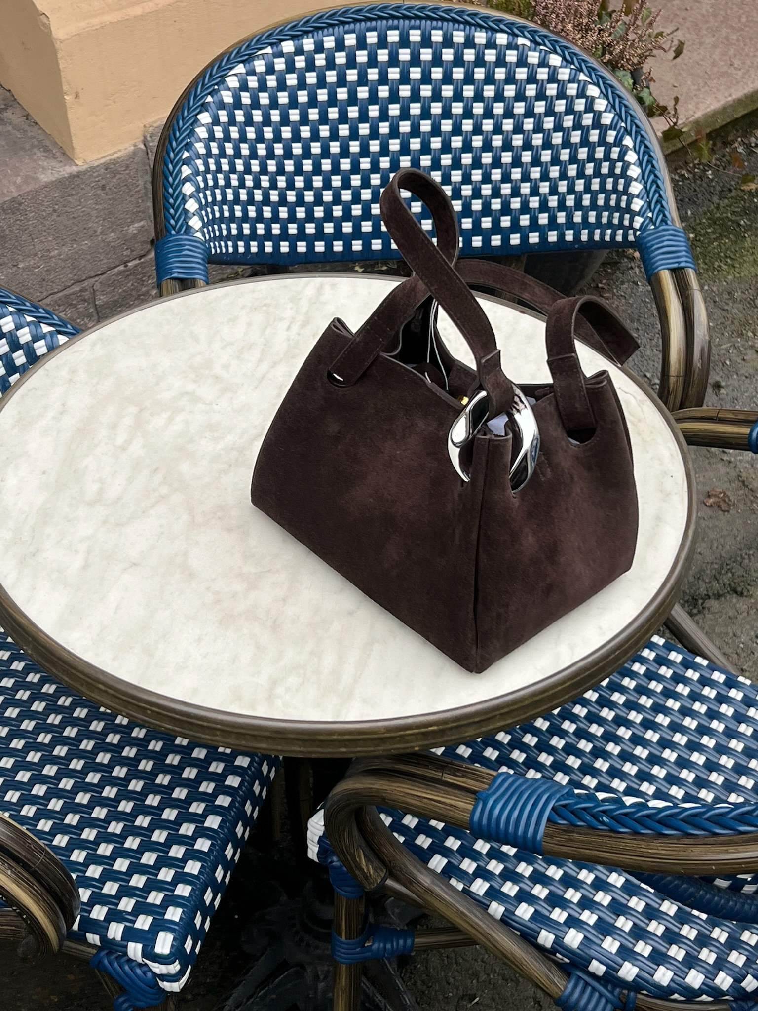 "Zina Bag" fra Mocha Brown. Zina-vesken er laget av 100 % semsket skinn, har en matchende innvendig veske, magnetisk trykknapplukking, elegant sølvutsmykning, diskret logodetalj og en avtakbar skulderstropp.