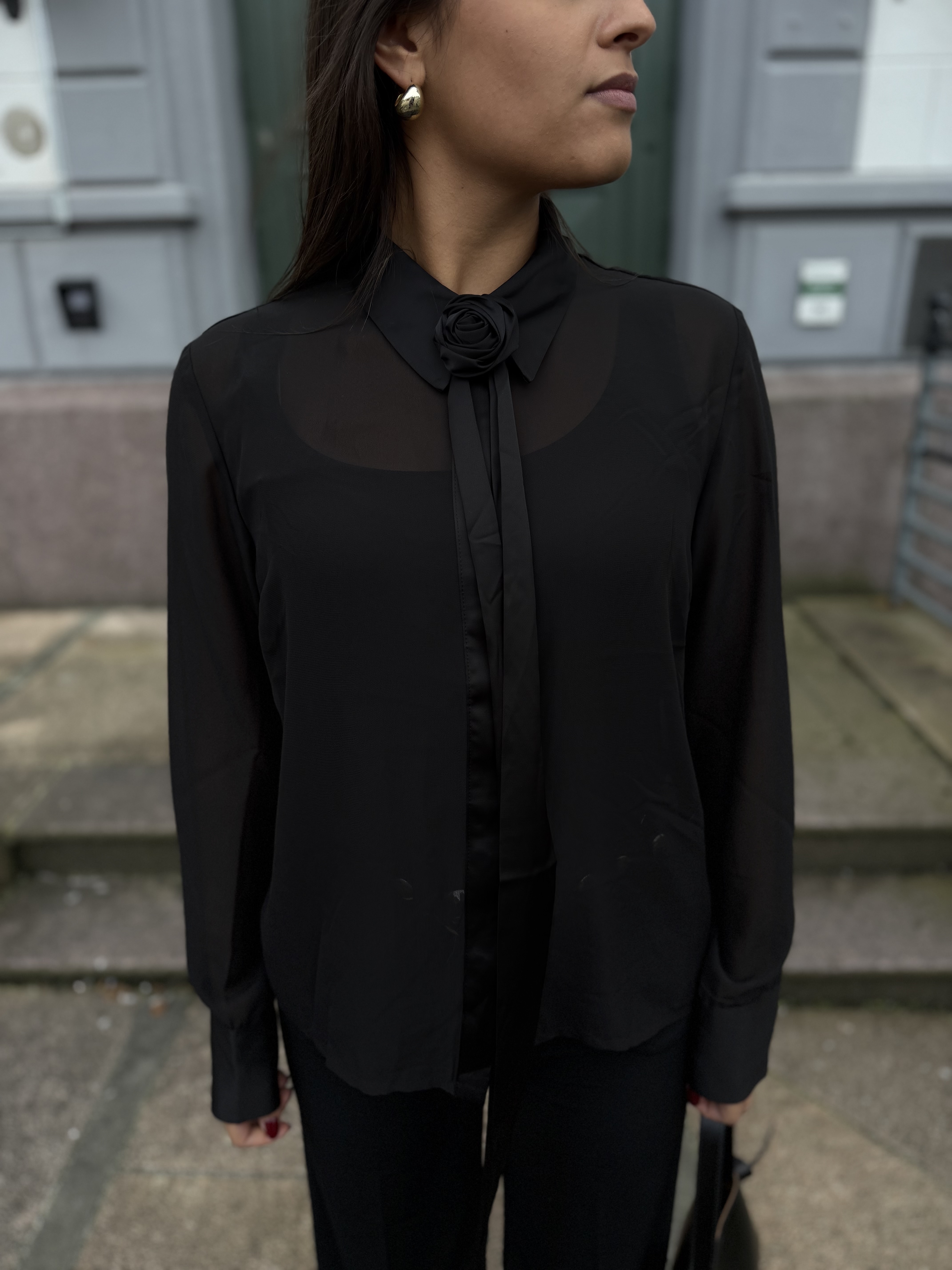«Lynne Shirt» fra Gestuz er en rålekker skjorte med en nydelig rose detalj med slør ved halsen. Lukkes med knapper. Litt gjennomsiktig i stoffet.