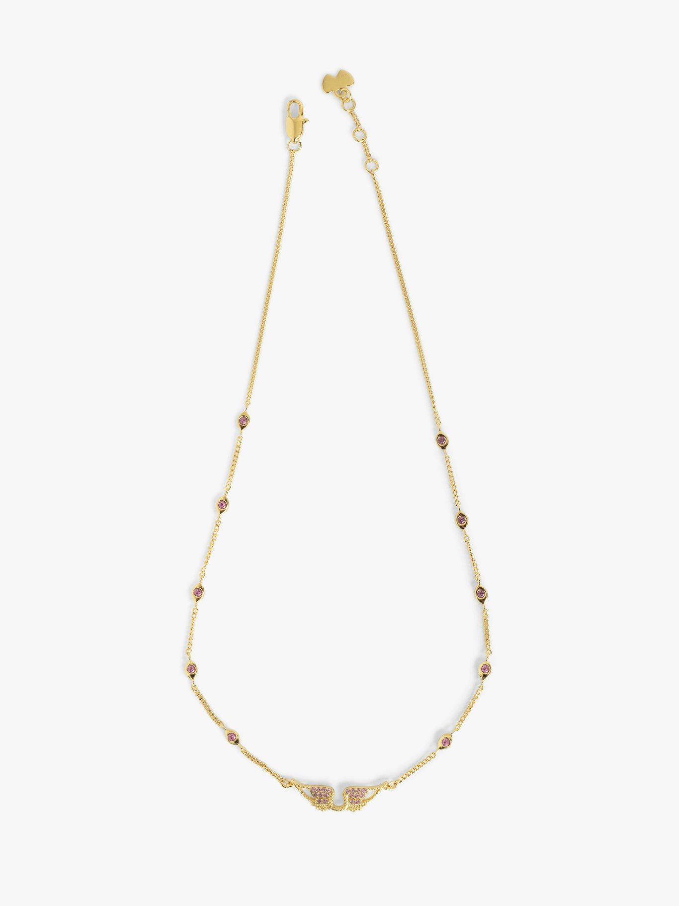 "Rock Necklace" fra Zadig&Voltaire. Dette skinnende smykket for kvinner er pyntet med signatur metallvinger og rosa krystaller. Smykket har et justerbart ZV-merket lås. Smykkets lengde er 35–37 cm, og den er laget av 100% messing.