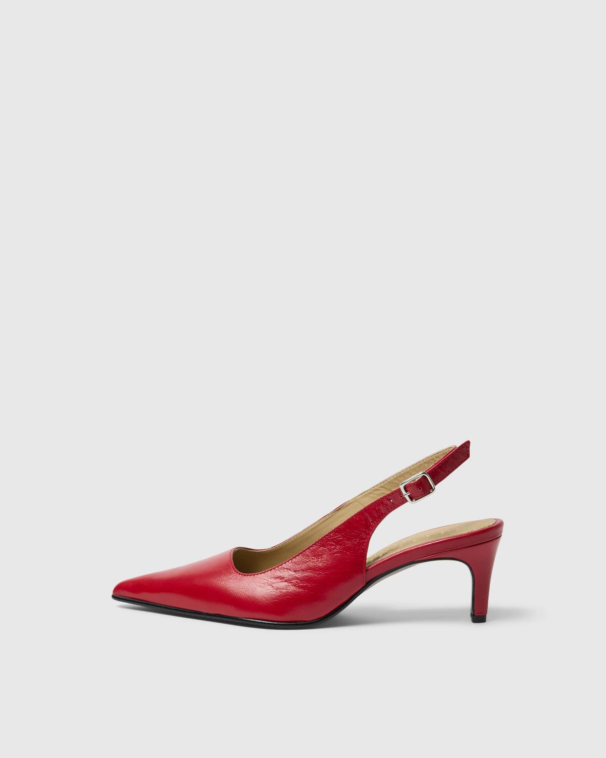 "Isla Leather Pointy Slingback" fra Selected Femme. Dette er elegante slingback-sko laget av høykvalitets skinn, perfekt for formelle anledninger. Den spisse tåen og den lave hælen gir et sofistikert preg, mens den justerbare spennedetaljen sikrer en komfortabel passform.