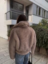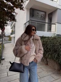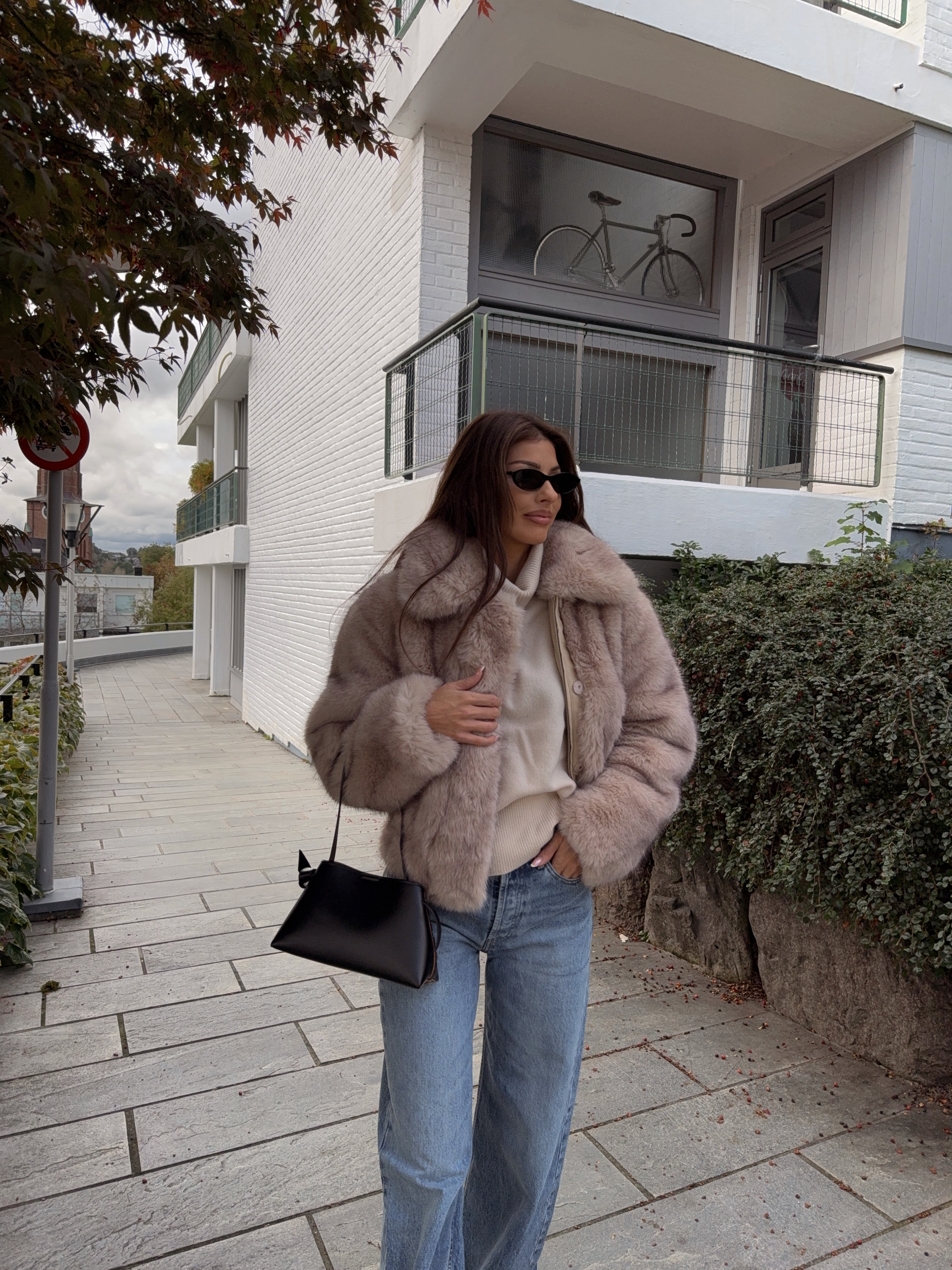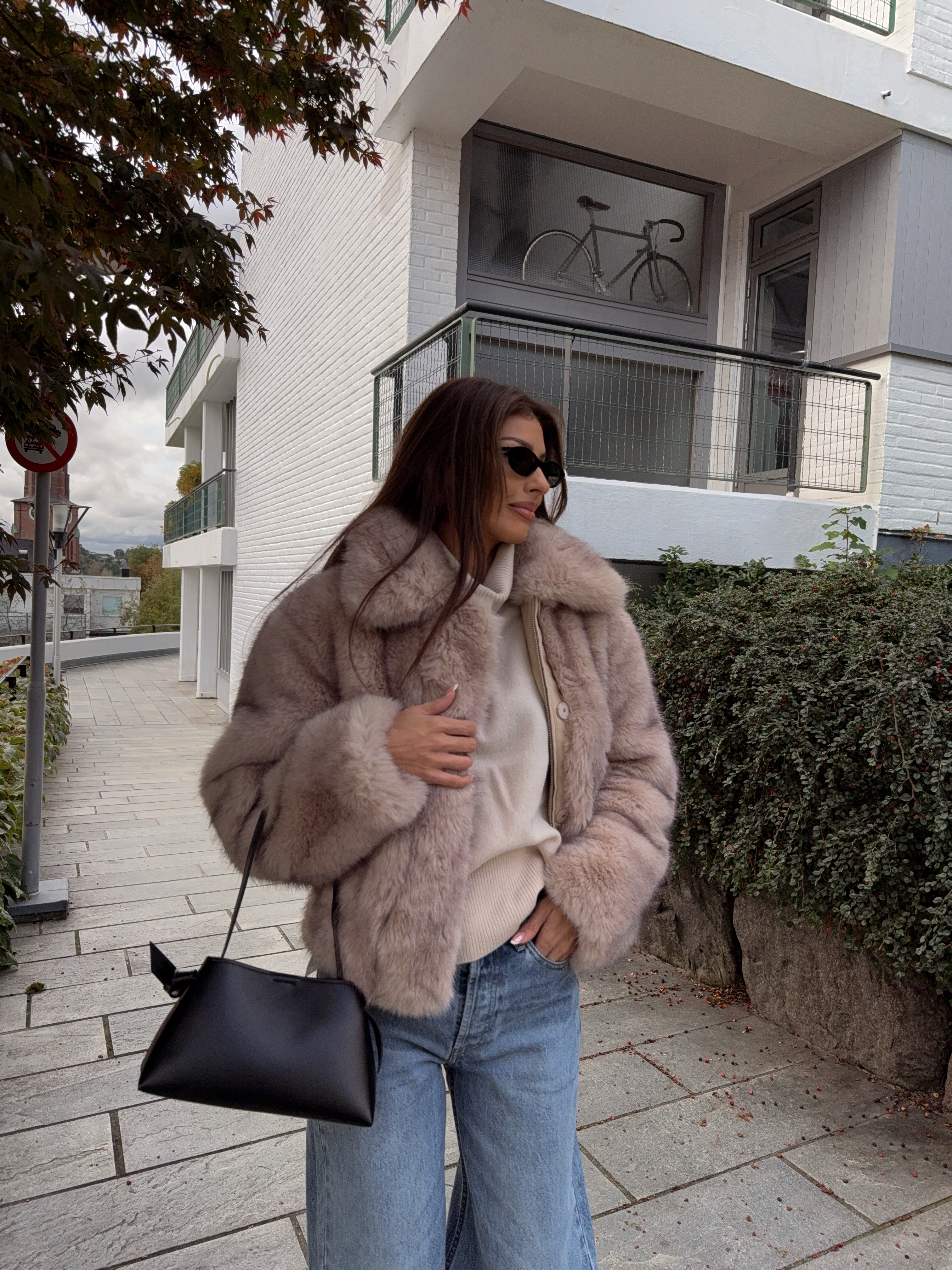 "Lena Jacket" fra Stand Studio. Superkul, cropped myk faux fur jakke fra Stand Studio - en av våre favoritter denne sesongen! Lena Jacket har lange, rette ermer og boxy, oversized passform. Jakken har stor krage som beskytter mot kald vind, skjulte knapper og glidelås foran. Lena Jacket har store, gode lommer og elastisk kant nederst som holder deg varm hele vinterhalvåret.