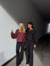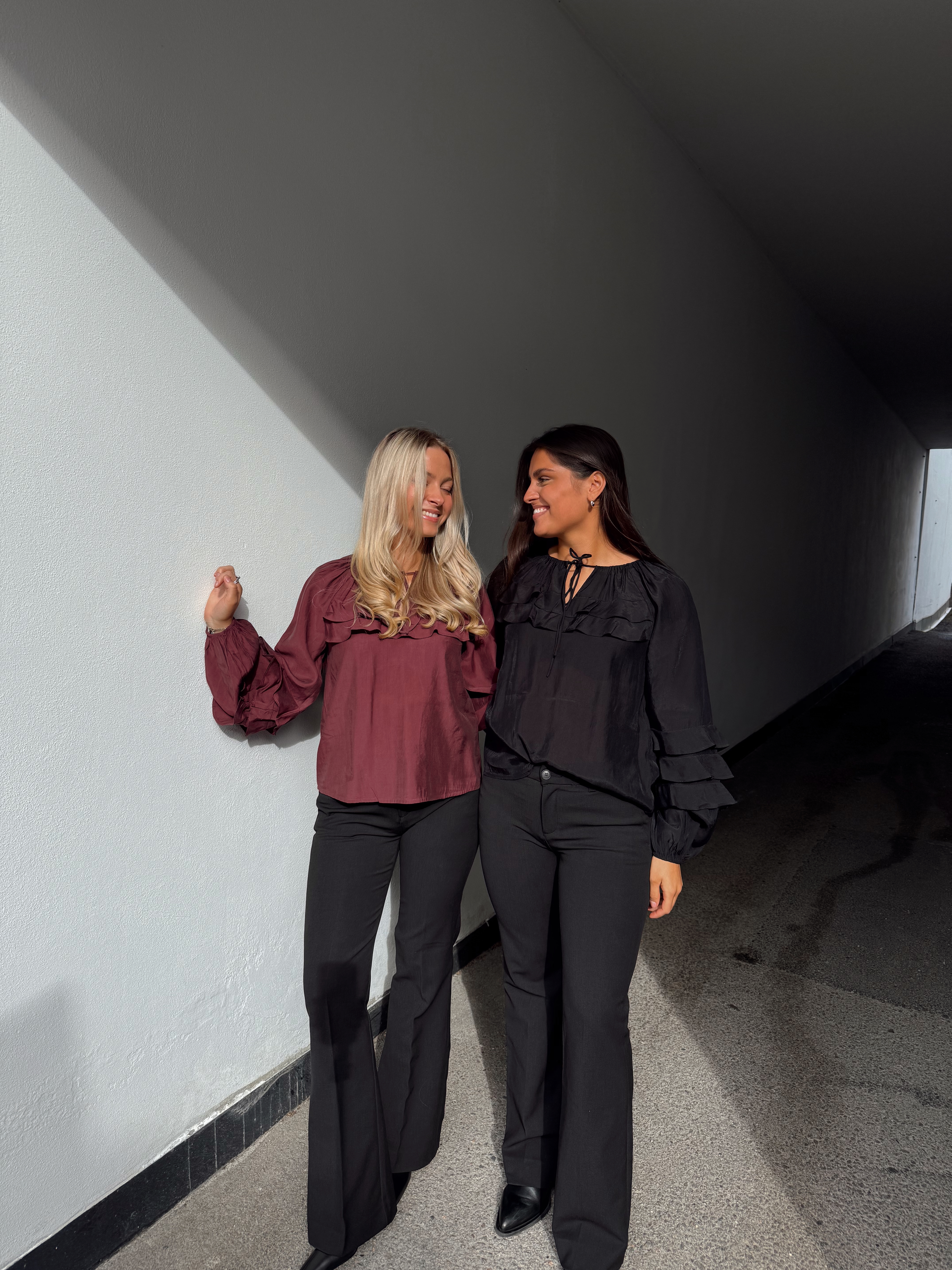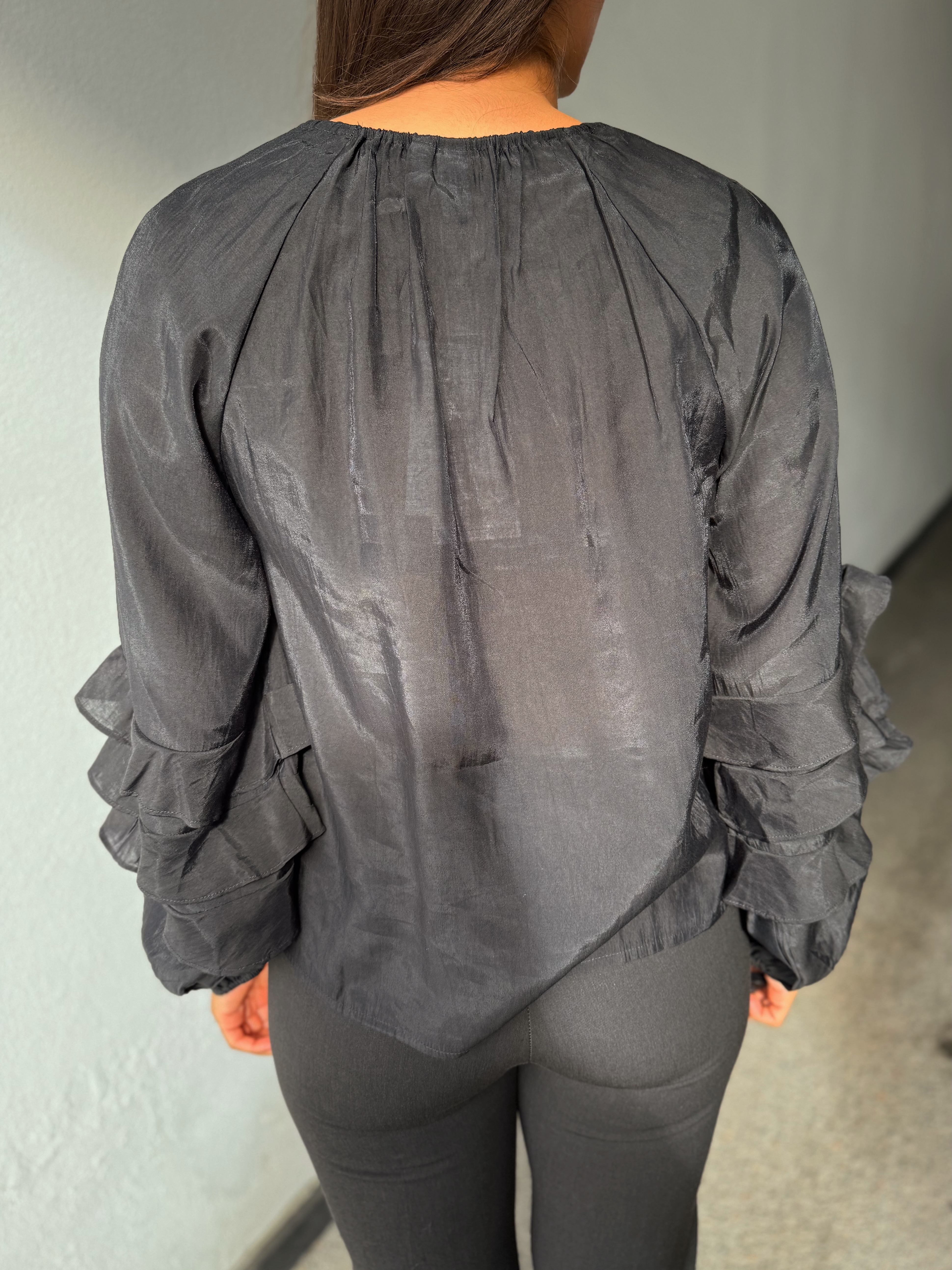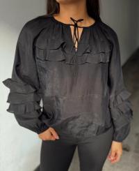 »Temura top» fra Yas er en nydelig bluse med søte volang-detaljer. Den har rund hals med knyting og har lang erm.