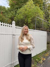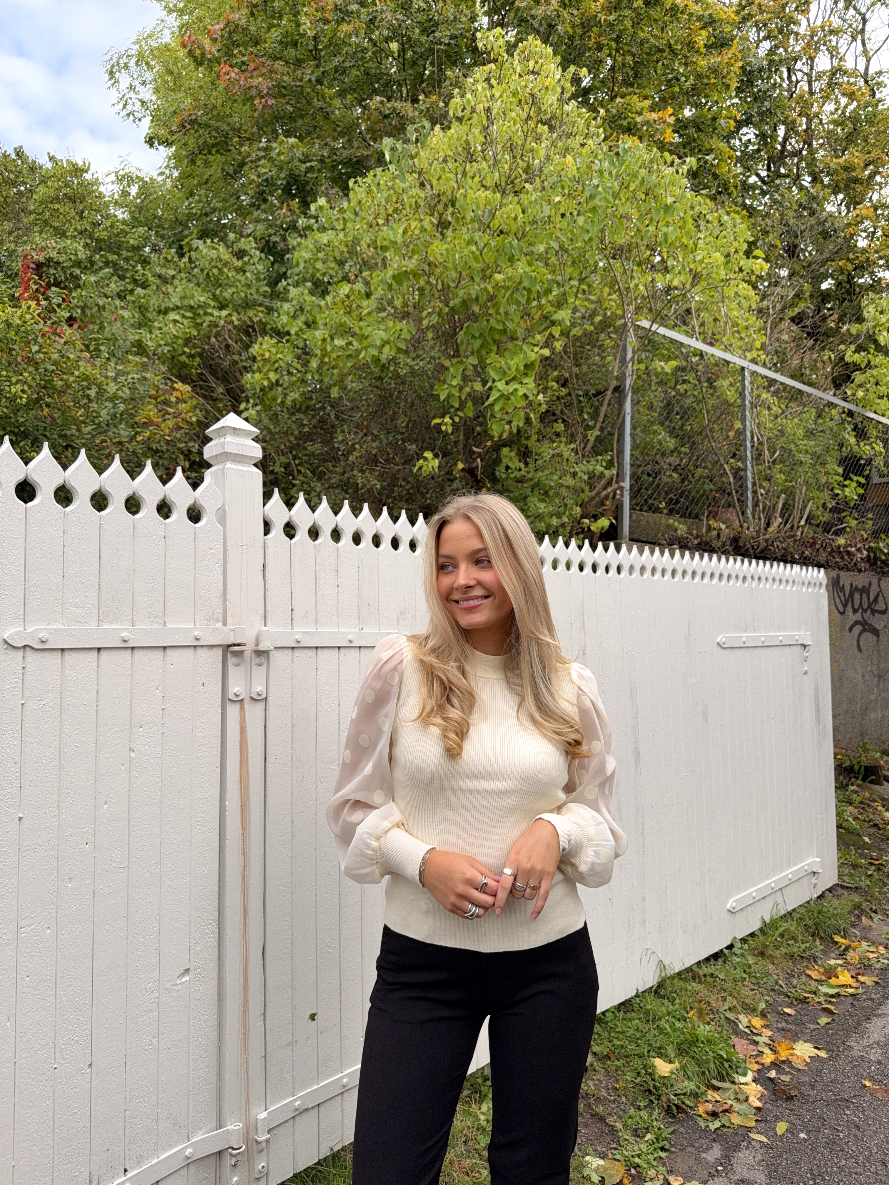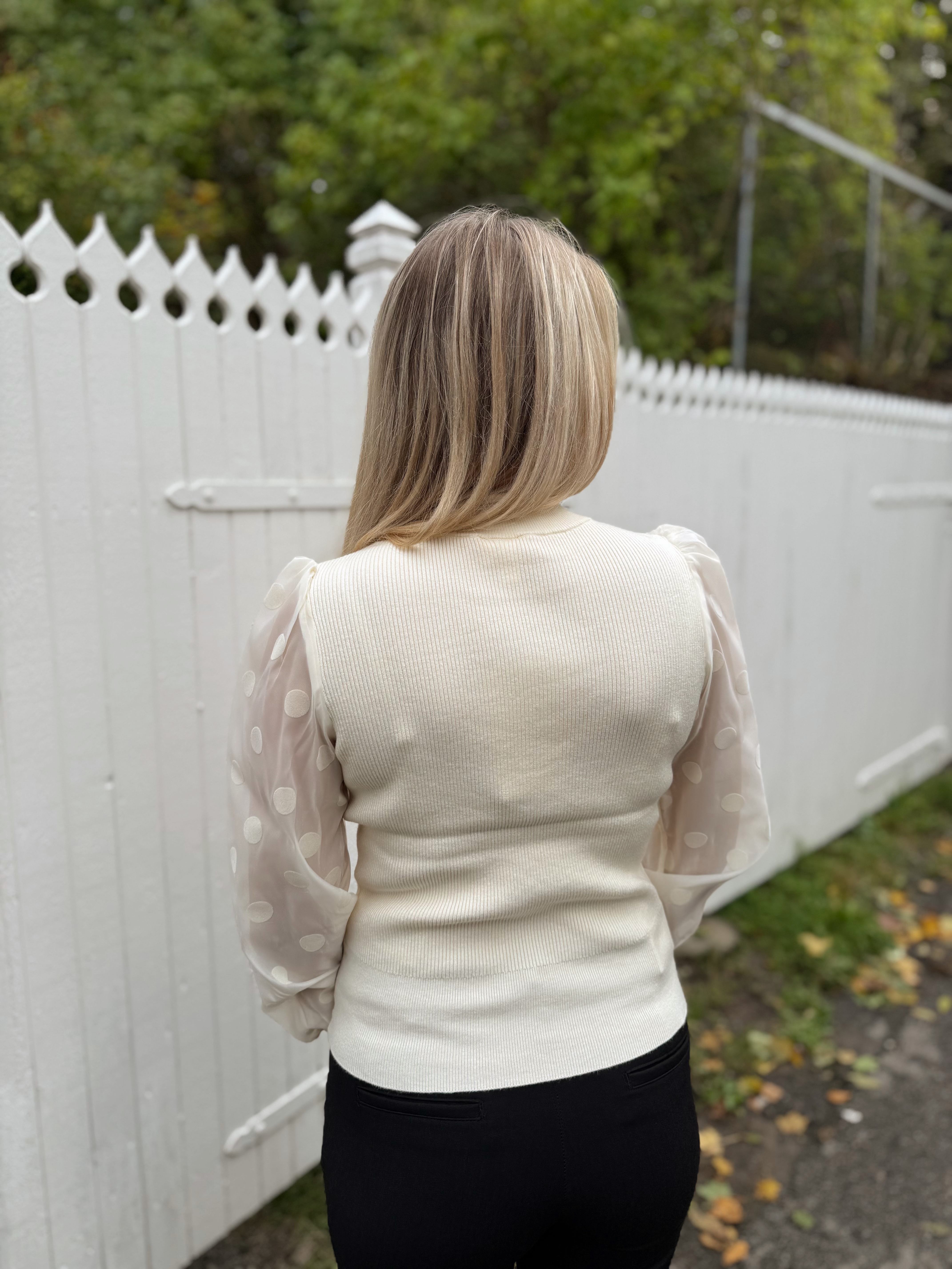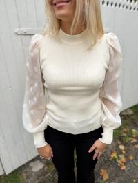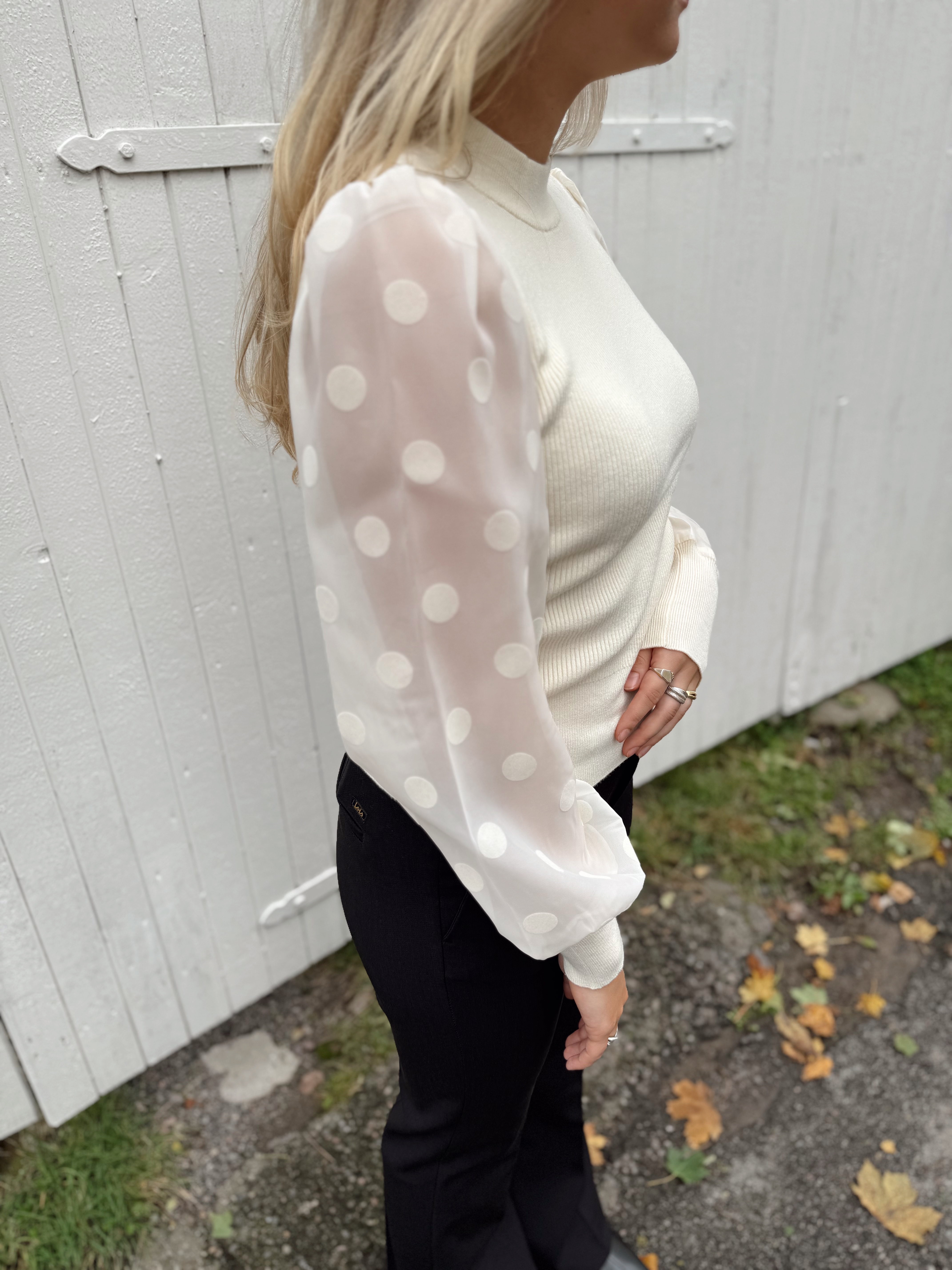 «Dotme knit pullover» fra YAS er en sort tettsittende strikkegenser med rund hals. Den har l store ermer i gjennomsiktig stoff med runde sorte «dotter». Ribbet strikk.