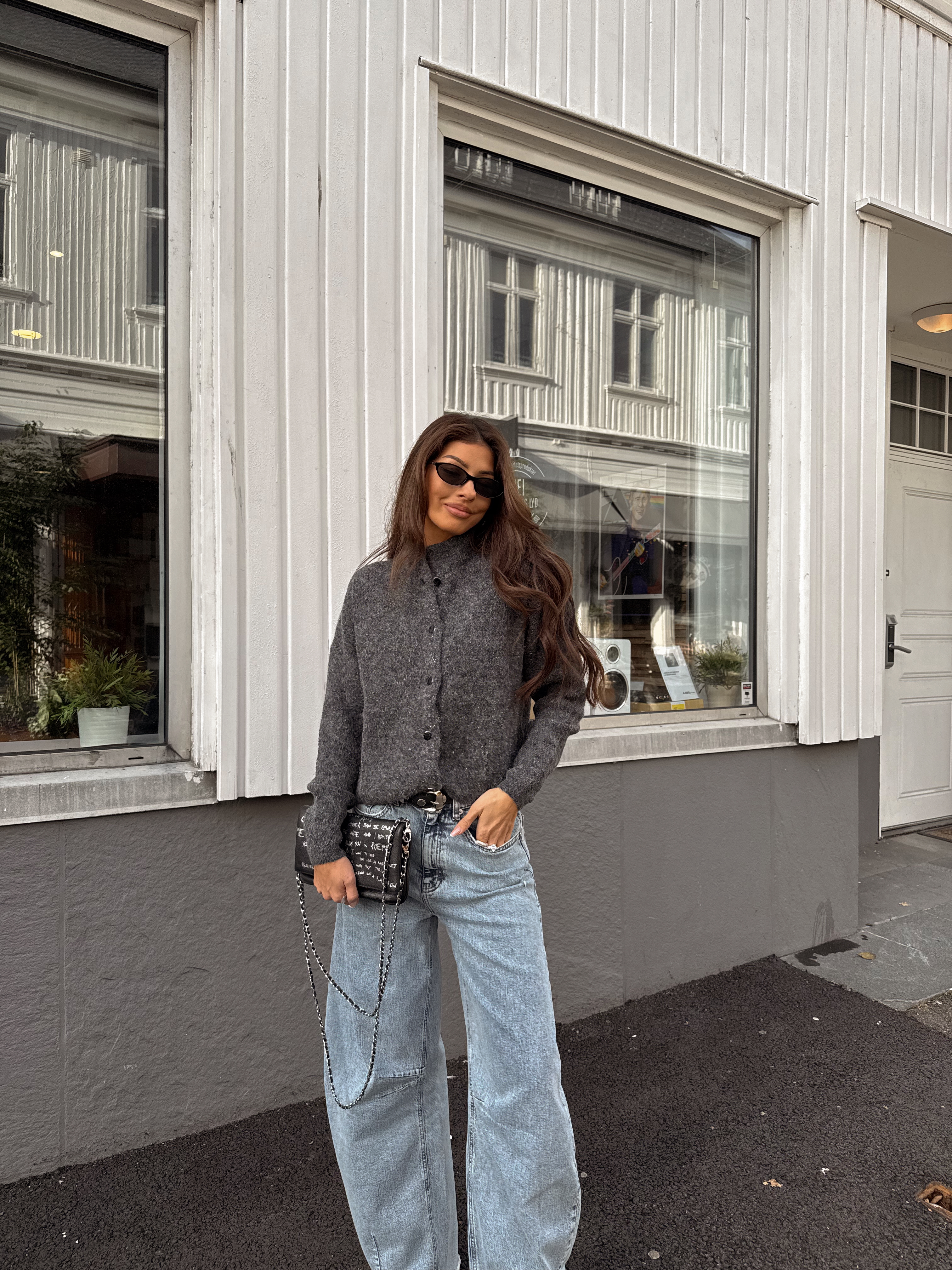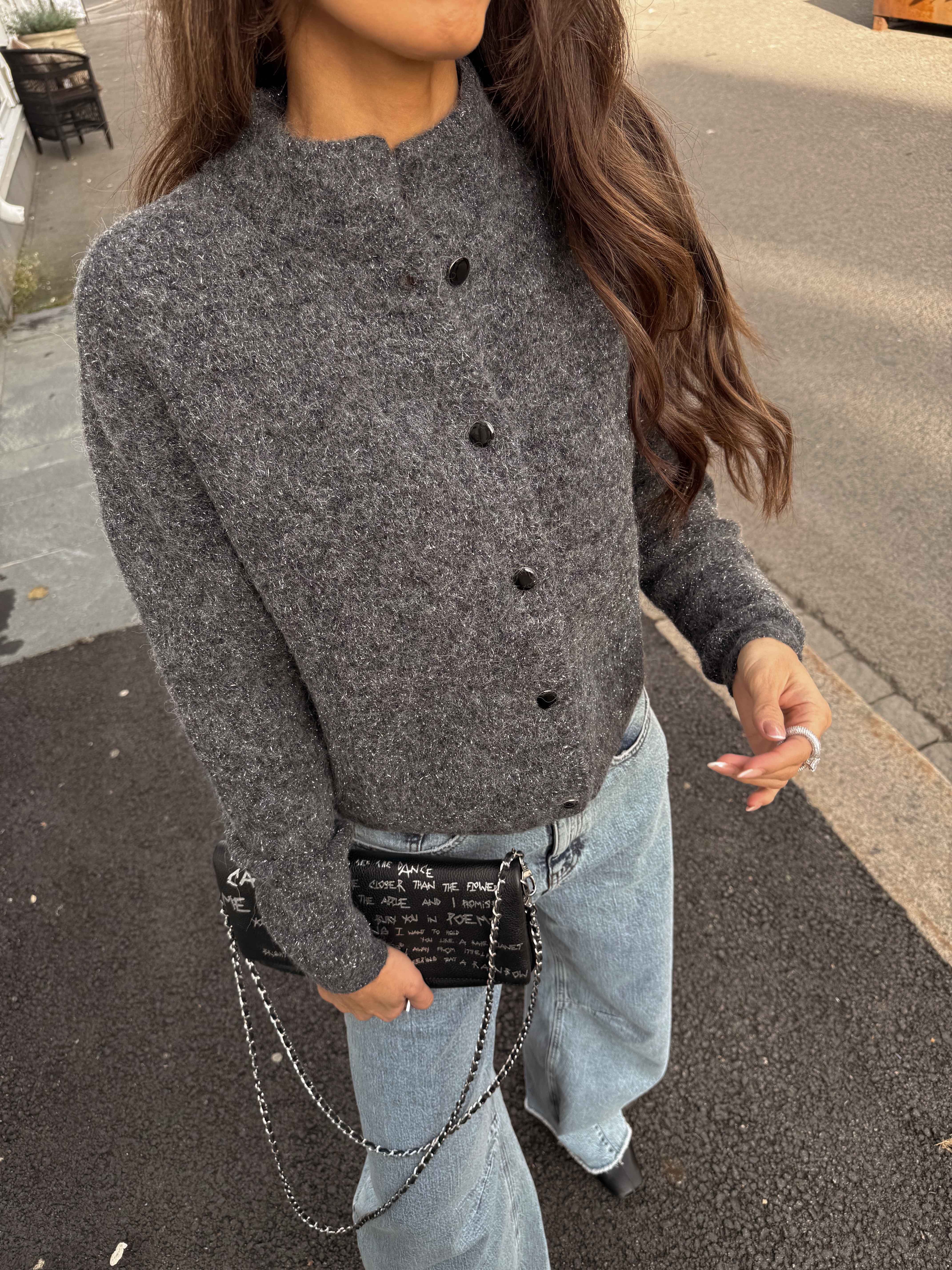 «Alpha Shimmer cardigan» fra Gestuz er en nydelig kort cardigan med lekere sølvknapper foran. Cardiganen har metalliske tråder som gir en super kul, glitrete look - klør ikke! Loose fit. Normal i størrelsen.