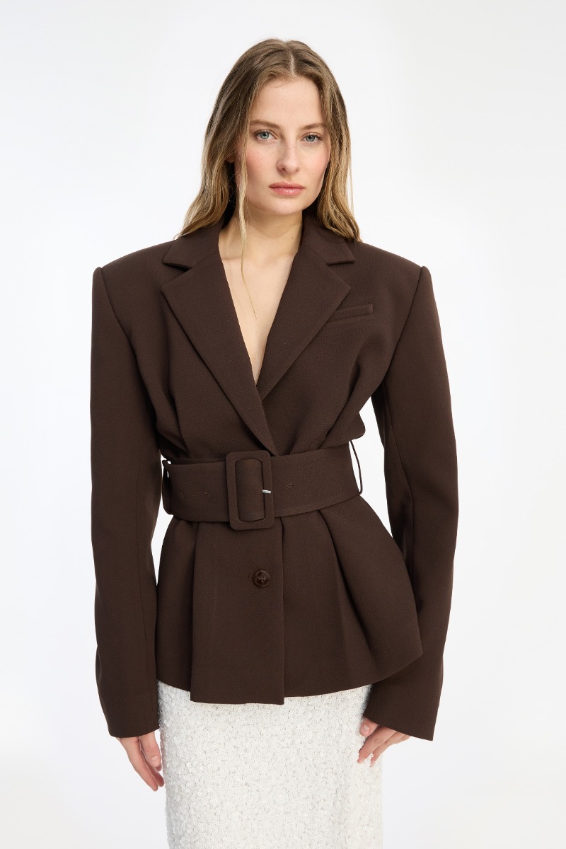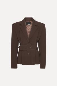 "Suiting Belted Blazer" fra Rotate. Super rå blazer med store skuldre og innsvinget midje. Denne blazeren har strukturerte skuldre, lange ermer med knappende mansjetter og en matchende belte med en stoffdekket spenne. Den lukkes med knapper foran og har subtile lommedetaljer, inkludert en brystlomme med welt. Innsiden er mykt foret.