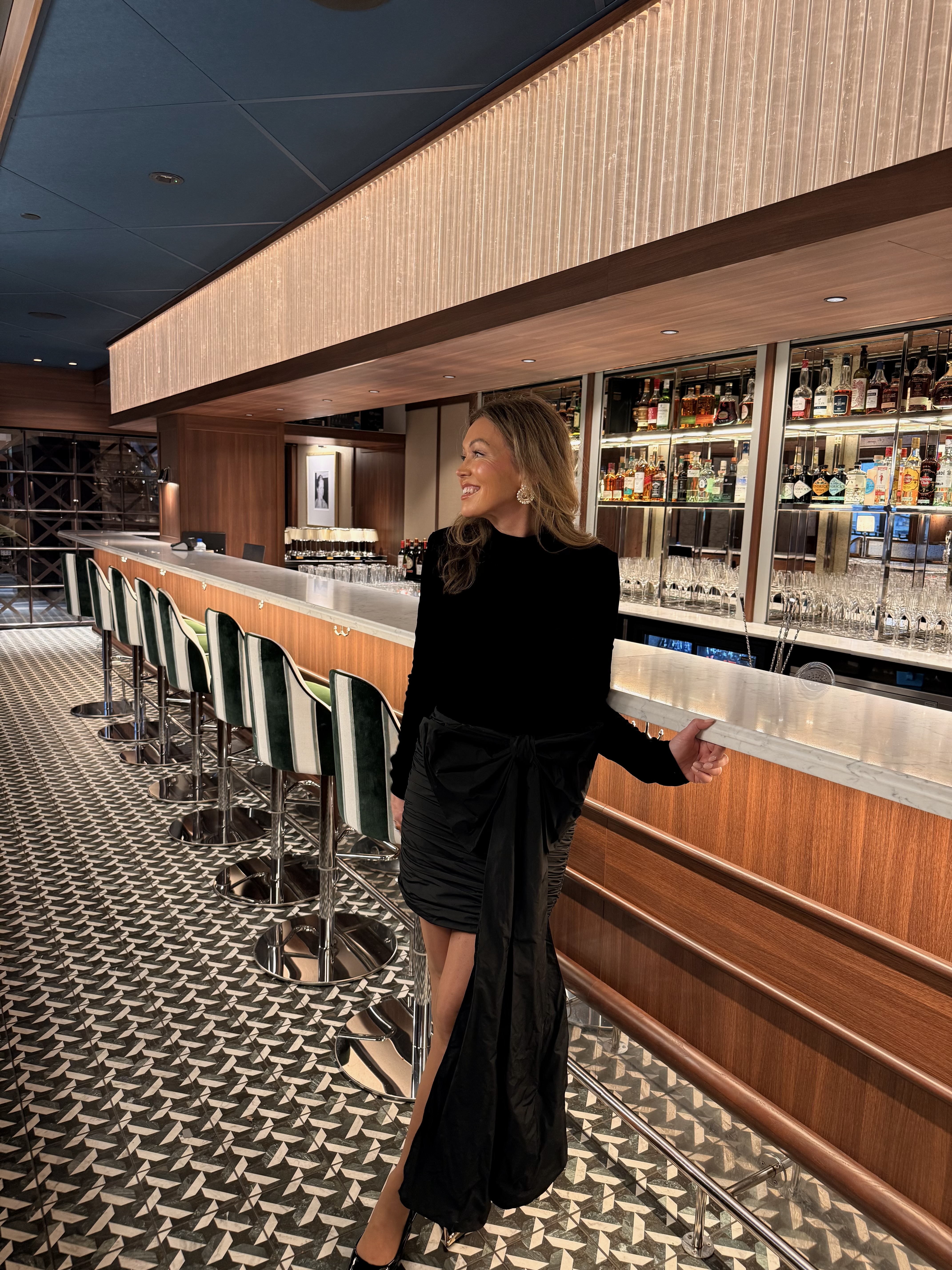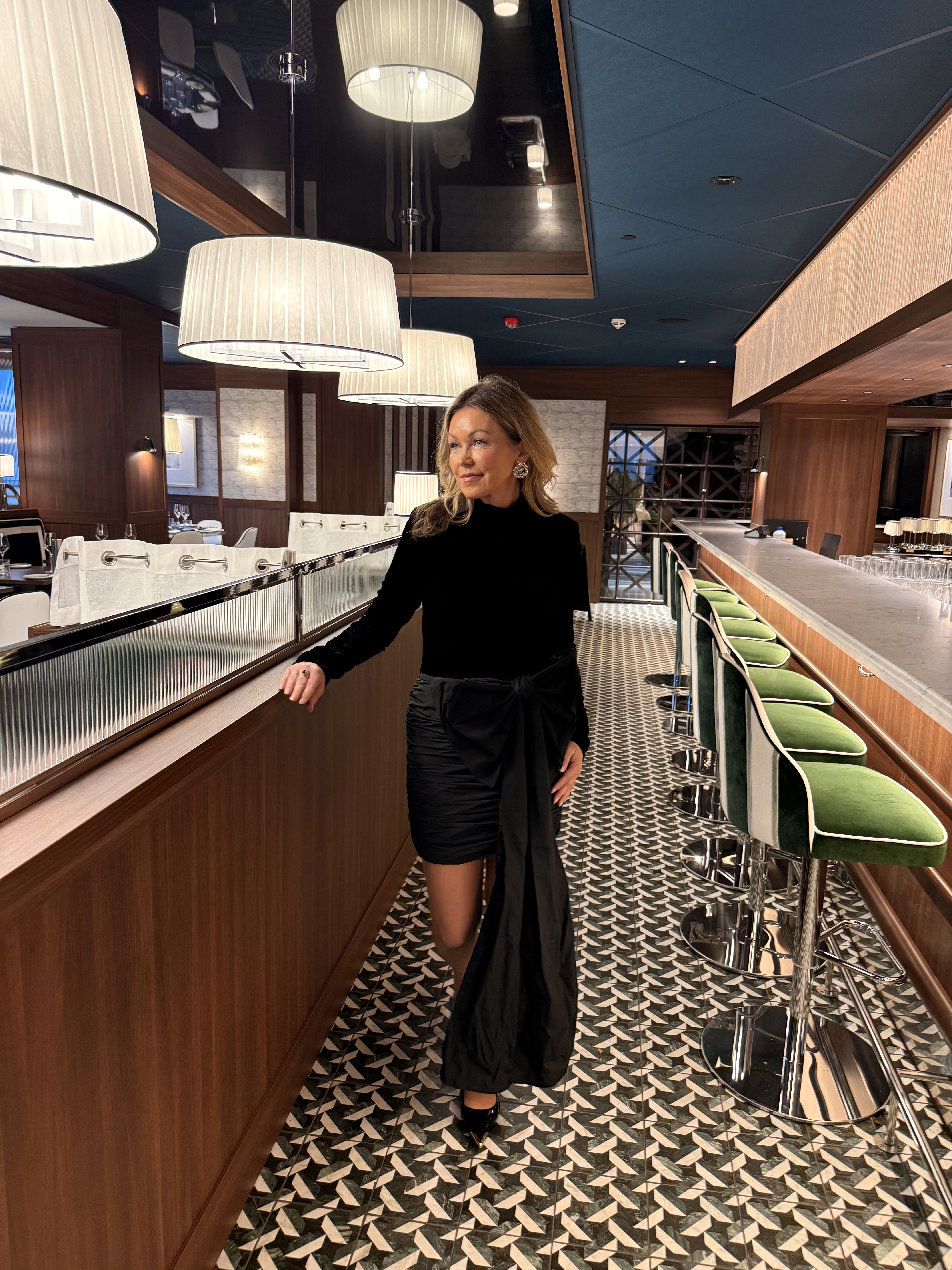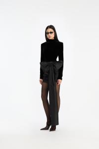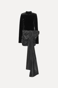 "Velvet Bow Mini Dress" fra Rotate er en svart tettsittende minikjole med lange ermer og høy hals. Den øvre delen er laget av et mykt fløyelsmateriale, mens skjørtet er rynket langs sidene og baksiden. Den har en stor, skulpturell sløyfe med et utvidet, drapert panel. Kjolen er foret.