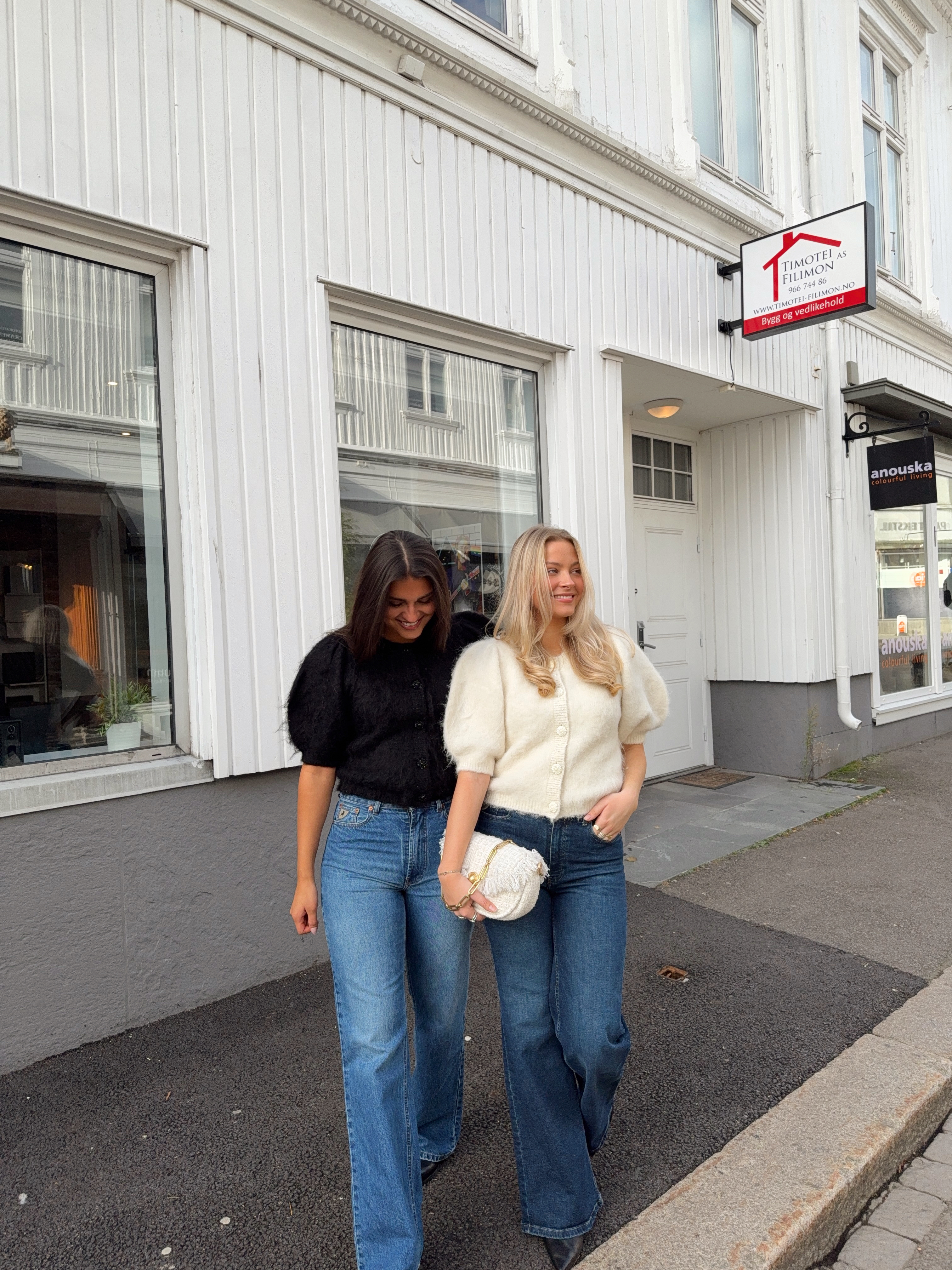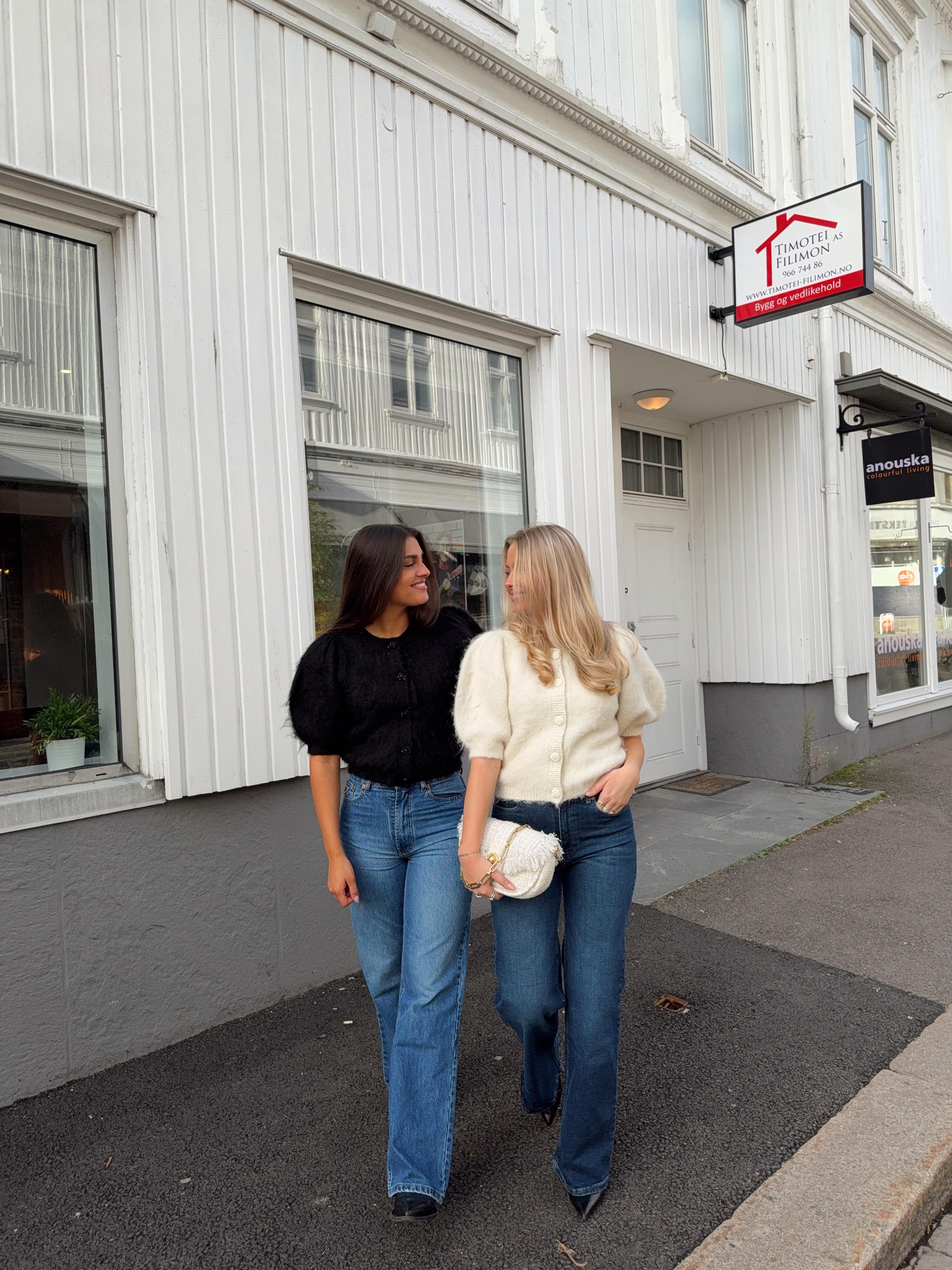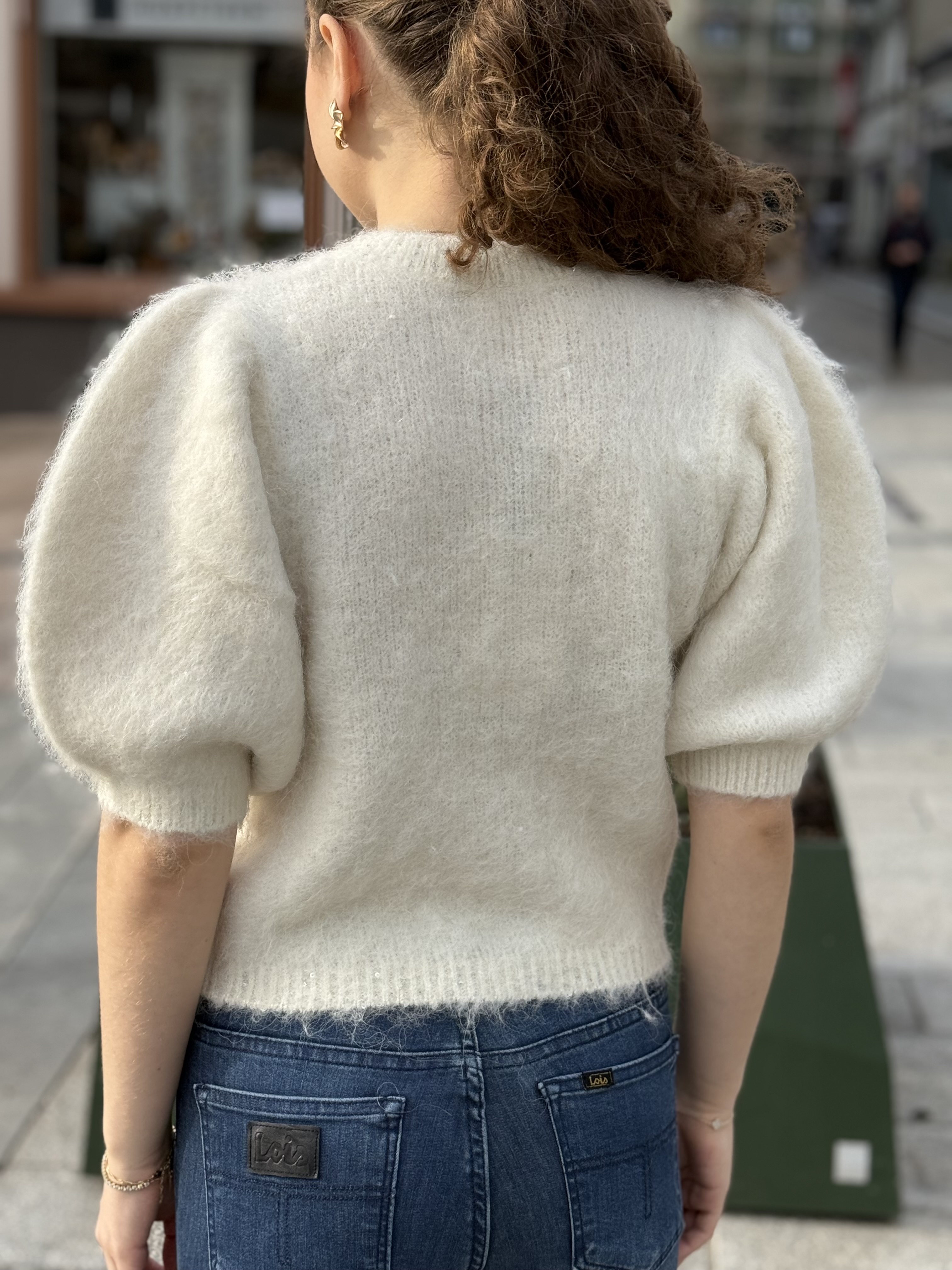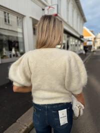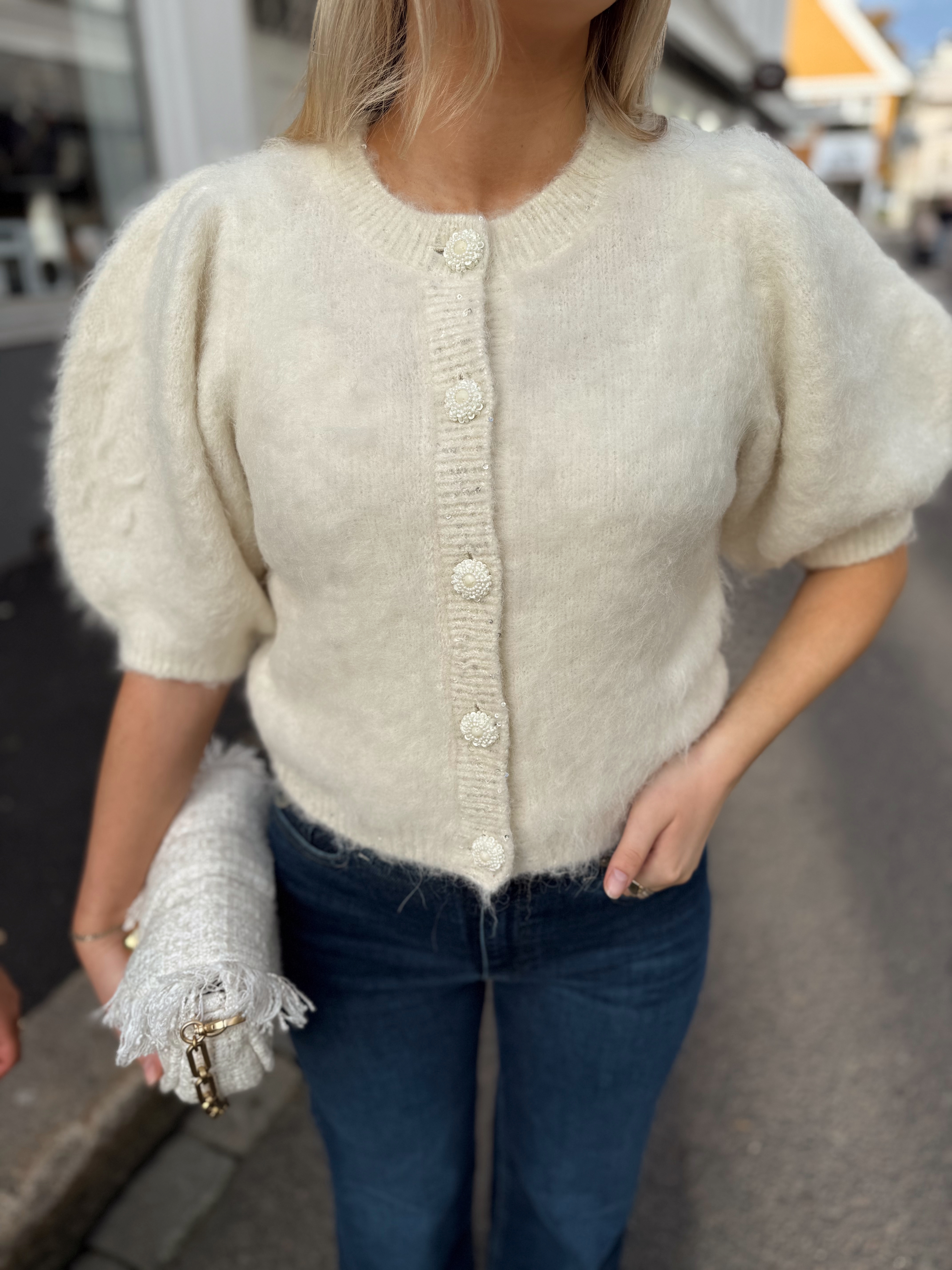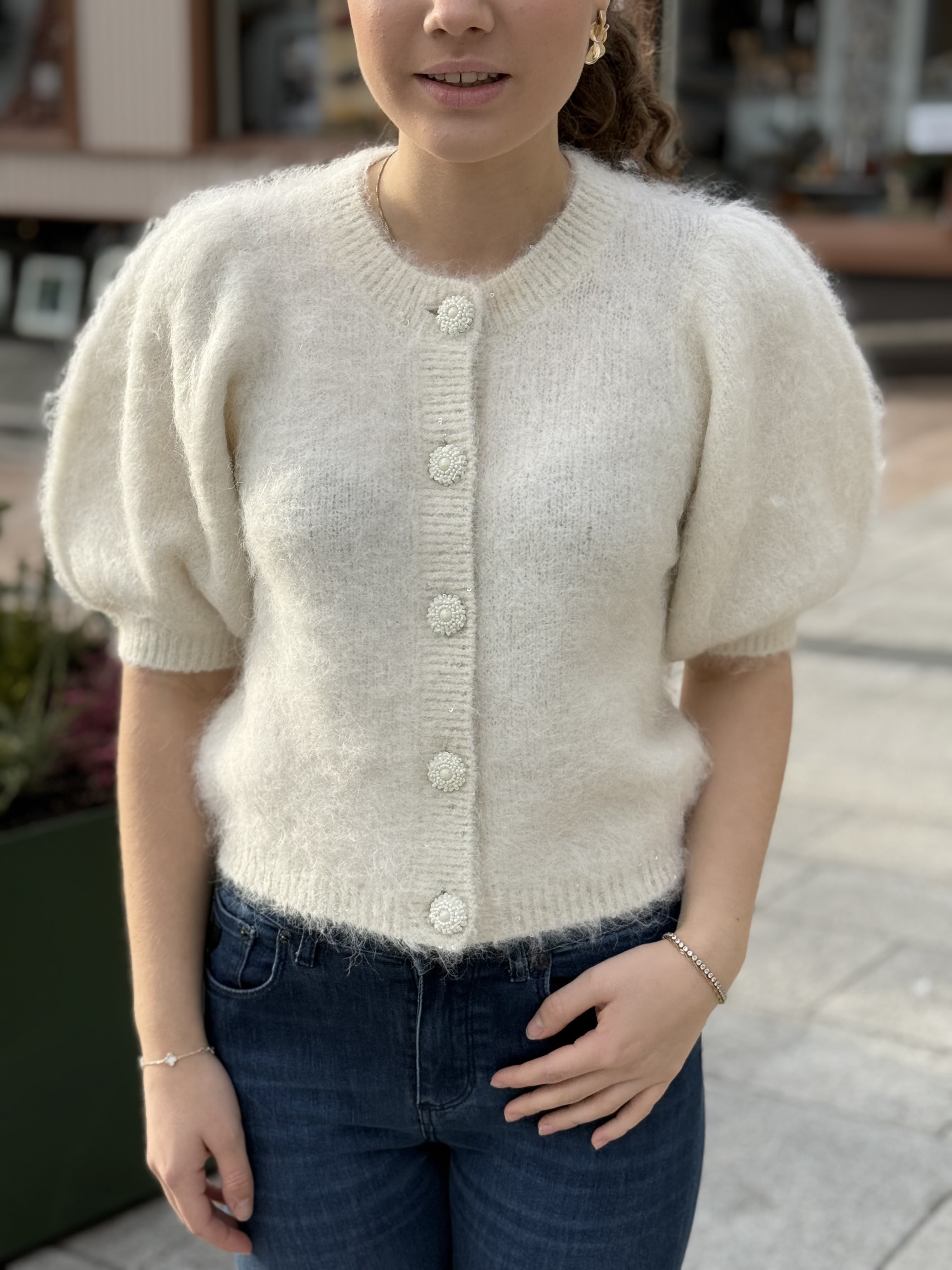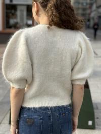 "Hairy Knit Puffed Jacket" fra byTiMo. Denne jakken er helt nydelig med kortermet puff, ribbet krave og lekre perlekapper formet som blomst. Jakken erlaget av byTiMo sitt veldig myke og fussy RAS sertifiserte garn.Toppen har rett siluett, er høyhalset og armløs.