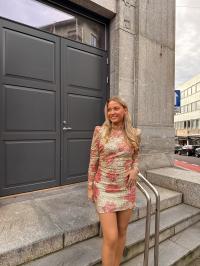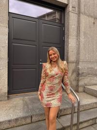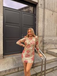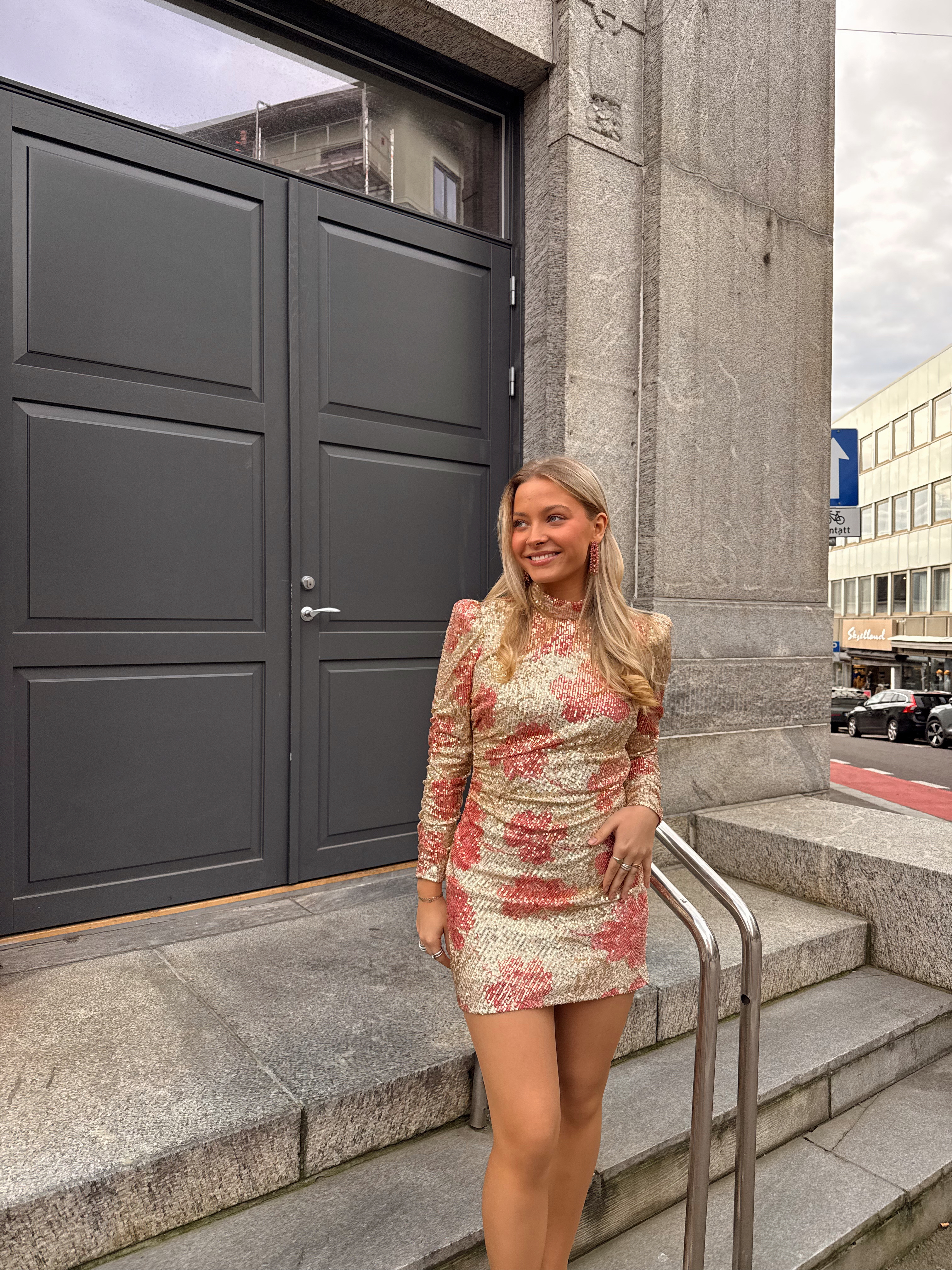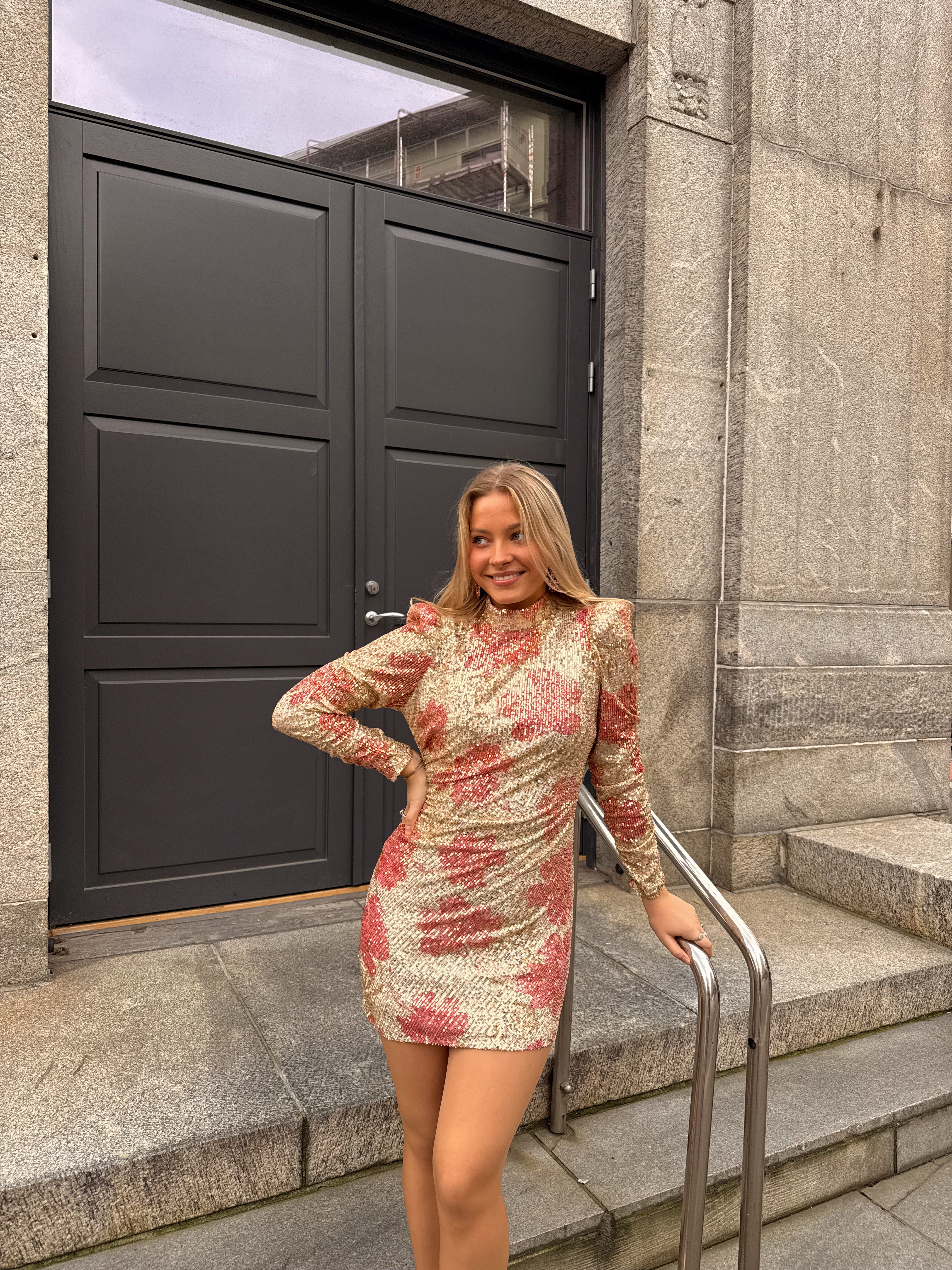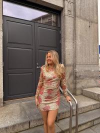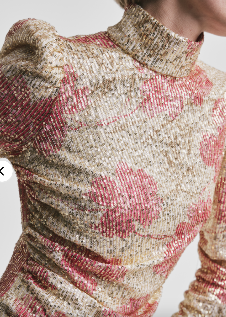 «Sequins puff sleeve mini» fra byTiMo er en rålekker paljettkjole som er laget i paljetter som gir en glitrende vibe. Den har en minilengde og en tilpasset silhuett. Kjolen har puffede skuldre, lange ermer og turtle hals. Kjolen kommer med et løst, matchende belte. Lukkes med skjult glidelås bak. Normal i størrelsen.