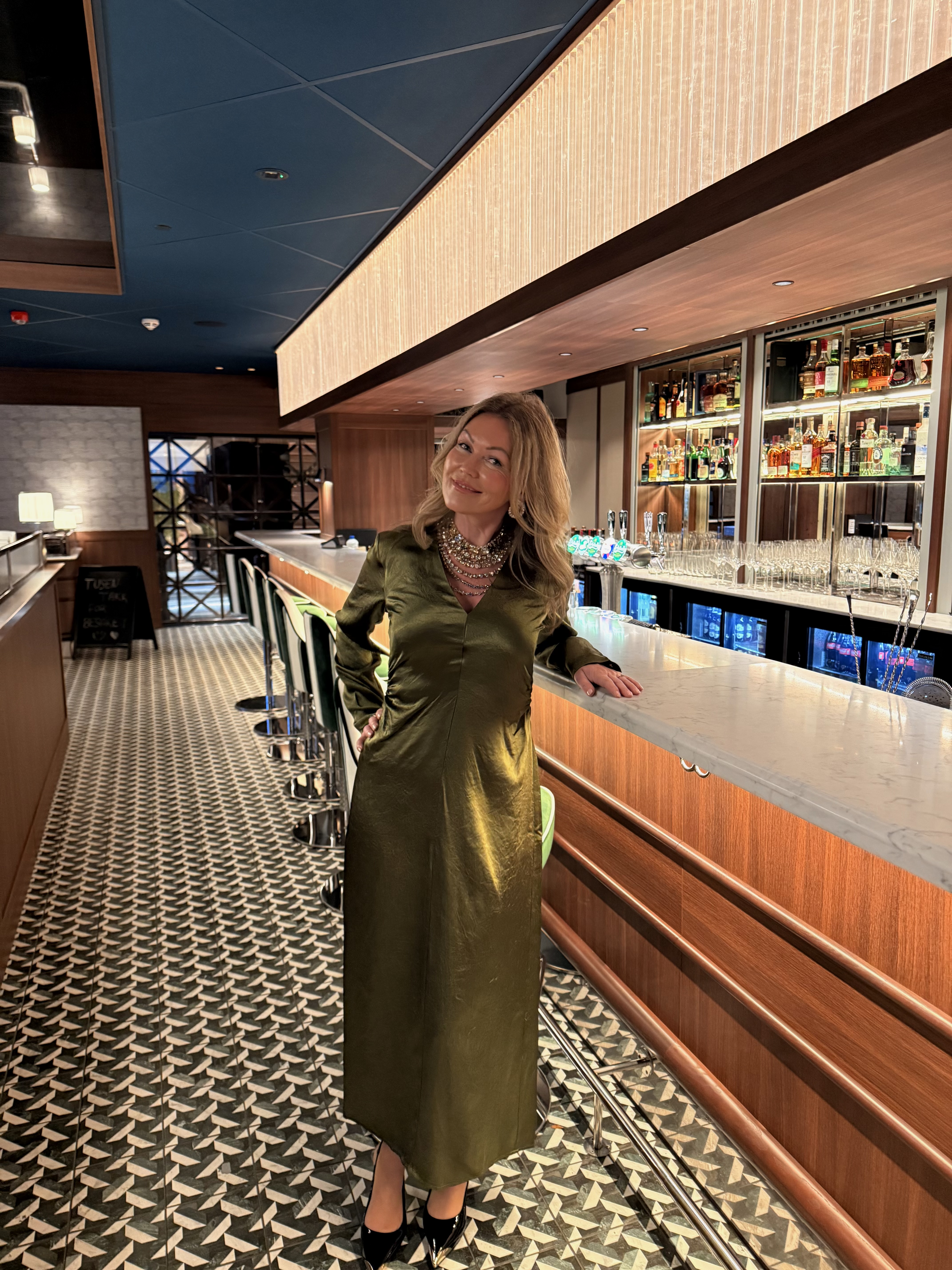 «Selene slim dress» fra Selected Femme er en lang vakker sateng kjole med v-hals og lang erm. Splitt bak. Tettsittende i fasongen.