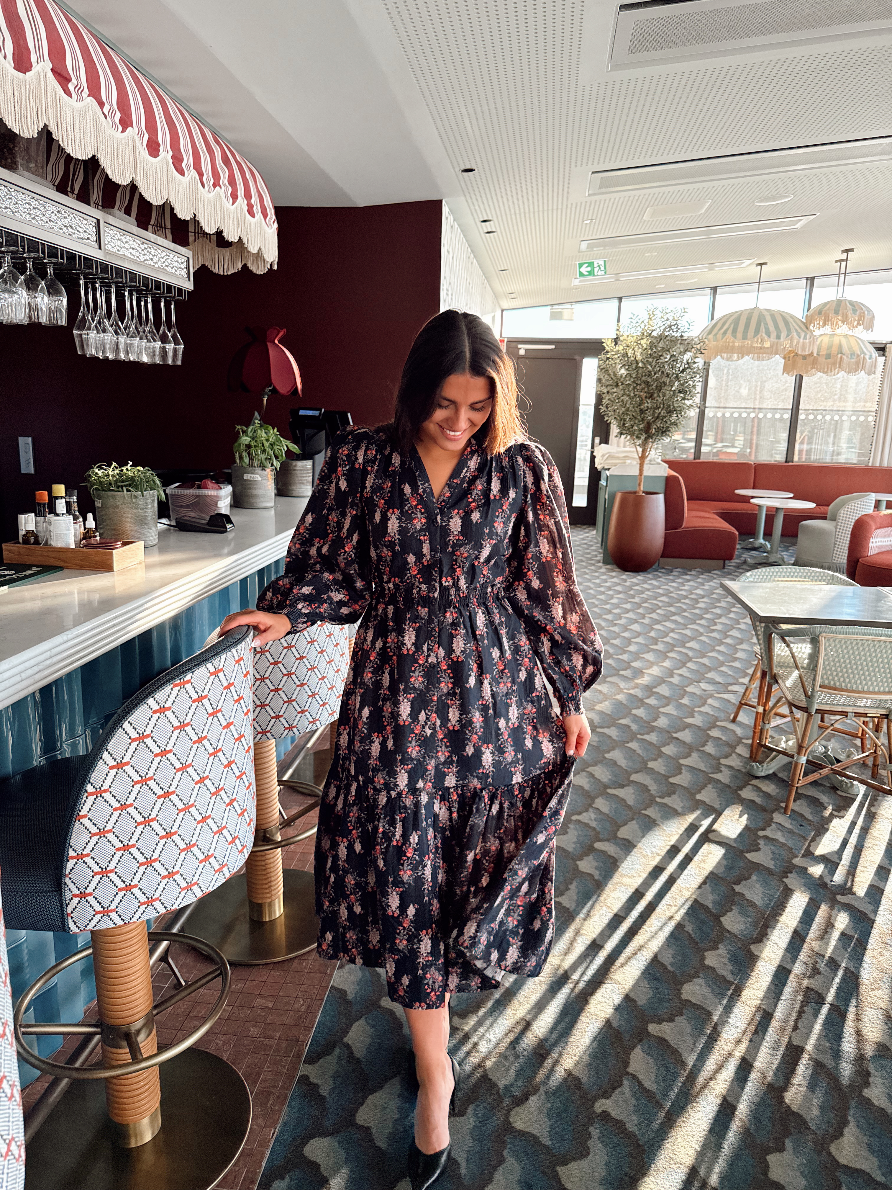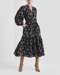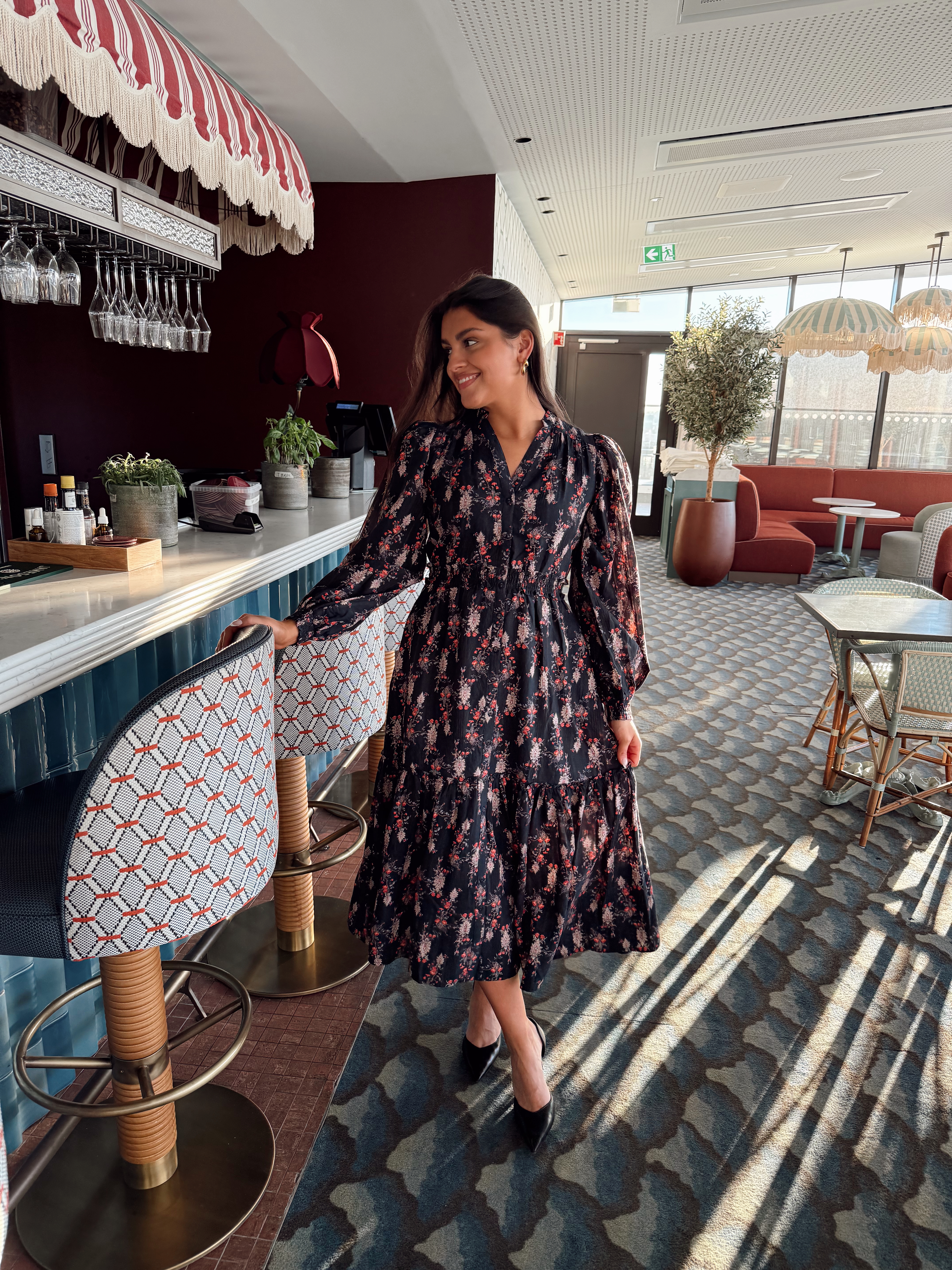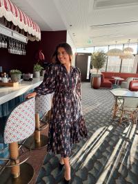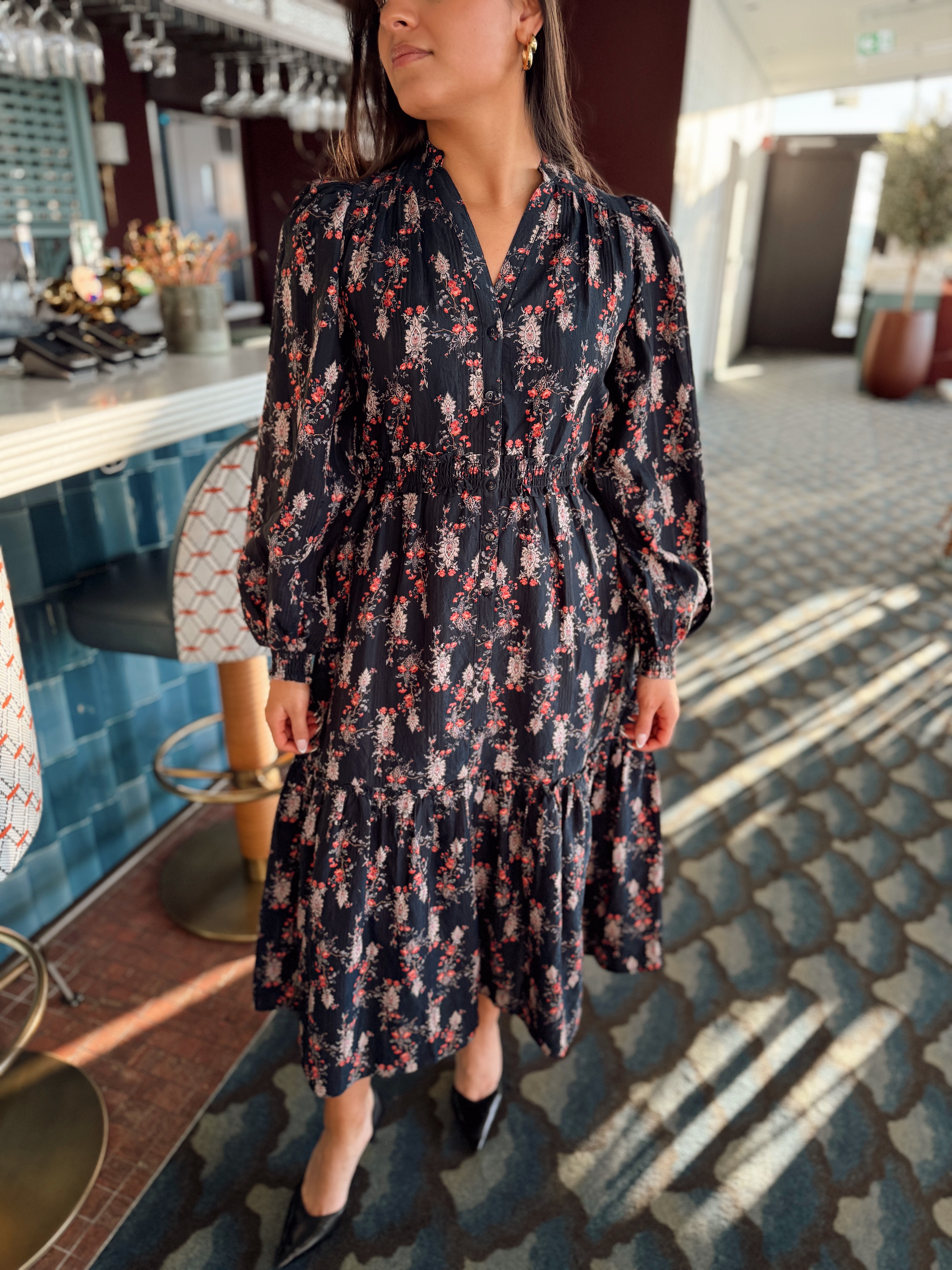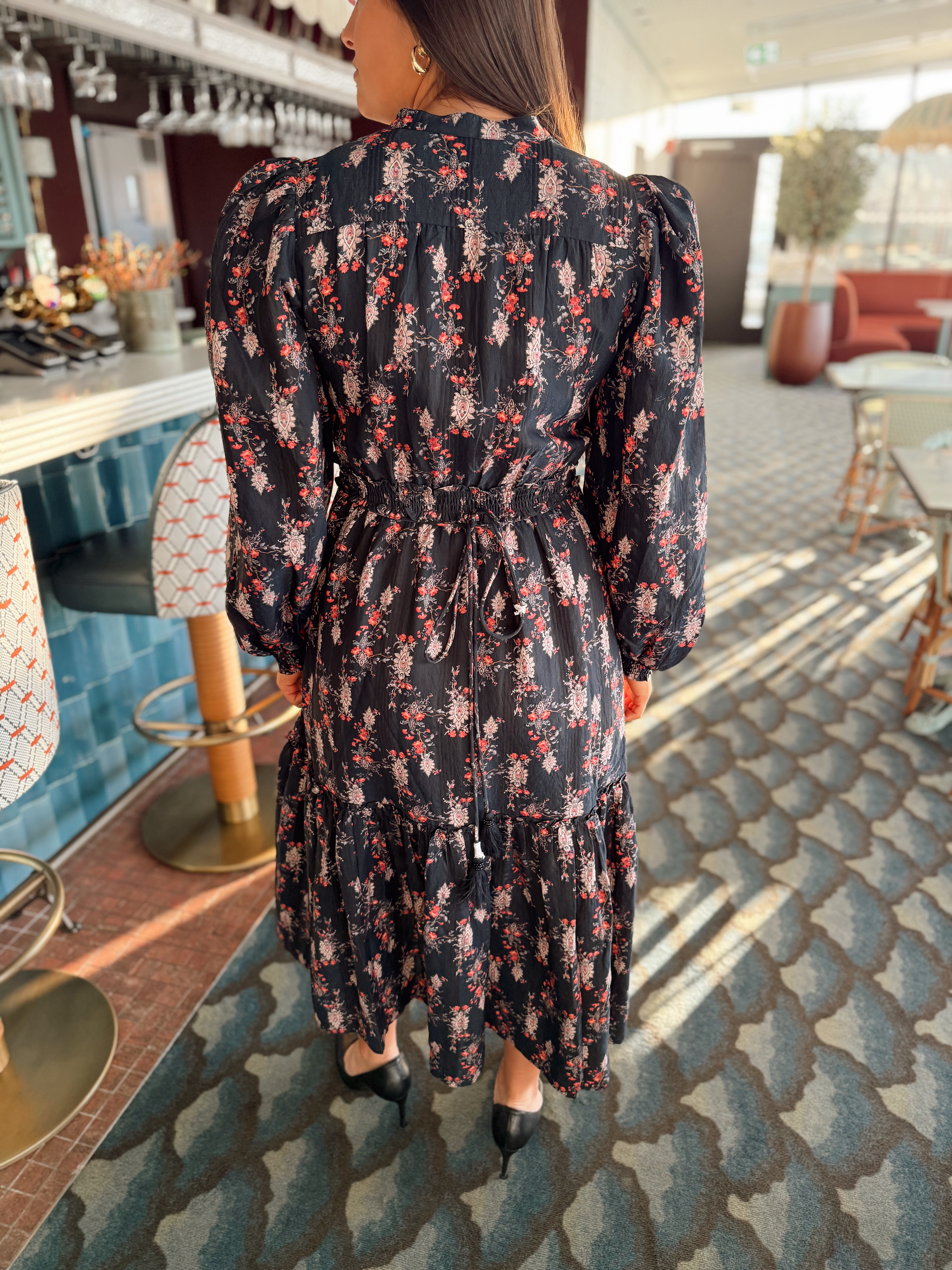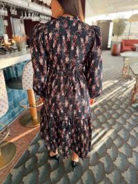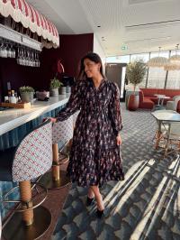 "Bohemian Belt Dress" fra byTiMo. Denne kjolen er laget av byTiMo sin myke og lette , FSC- sertifiserte viskosekvalitet. Kjolen har en midi lengde, tettsittende midje med vaffelsøm, mandarinkrage, v-hals, knapper foran og lange volume ermer med vaffelsøm mansjetter. Den har en dekorativ snøring med dusker som kan knytes rundt midjen.
