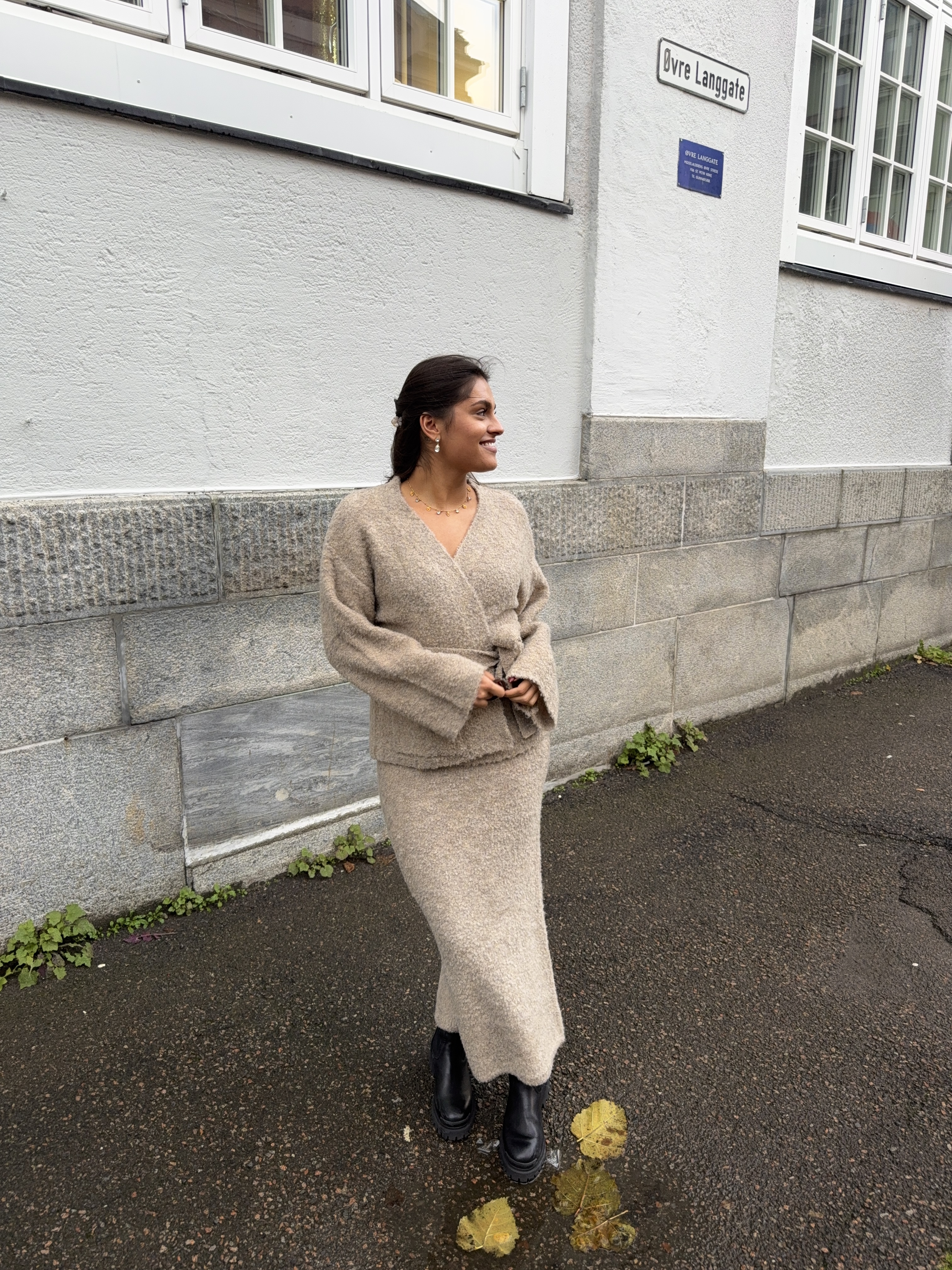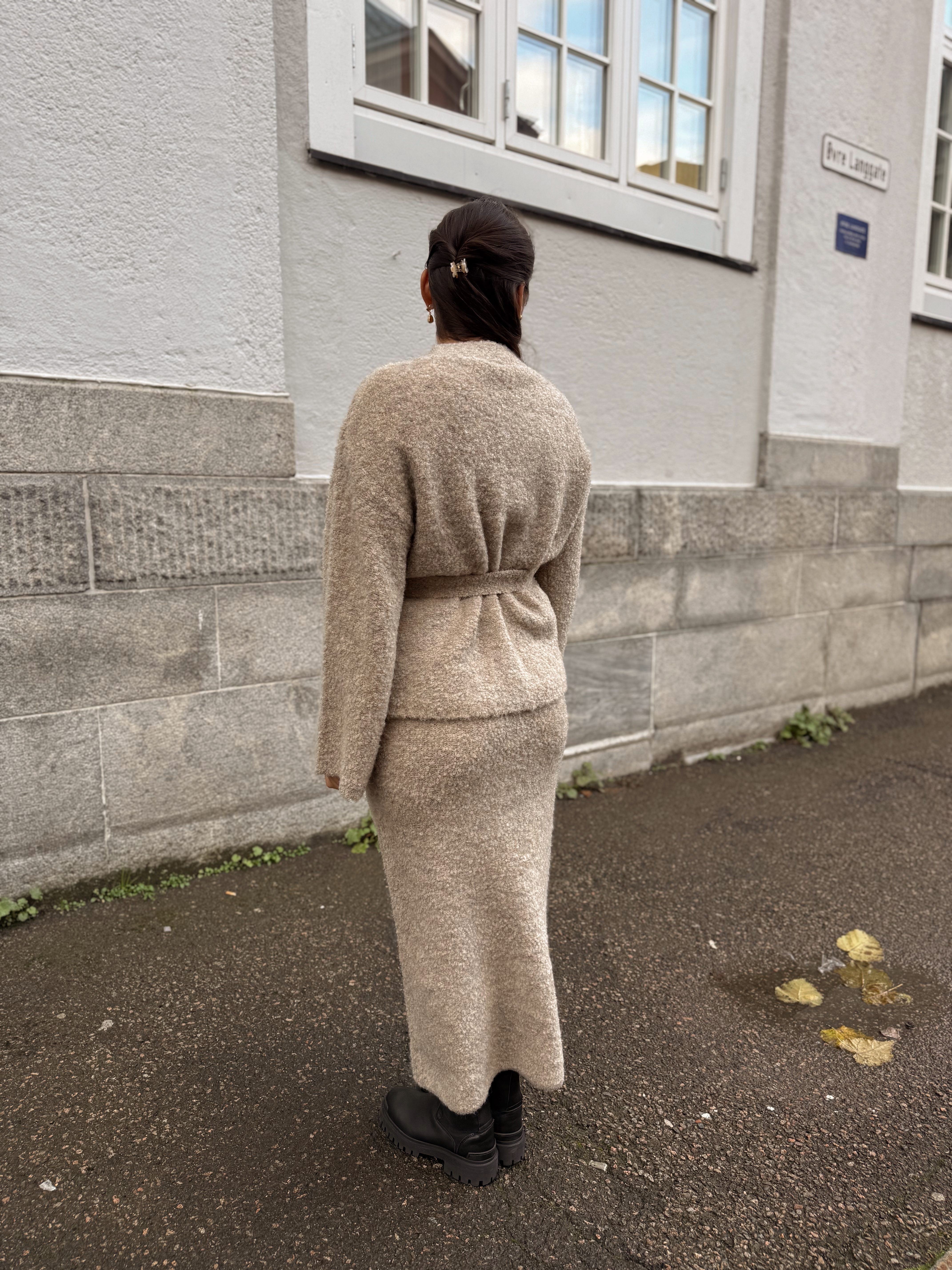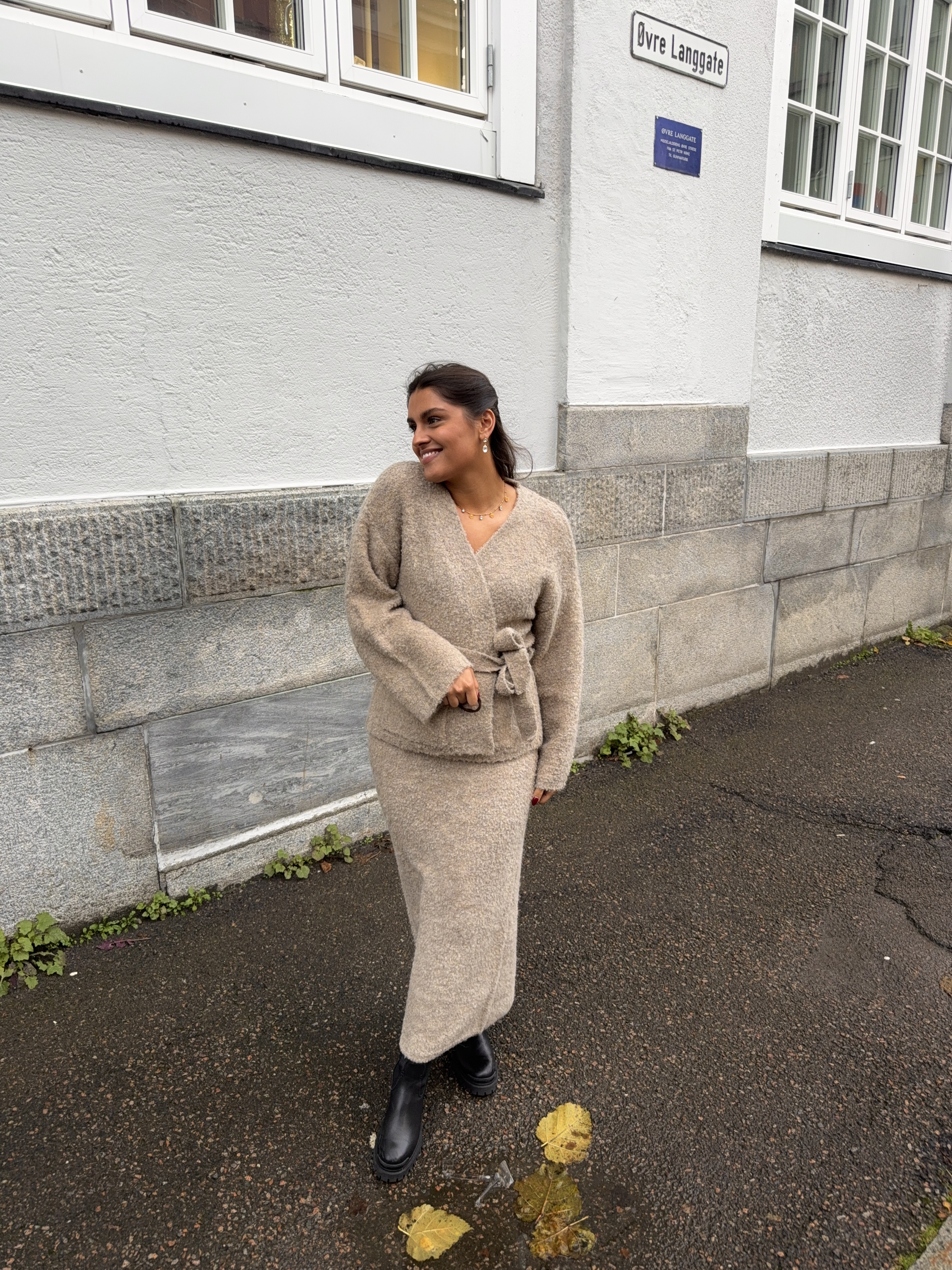 "Plyra Knit Cardigan" fra Yas. Strikket cardigan med lange ermer og knyting i midjen. Cardiganen har v-hals og lommer foran. Style med Plyra Ankle Knit Skirt for komplett look!