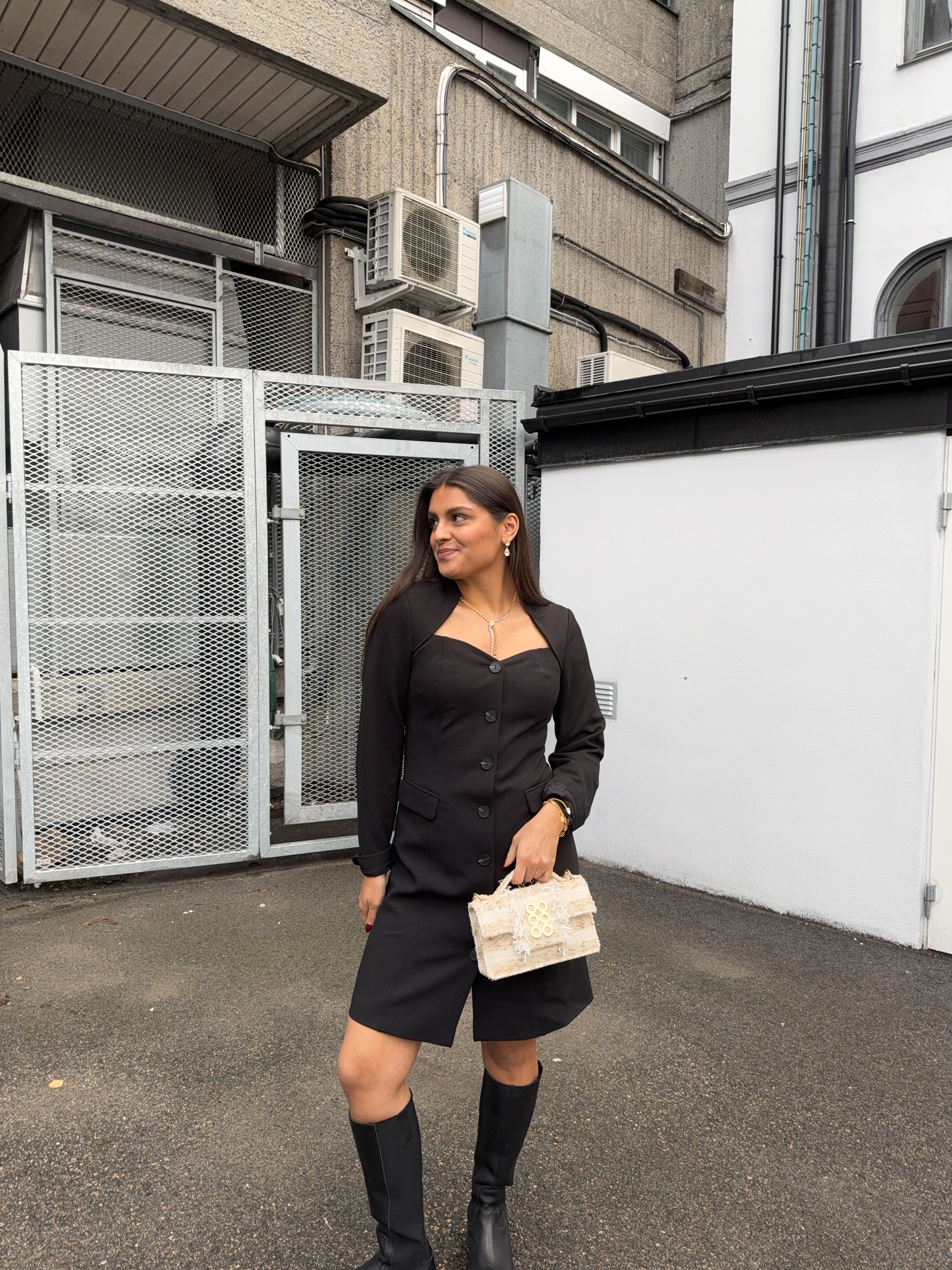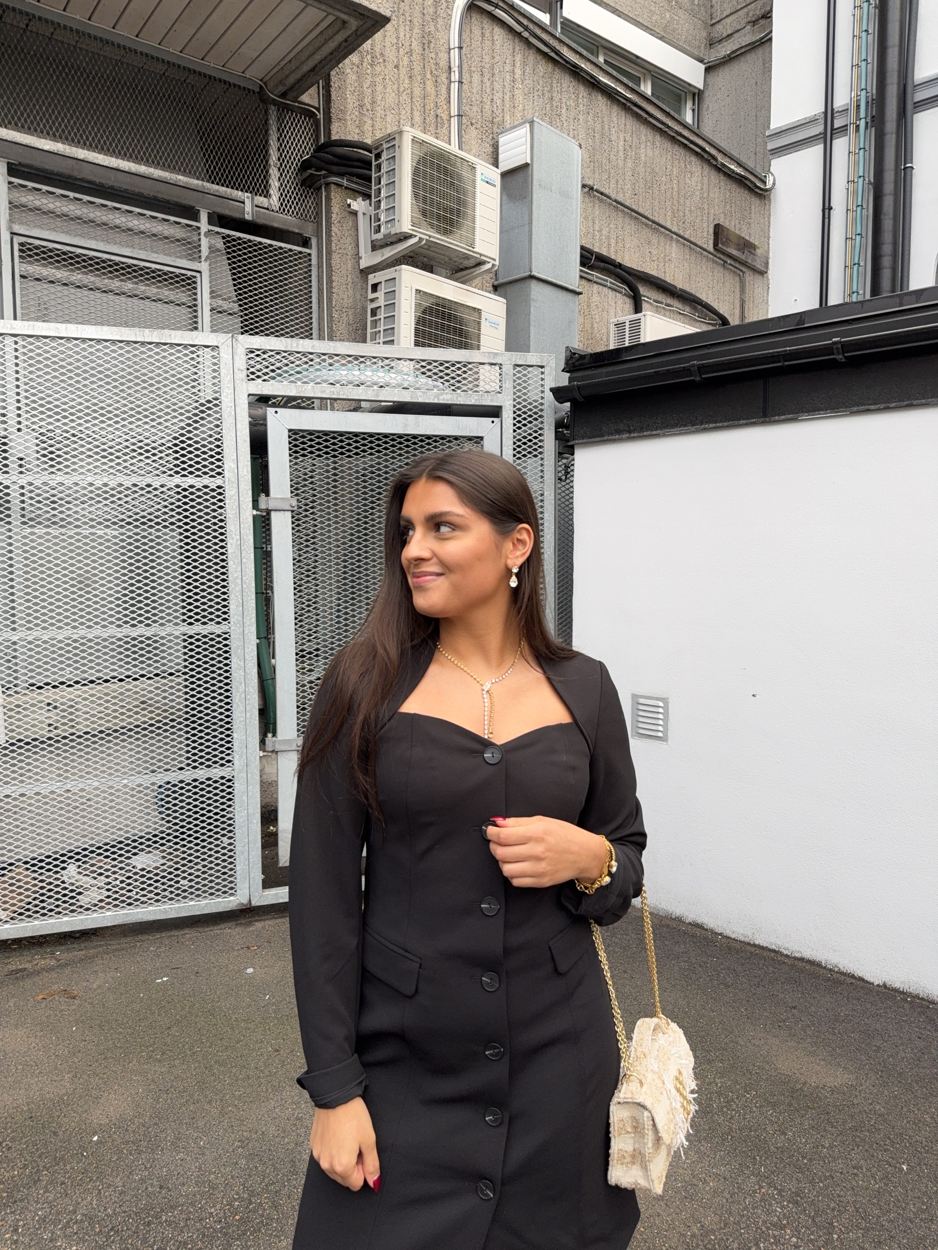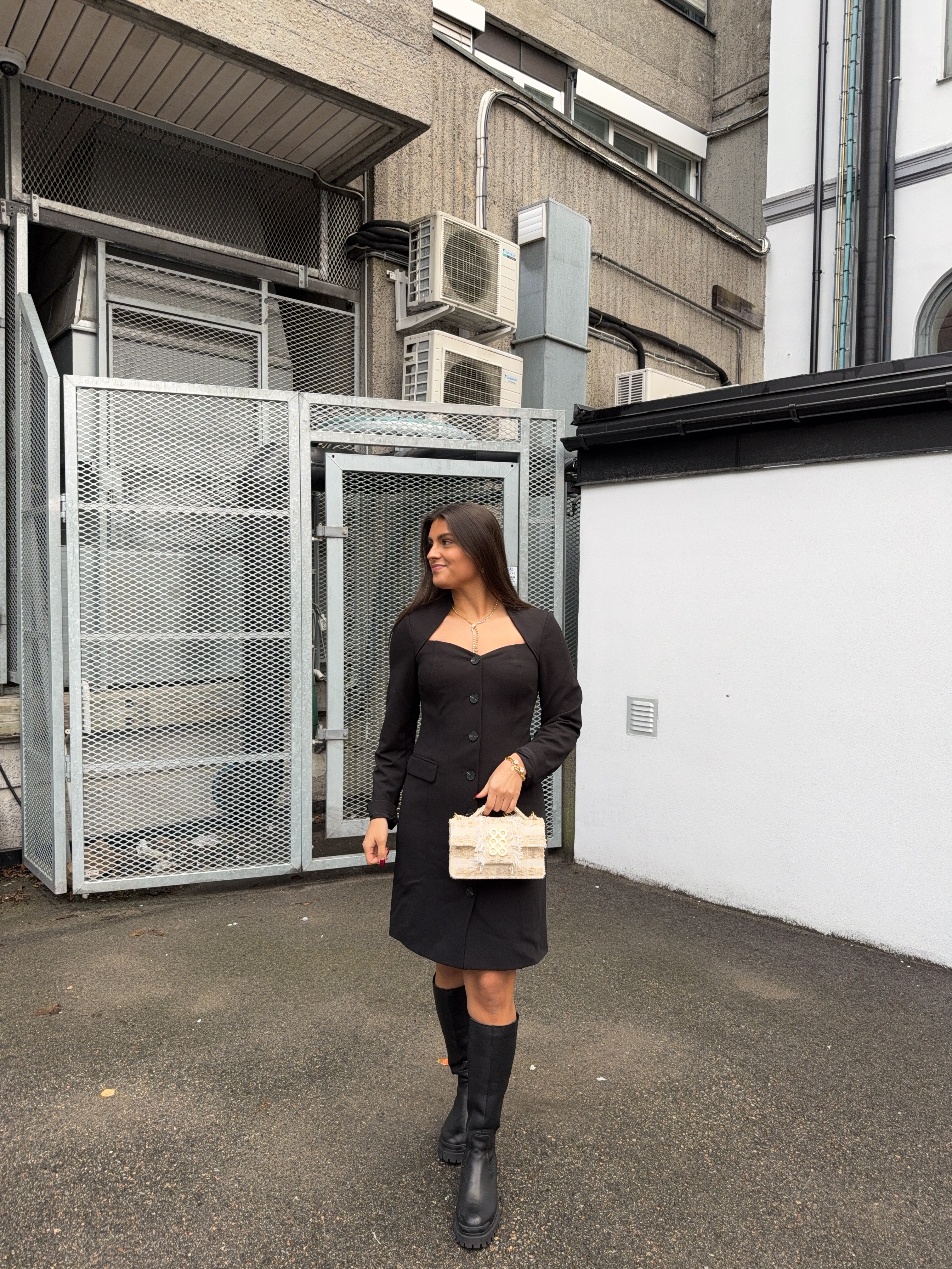 «Favo Blazer Dress» fra Yas. Denne tidløse blazer kjolen er et perfekt basisplagg som passer til enhver garderobe. Den har en flatterende V-hals, 7/8-ermer og knappelukking foran, med en behagelig og normal passform.