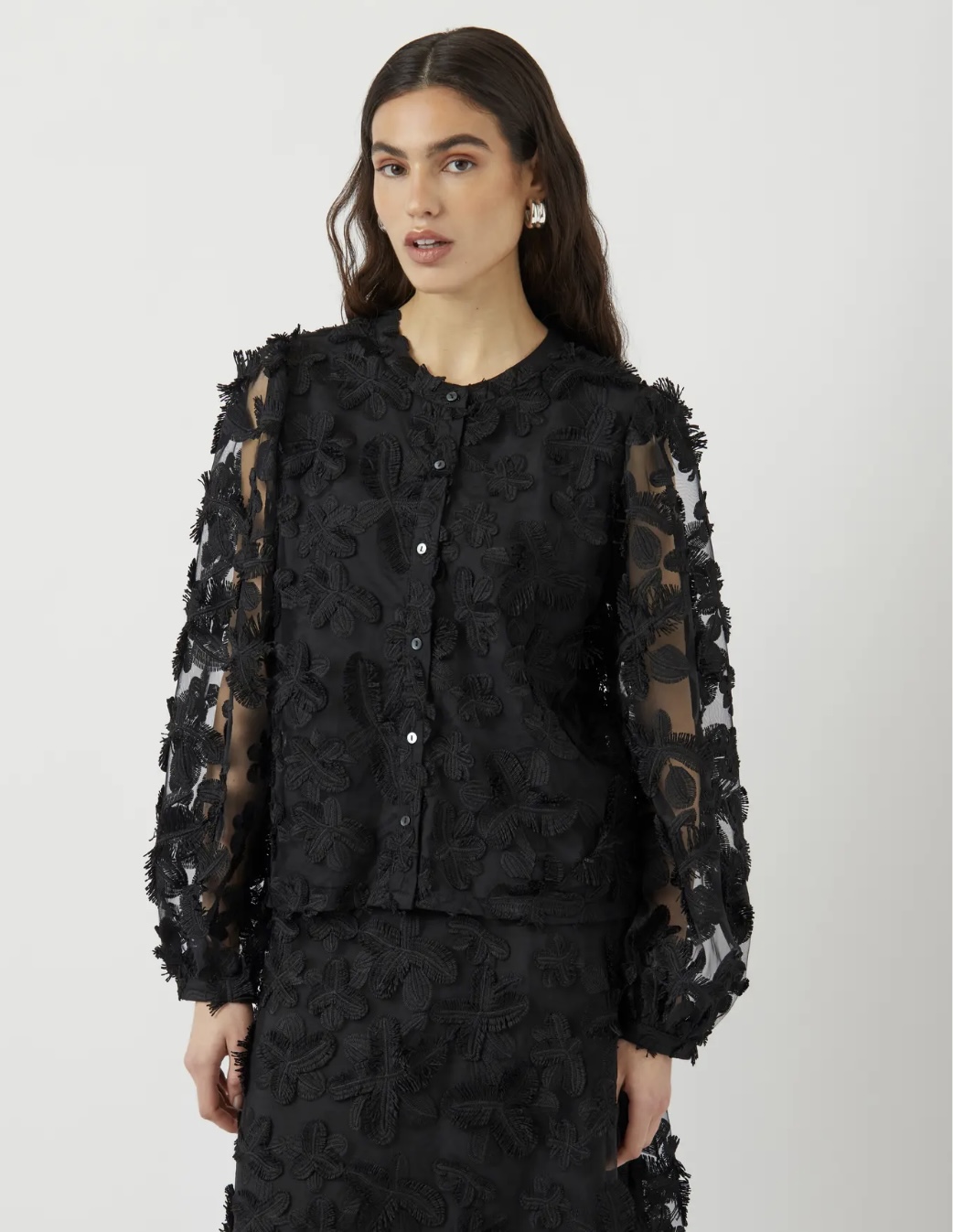 Karly LS Shirt fra Y.A.S er en lekker festbluse i klassisk sort som vil være et flott tilskudd i garderoben. Skjorten har et delikat blondemønster som tilfører et feminint og sofistikert uttrykk. Den har rund hals, knappelukking i front og lange ermer med smale mansjetter. Passformen er løs og skjorten er perfekt å kombinere med matchende skjørt for en stilig look.