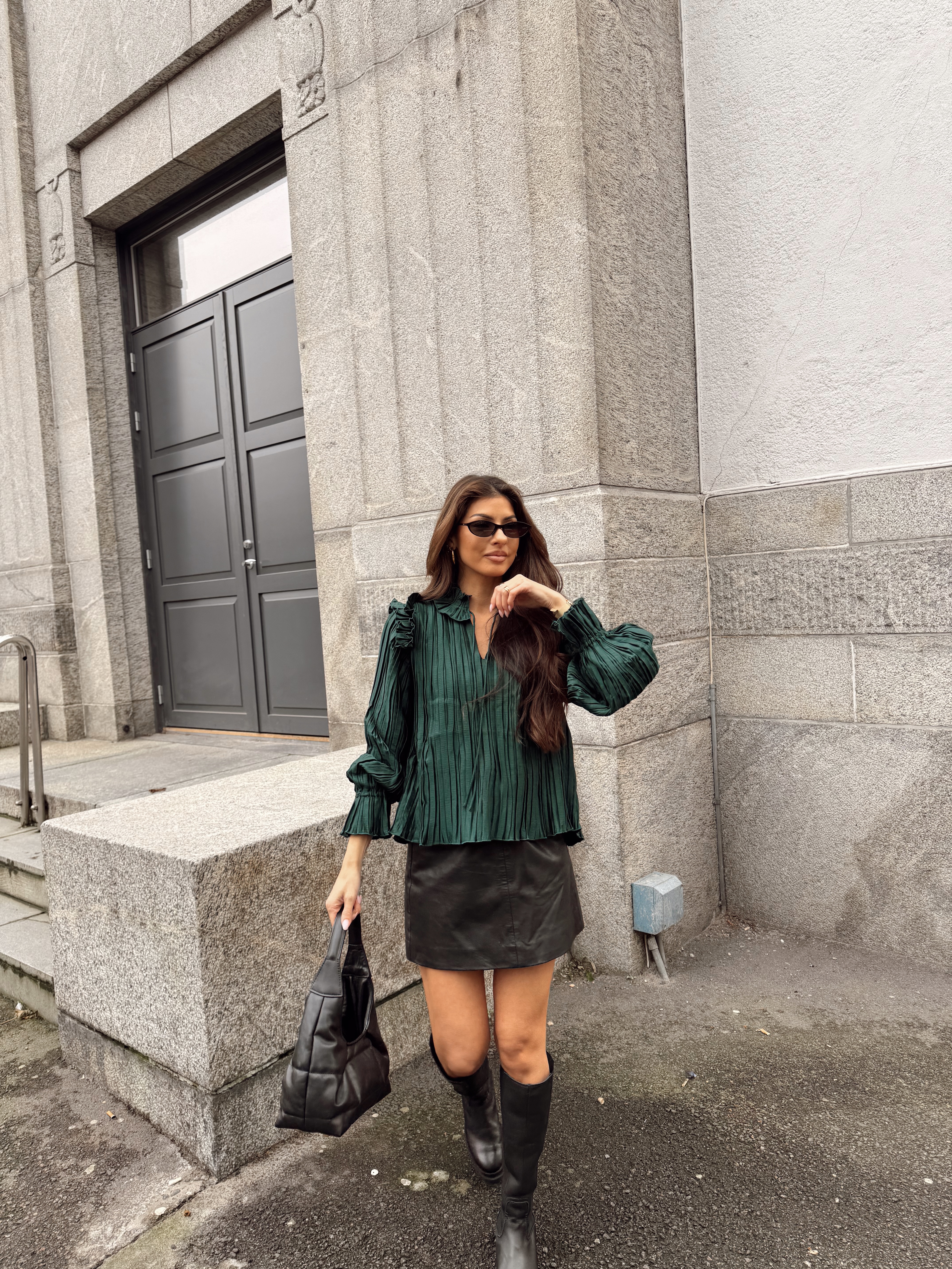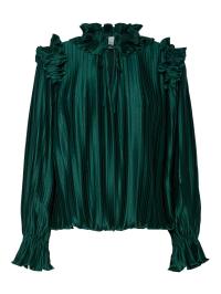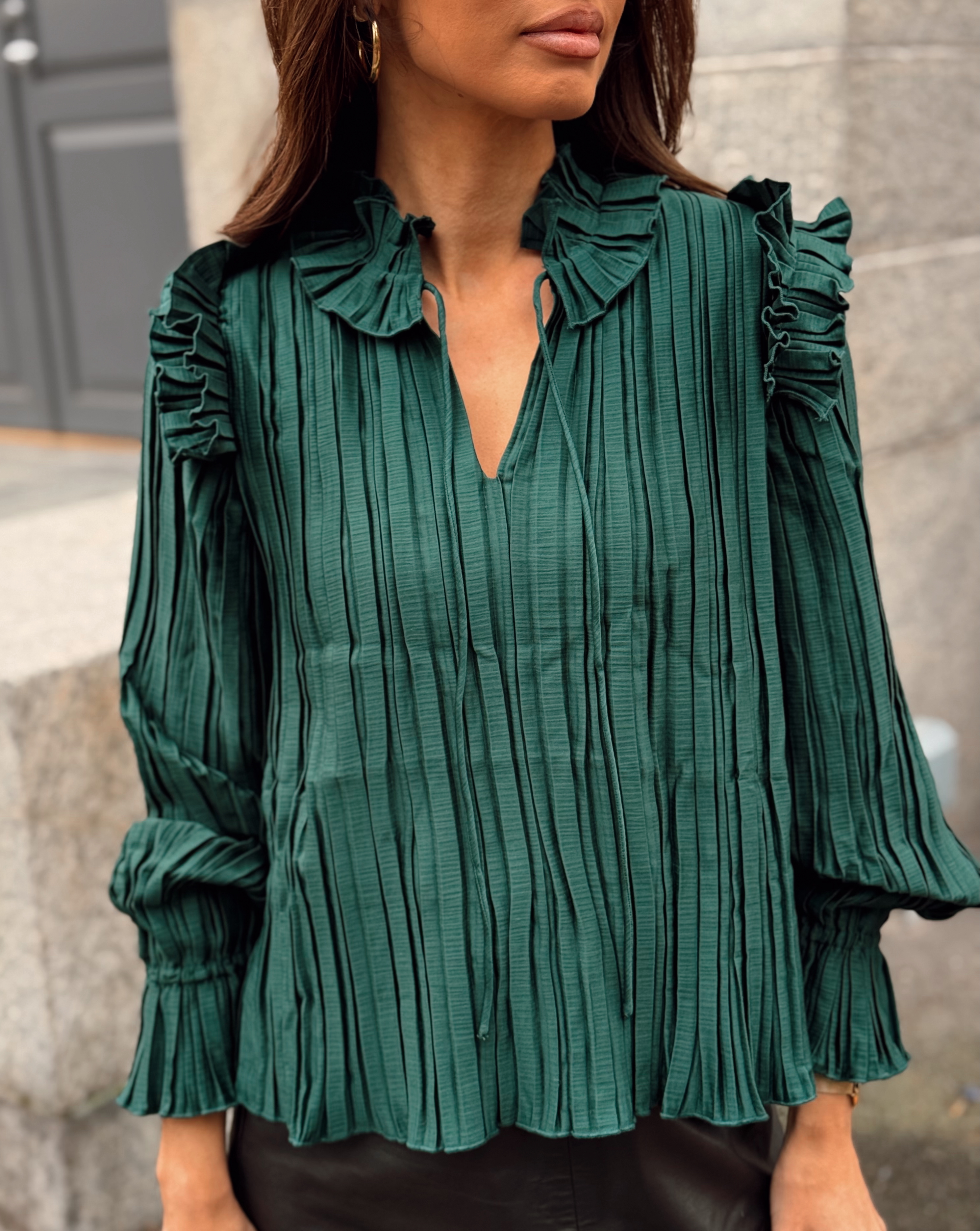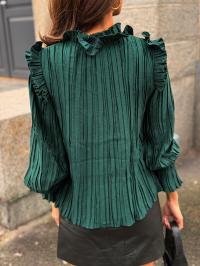 "Micco LS Top" fra Y.A.S er en elegant bluse som passer perfekt til festlige anledninger! Den kommer i en mørk grønnfarge som vil være et flott tilskudd i garderoben. Blusen har høy hals med knyting, lange ermer med elastiske mansjetter og volanger over skuldrene som gir en ekstra detalj. Den har en løs passform.