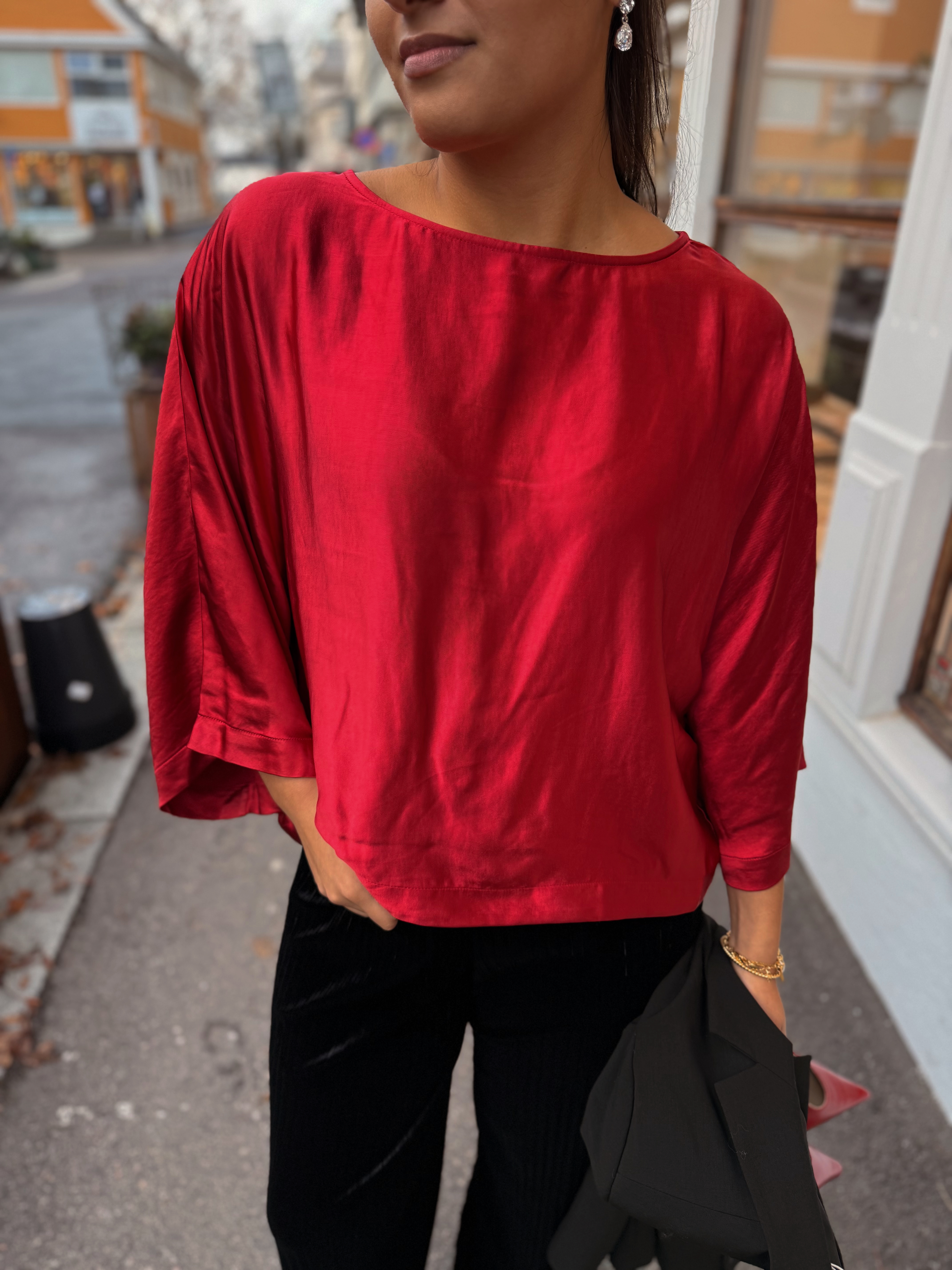 «Vima 3/4 top» fra YAS er en elegant top med skinnende stoff i lekker rødfarge.