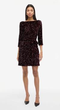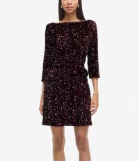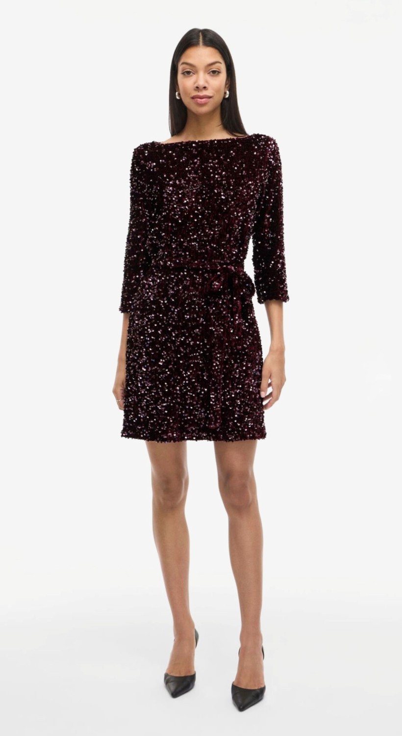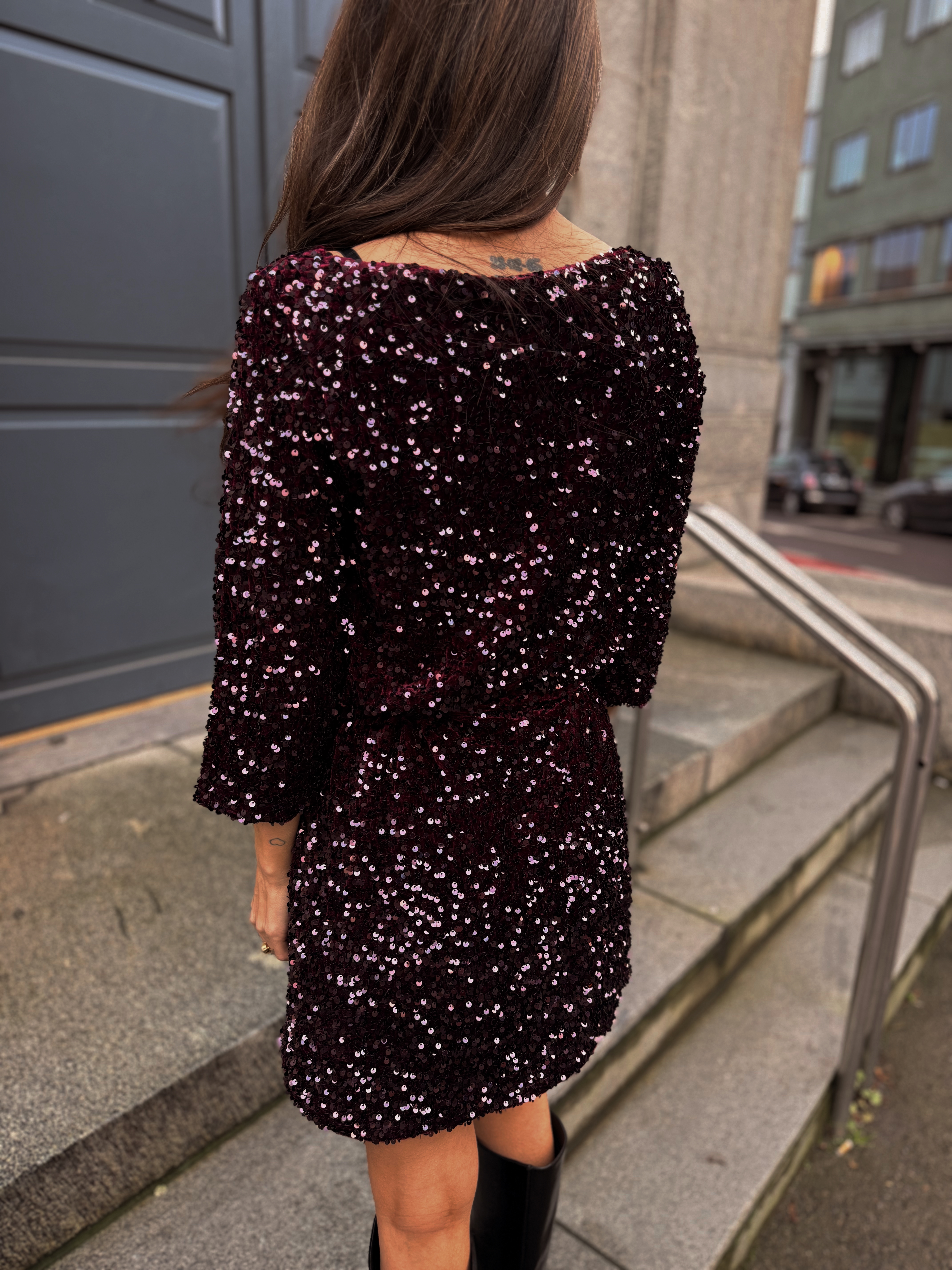 «Faith boatneck 3/4 dress» fra Yas er en rålekker paljett kjole med rund hals og halvlange ermer. Kjolen har også belte i livet.