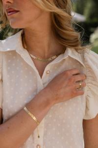Kjedet er laget av 18 karat gullbelagt messing og passer like godt til hverdags som til festlige anledninger – et perfekt statement-smykke alene, eller i kombinasjon med andre halskjeder for en lagvis look.