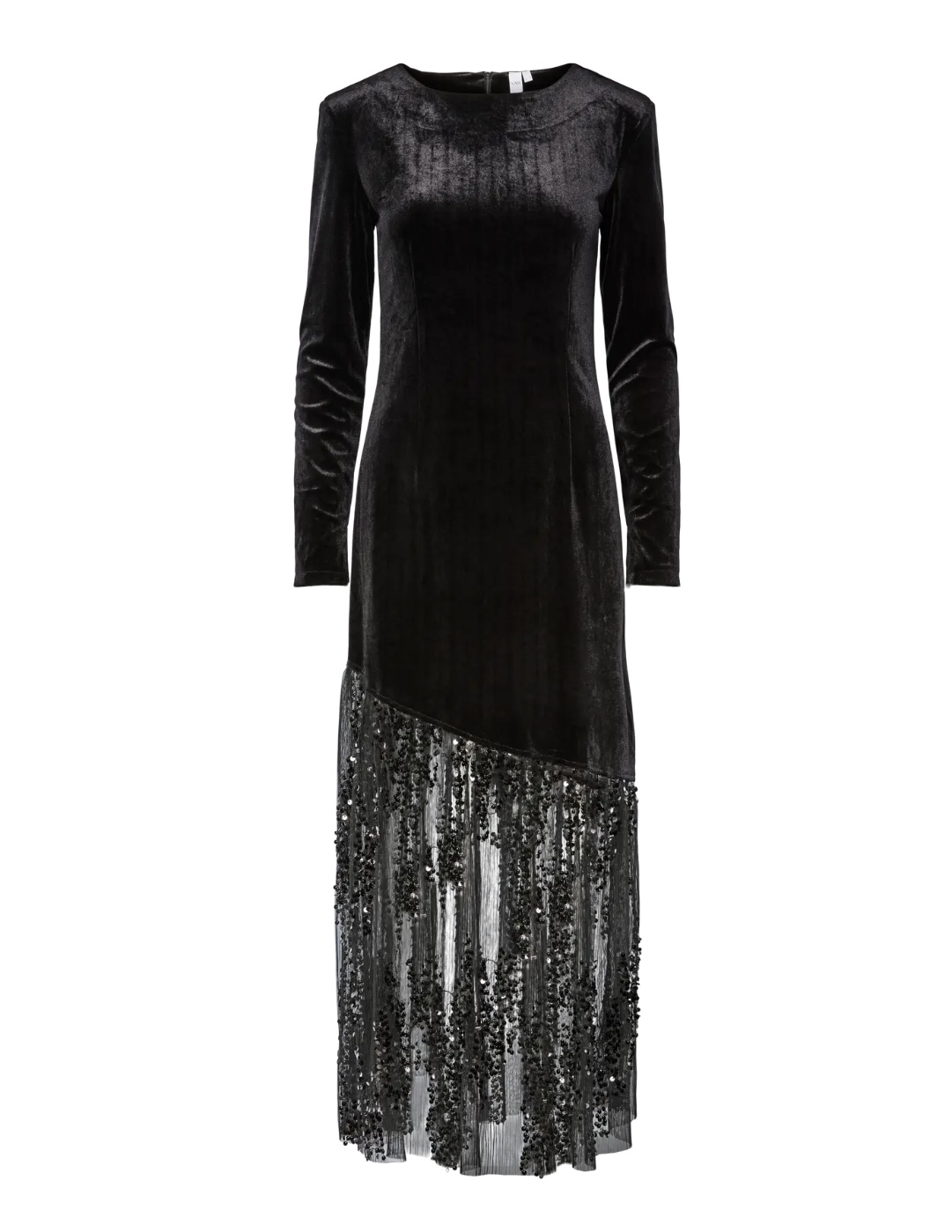"Tera long dress" fra YAS er en vakker lang tettsittende kjole I sort velur med rund hals og lang erm. Vakre detaljer på skjørte.
