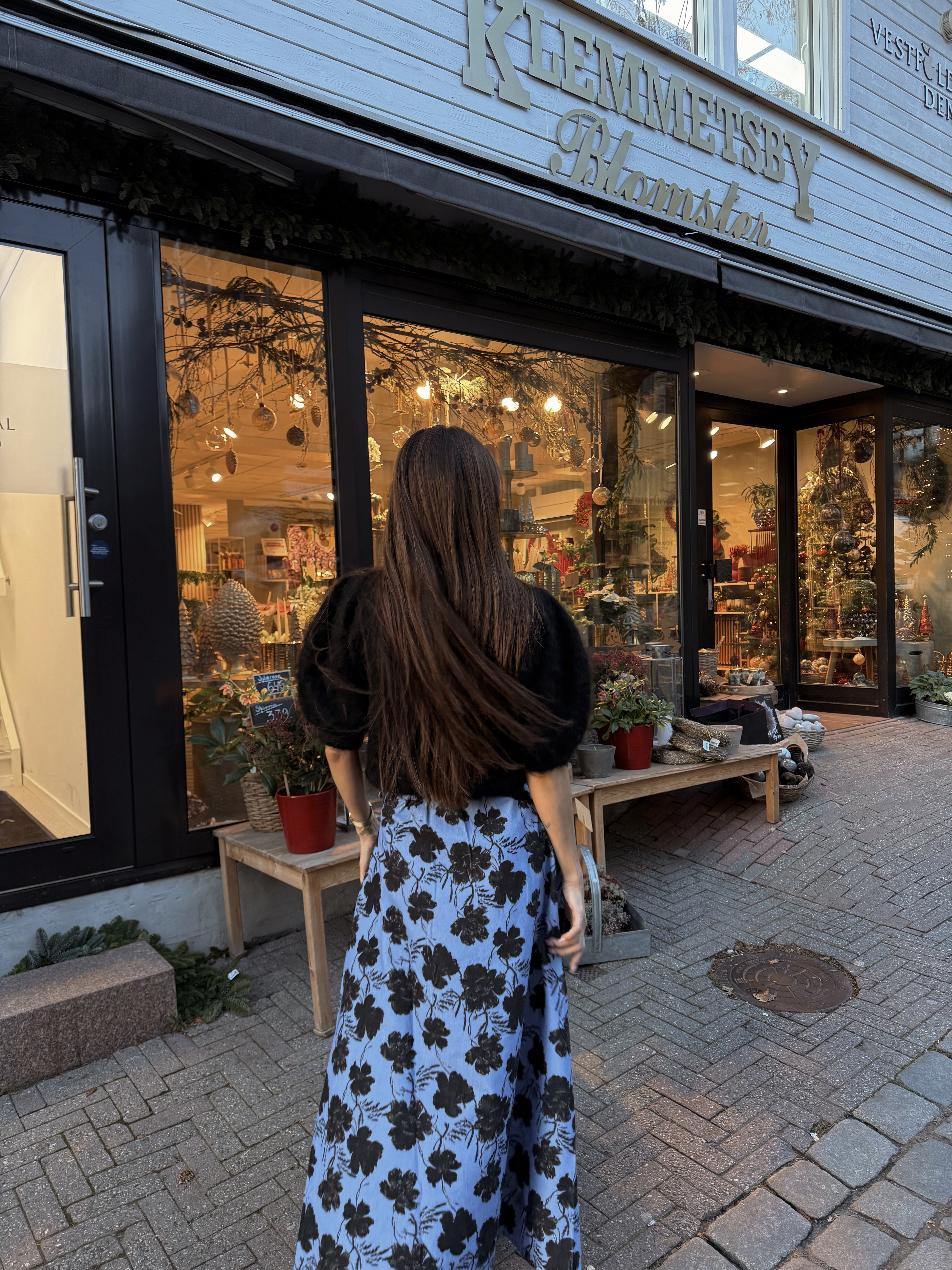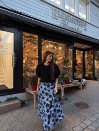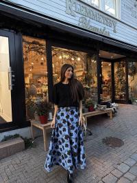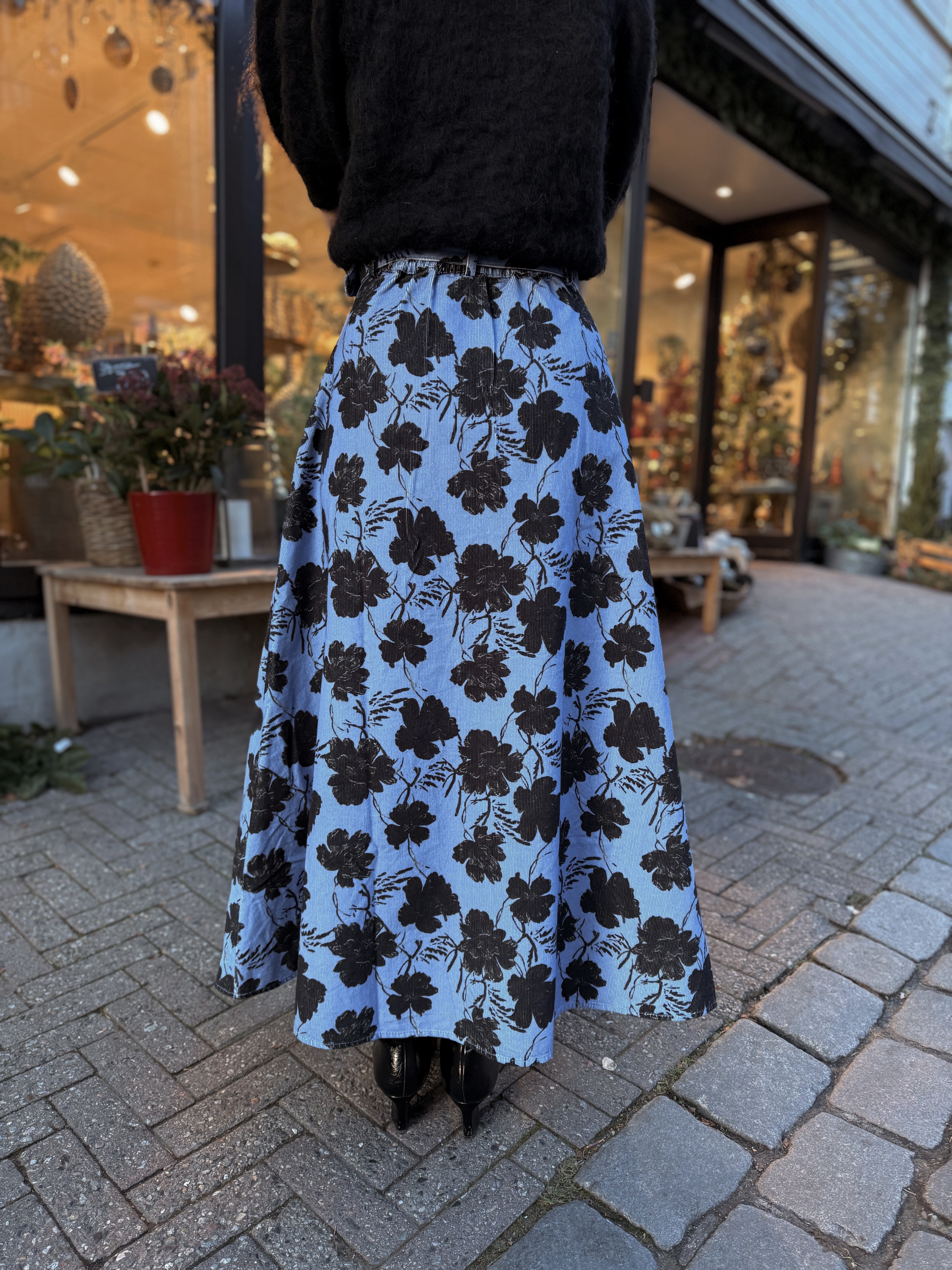 "Cord Maxi Skirt "fra byTiMo. Dette skjørtet er har en maxi lengde, med en A-form. Printet "Vintage Peony" er ett tidløst print som går til mage anledninger. Skjørtet leveres med et løst, matchende belte.. Perfekt for enhver anledning, kan styles med alt fra strikk til skjorter.