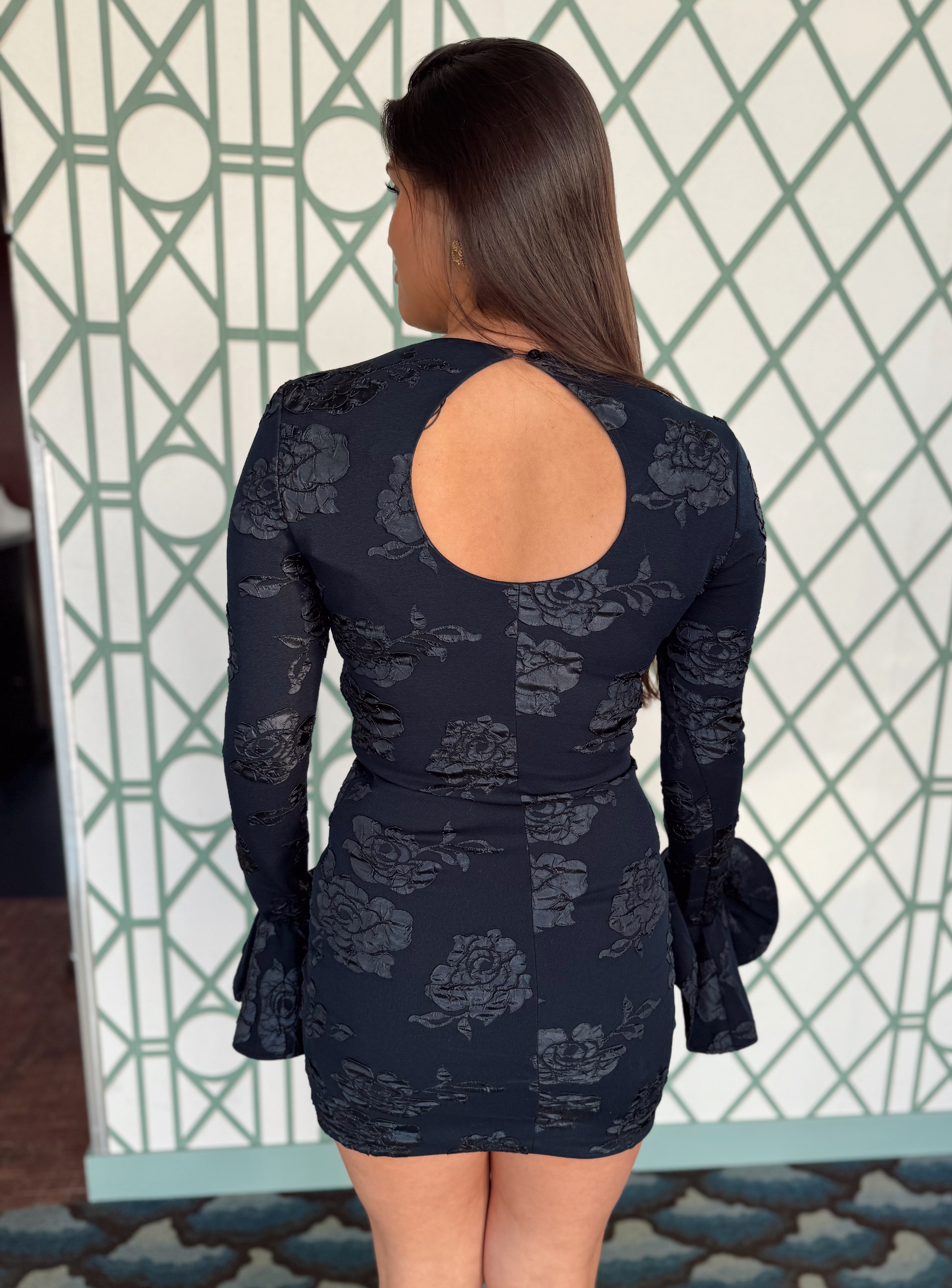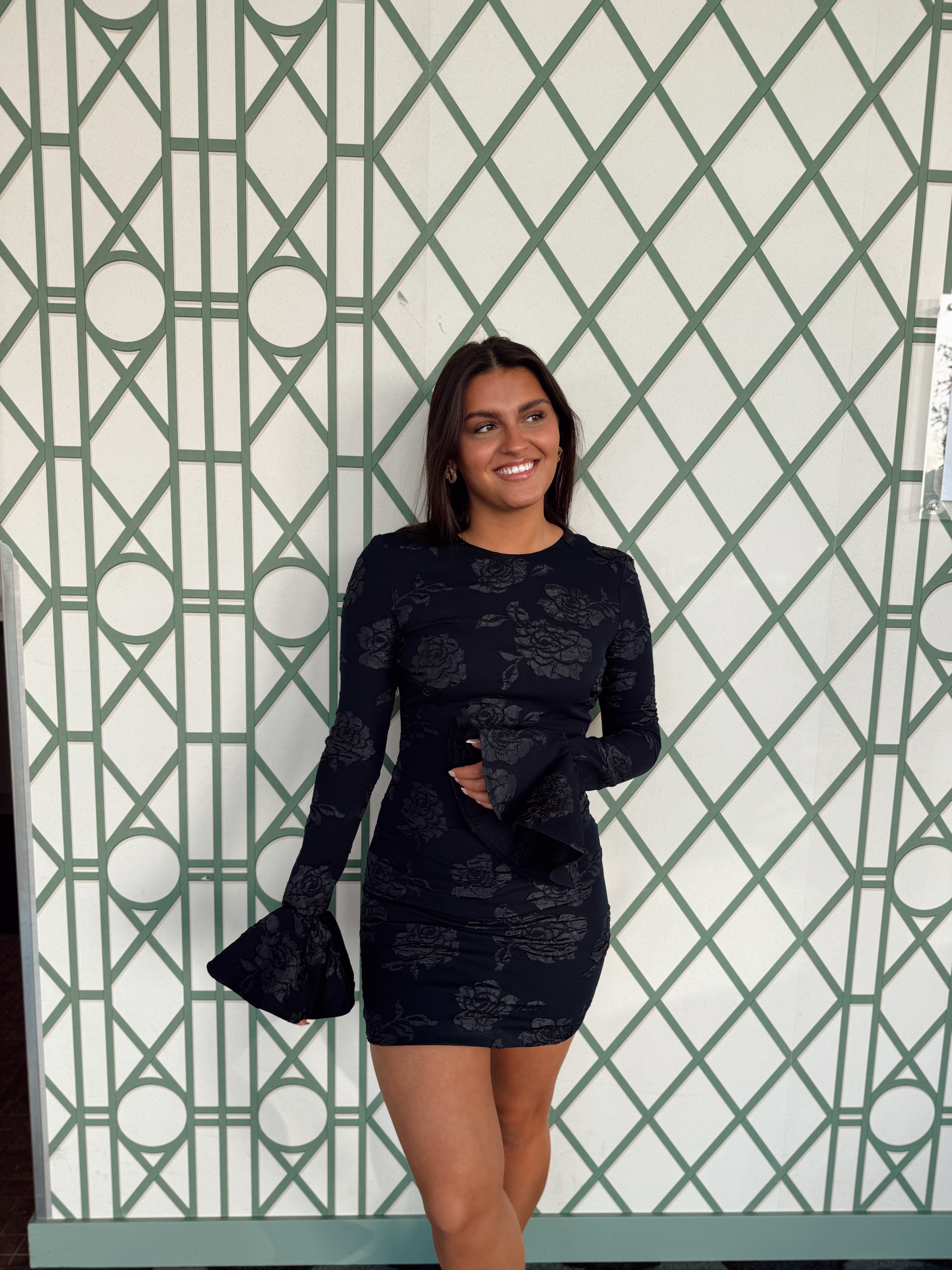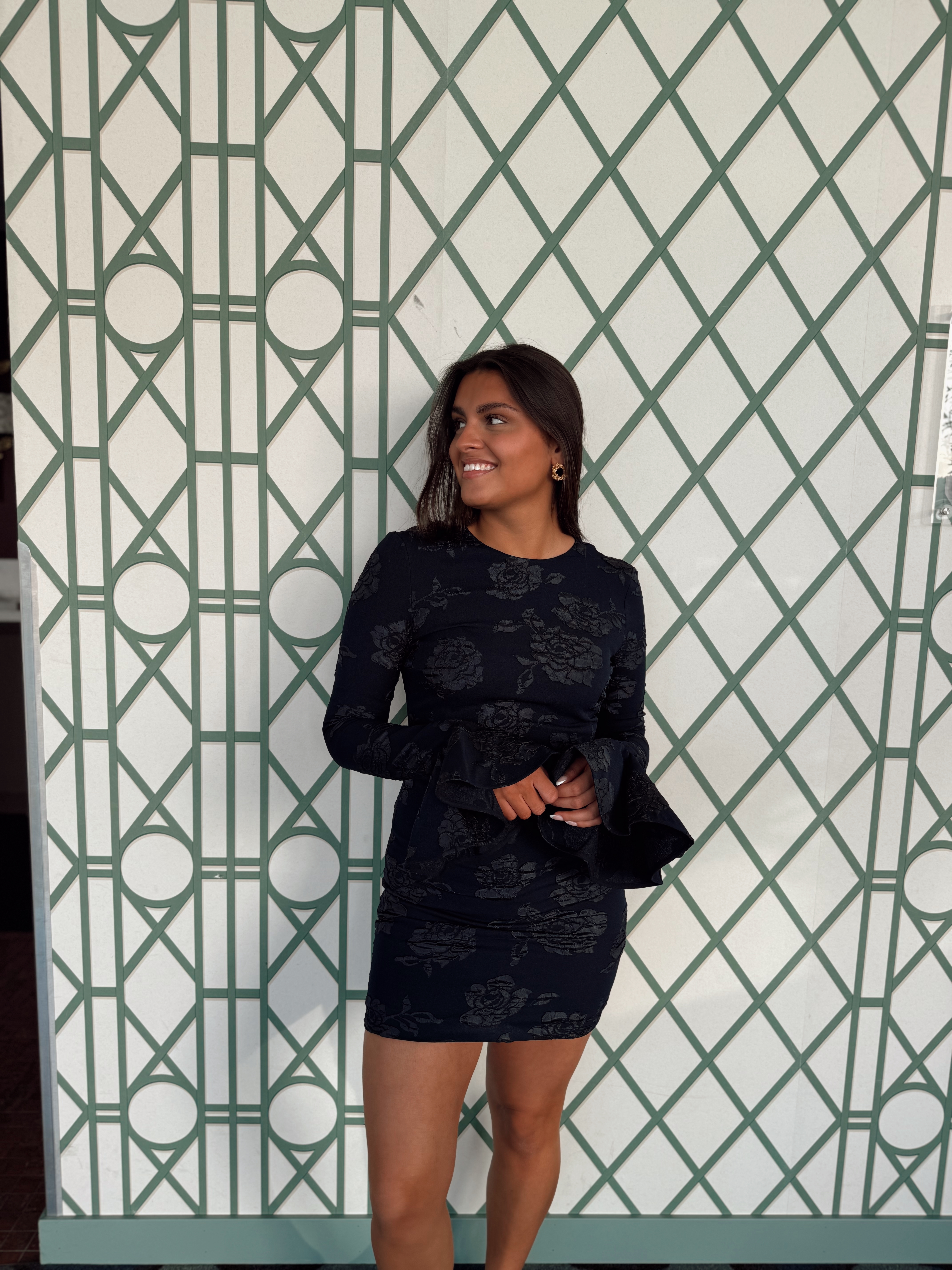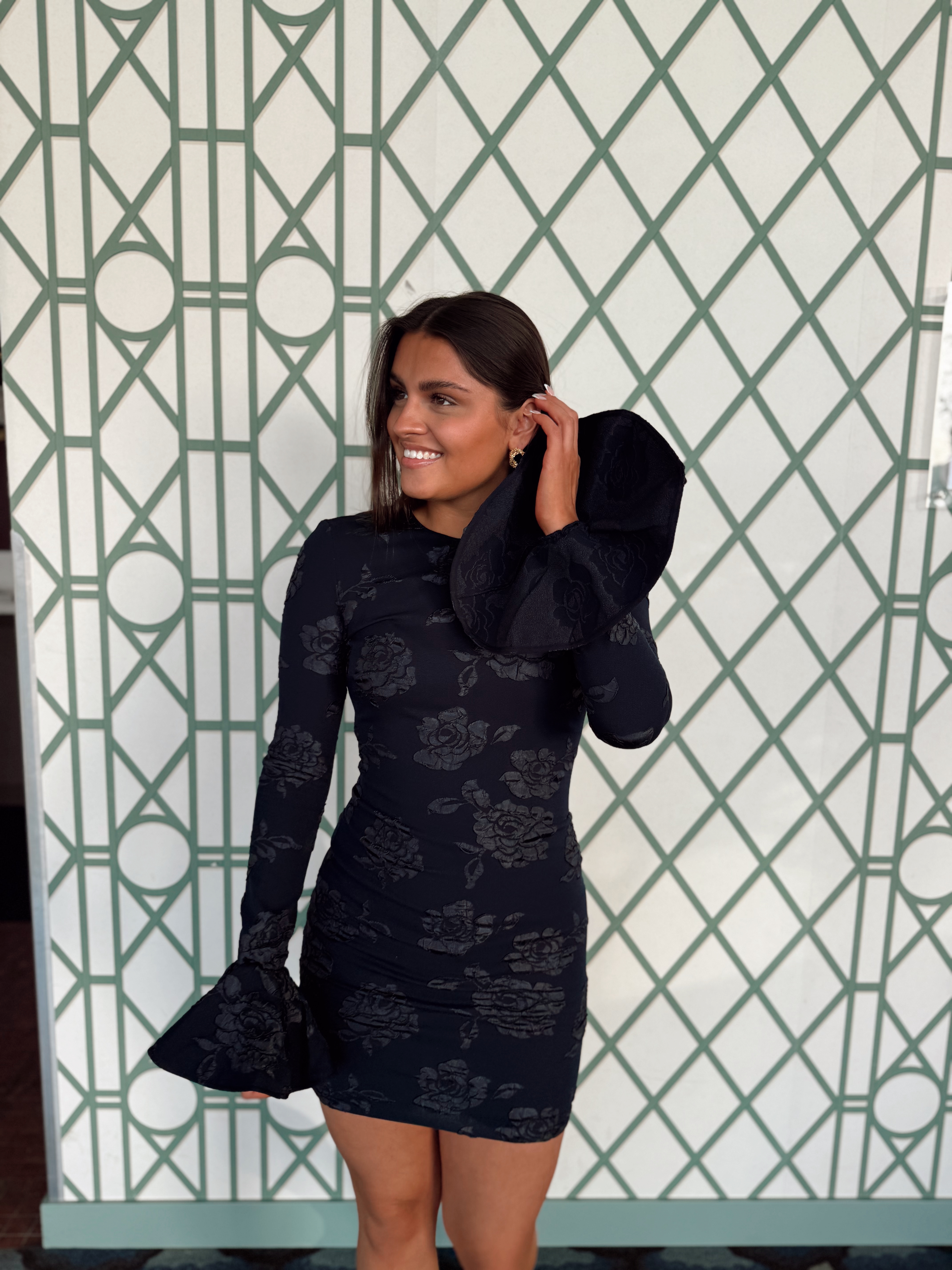 «Jacquard mini dress» fra Rotate Svart tettsittende minikjole med lange ermer og utstående mansjetter. Den er dekorert med en heldekkende blomstrete print. Kjolen har en rund hals og en synlig glidelåslukking bak. Den er foret.