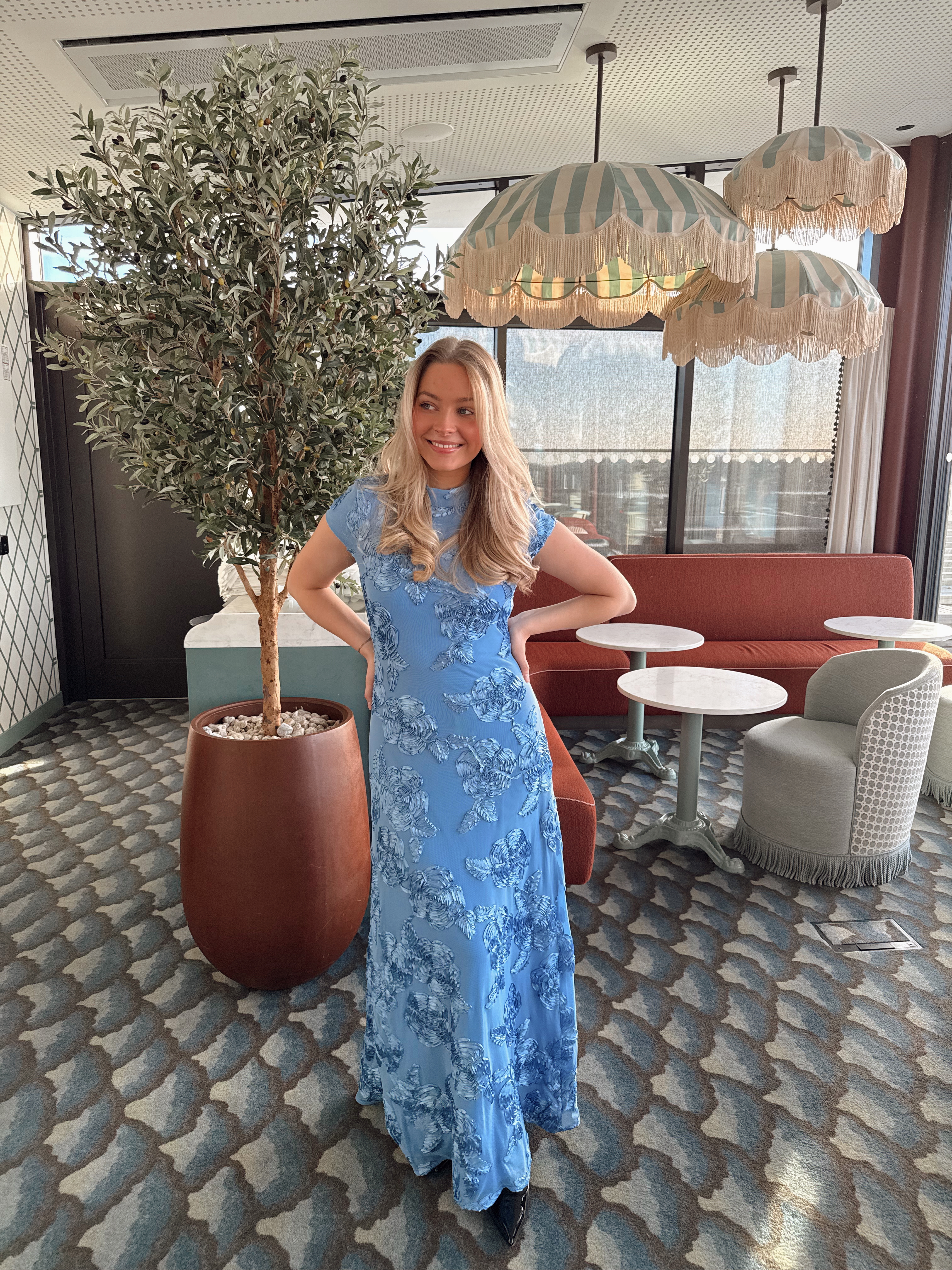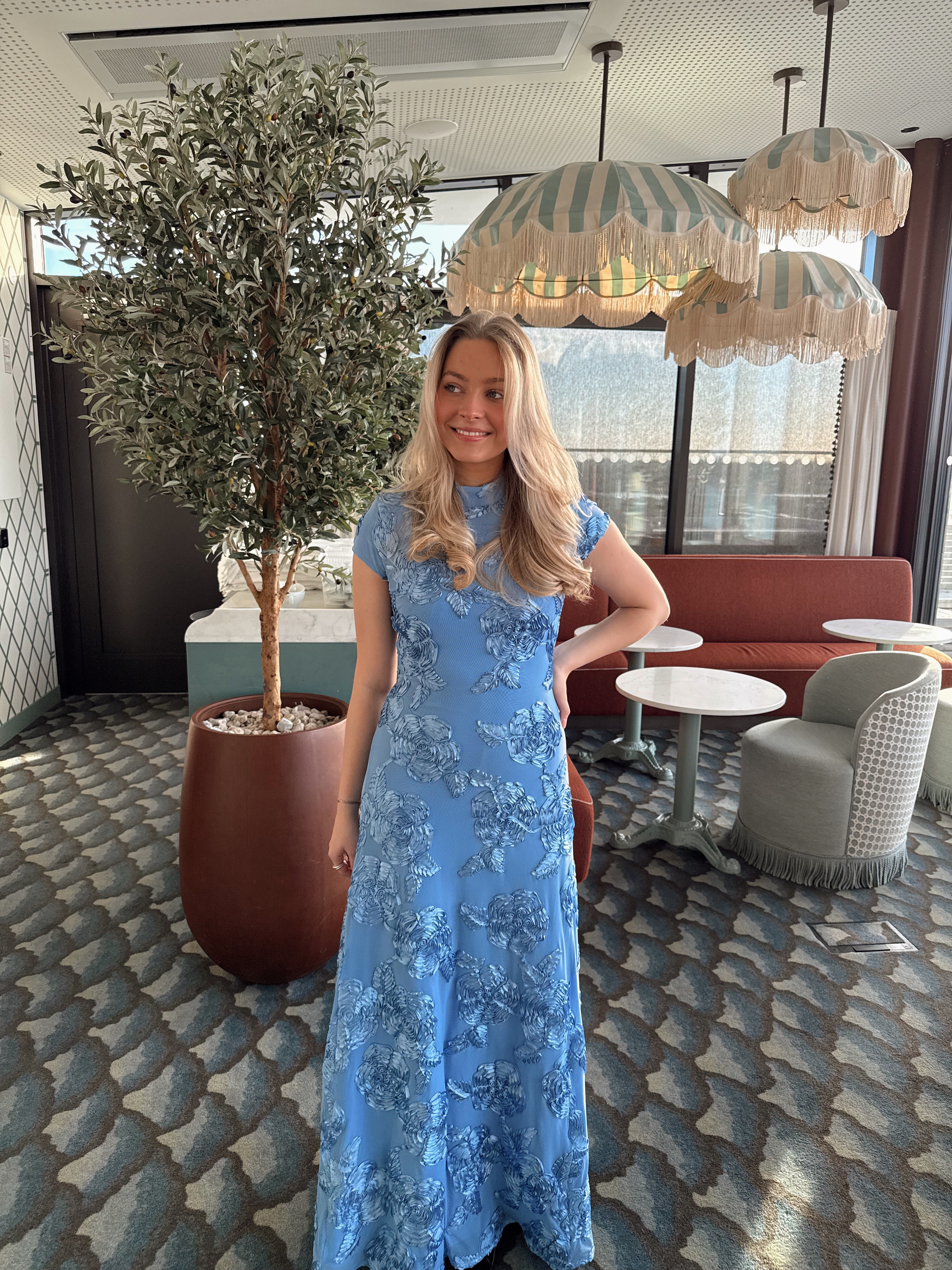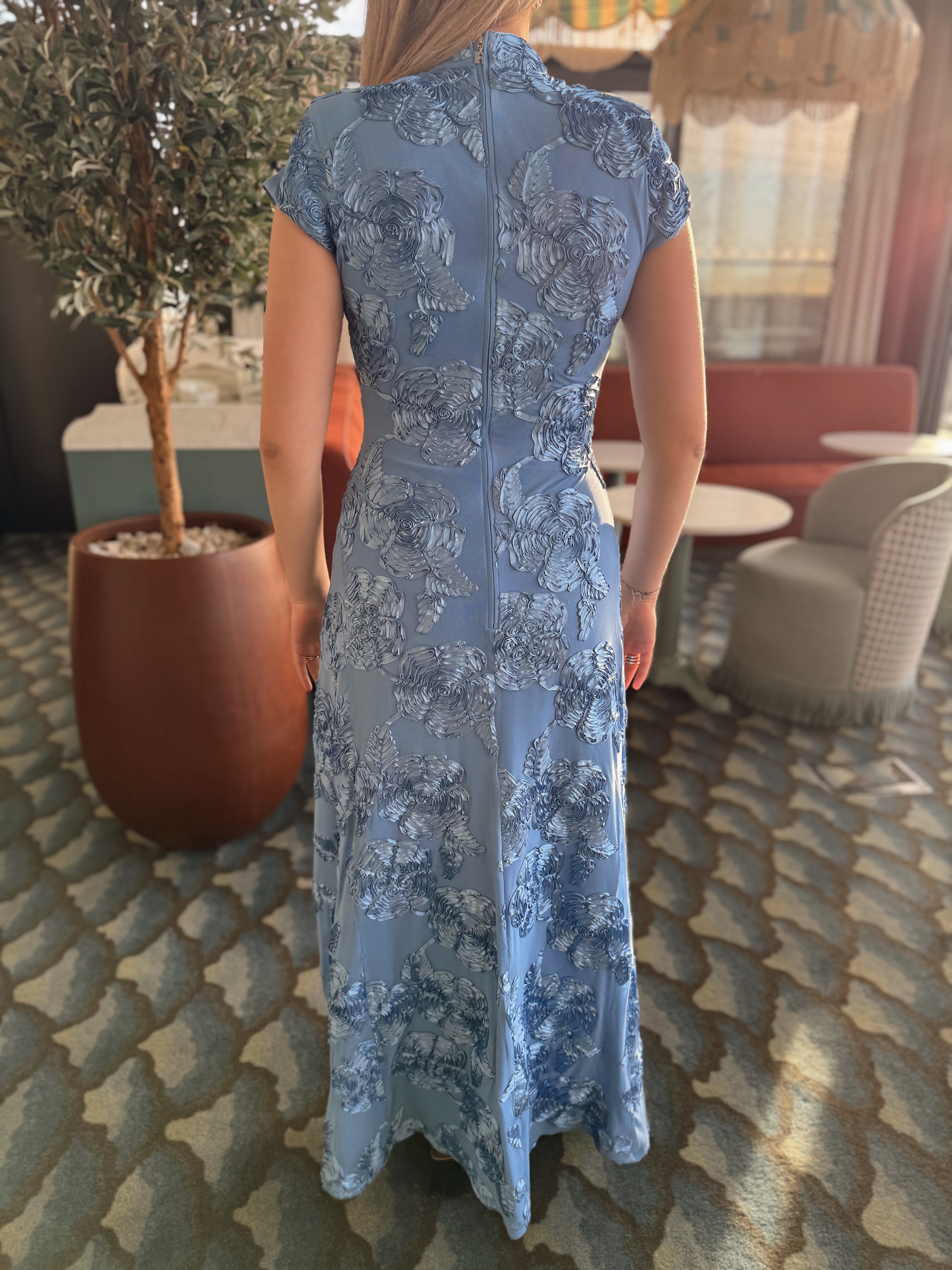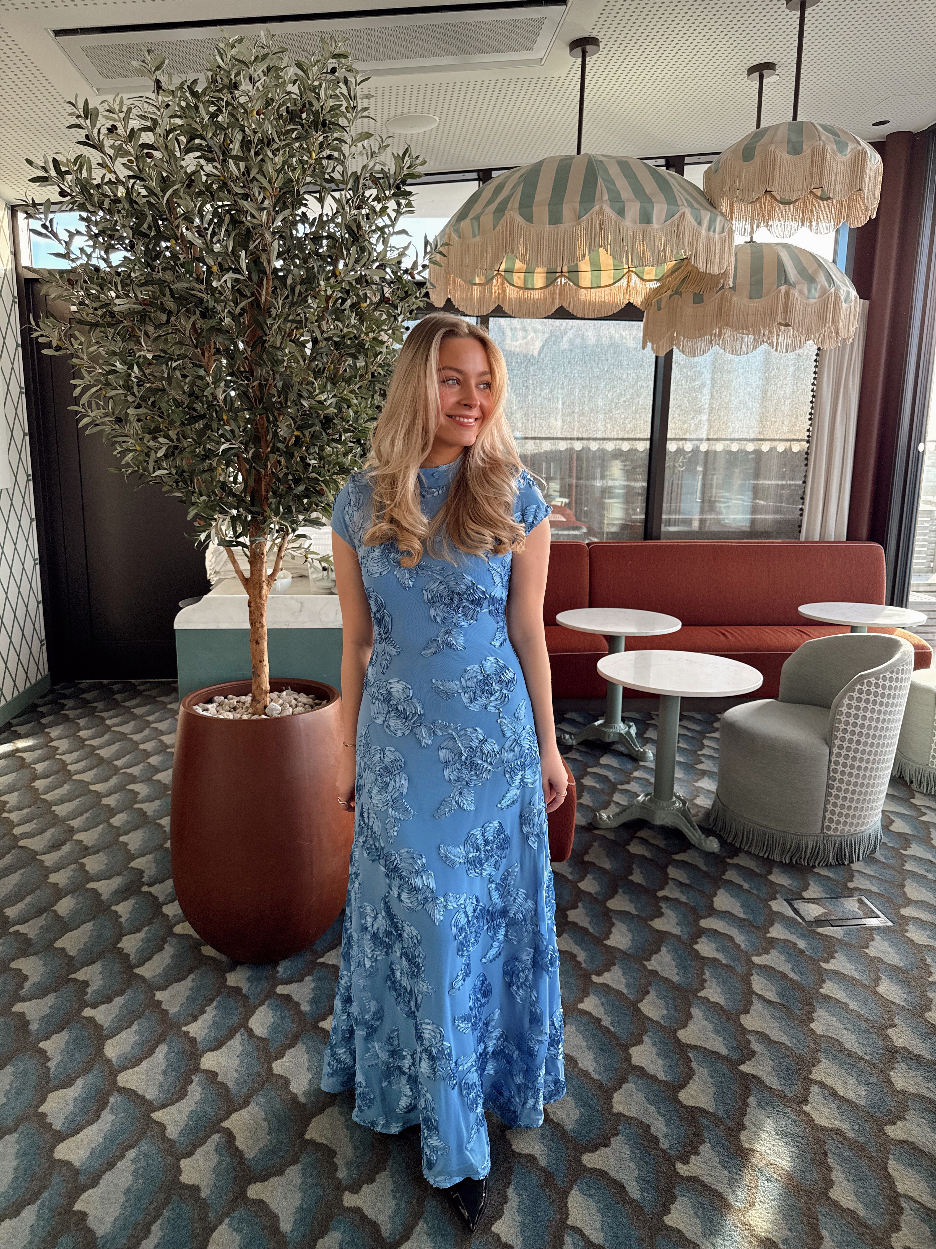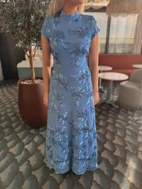 "Mesh capsleeve maxi dress" fra Rotate. Denne flower mesh maxikjolen har en ermeløs design med høy hals og en figurnær overdel. Stoffet er prydet med et intrikat blomster-mesh mønster, som gir kjolen et delikat og elegant uttrykk. Kjolen har en skjult glidelås bak for en ren avslutning. Skjørtet faller til maxilengde, med en gjennomsiktig nedre del for et sofistikert preg.