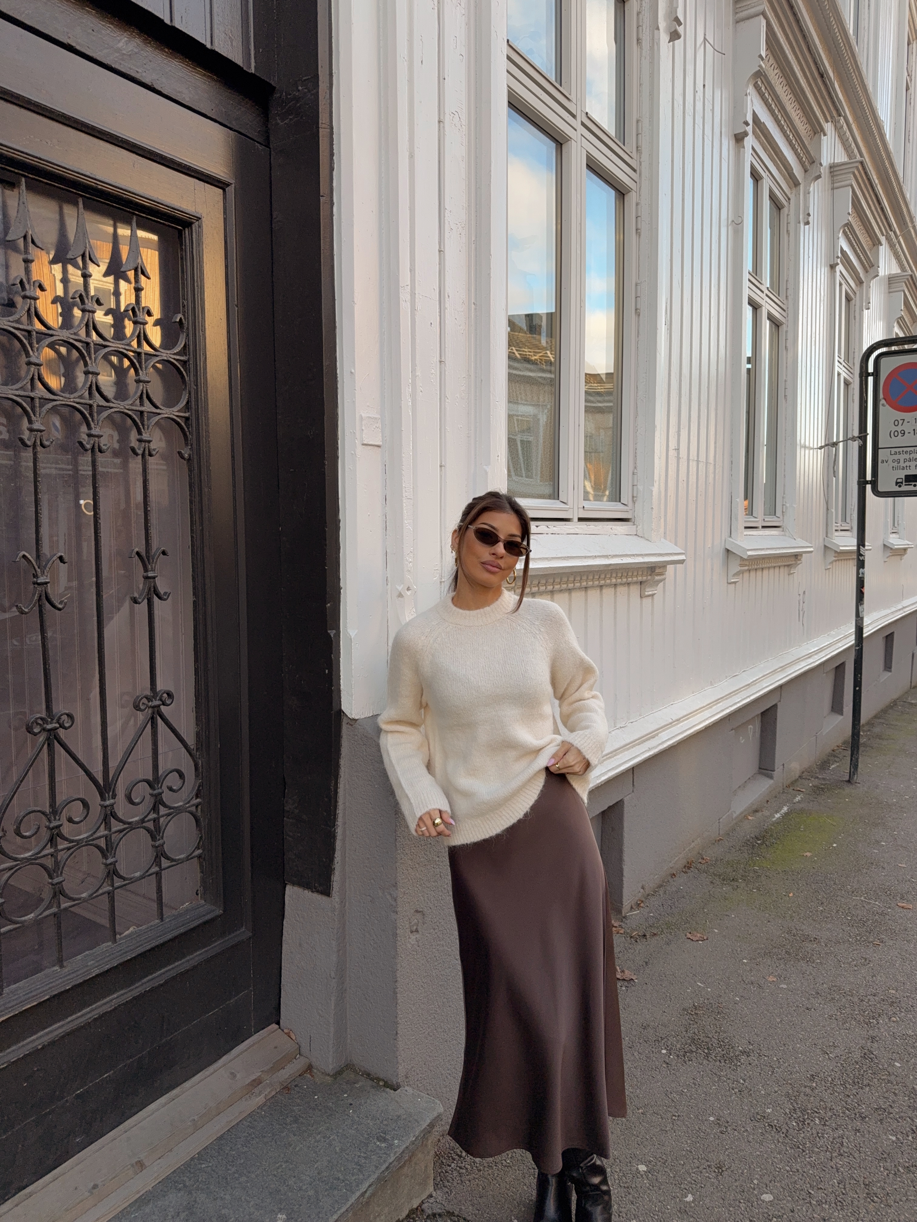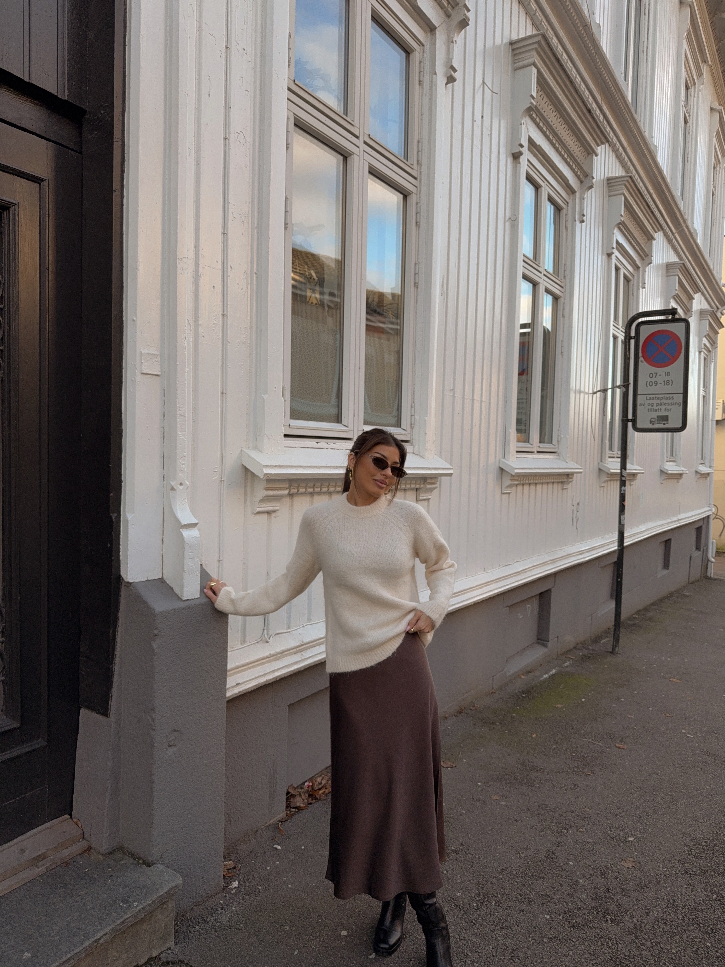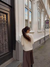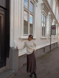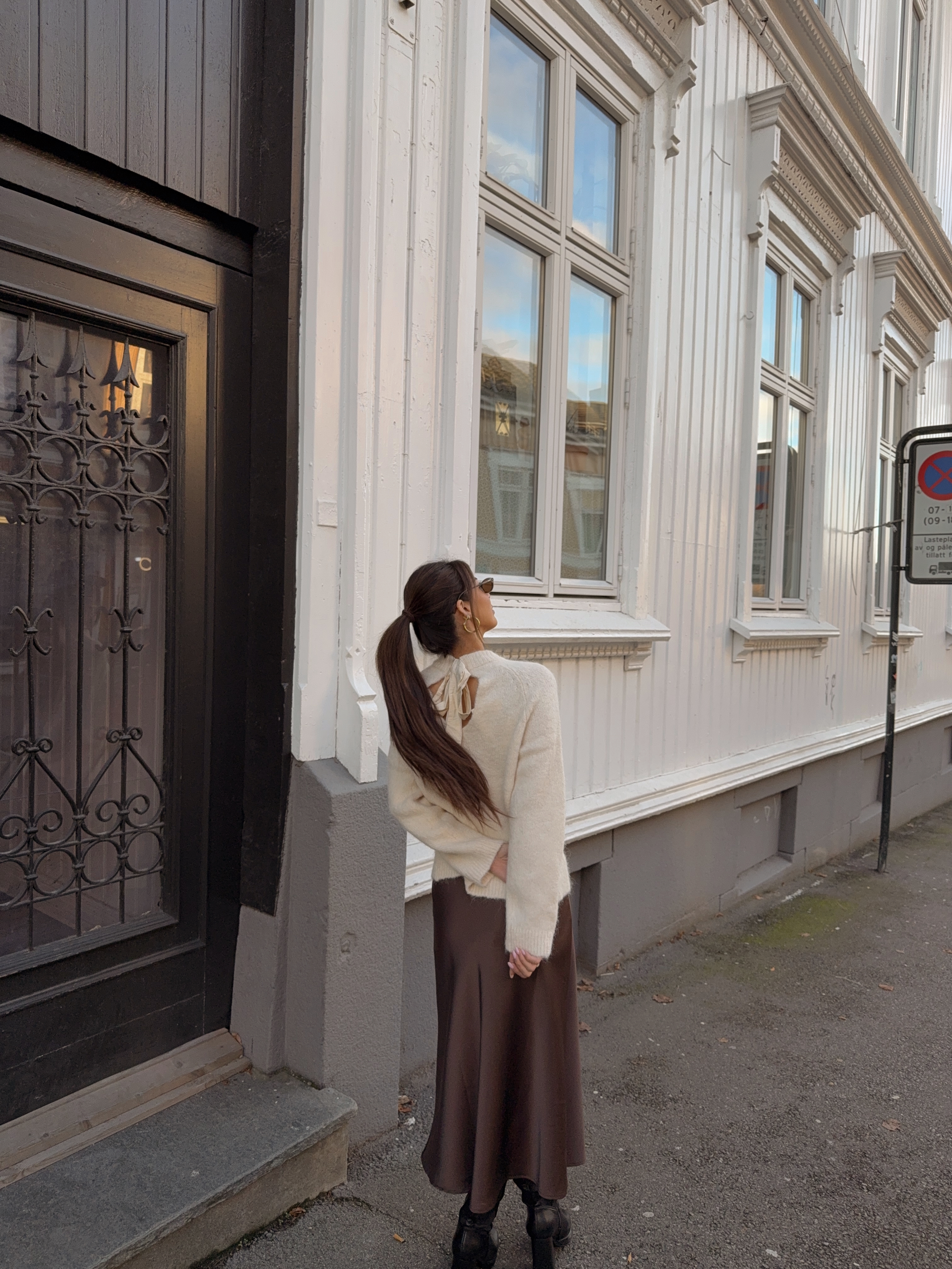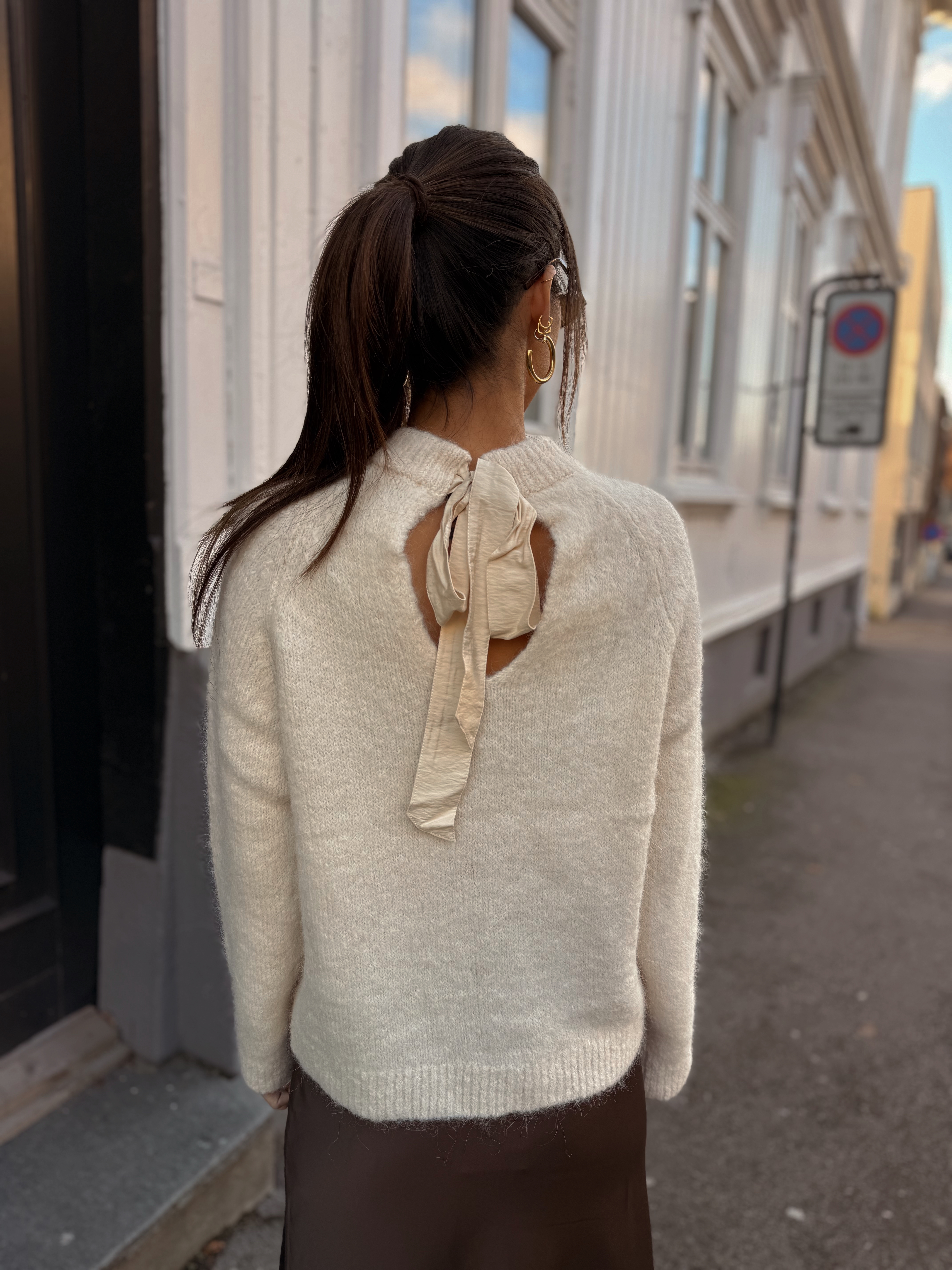 »Gabella knit bow o-neck» fra Selected Femme er en nydelig strikkegenser med rund hals med knyting bak og lang erm.