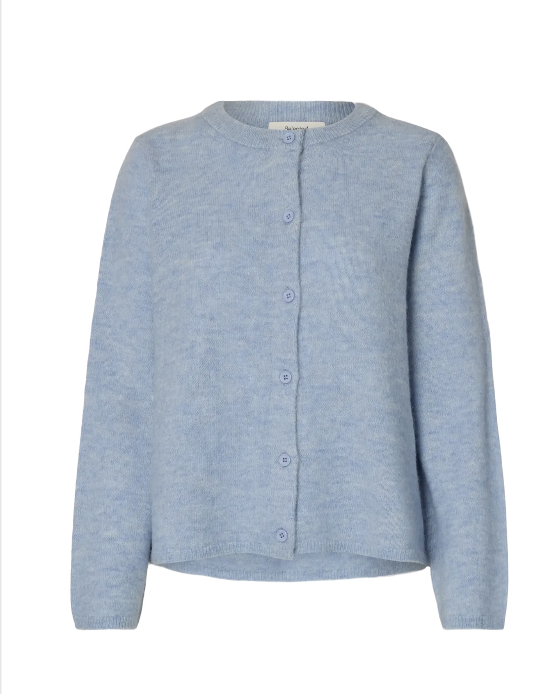 " Lulu New Knit Cardigan " fra Selected Femme er en klassisk nydelig cardigan. Rund hals, lang erm og lukkes med knapper i front, men den er like fin åpen som lukket. Normal i størrelsen.