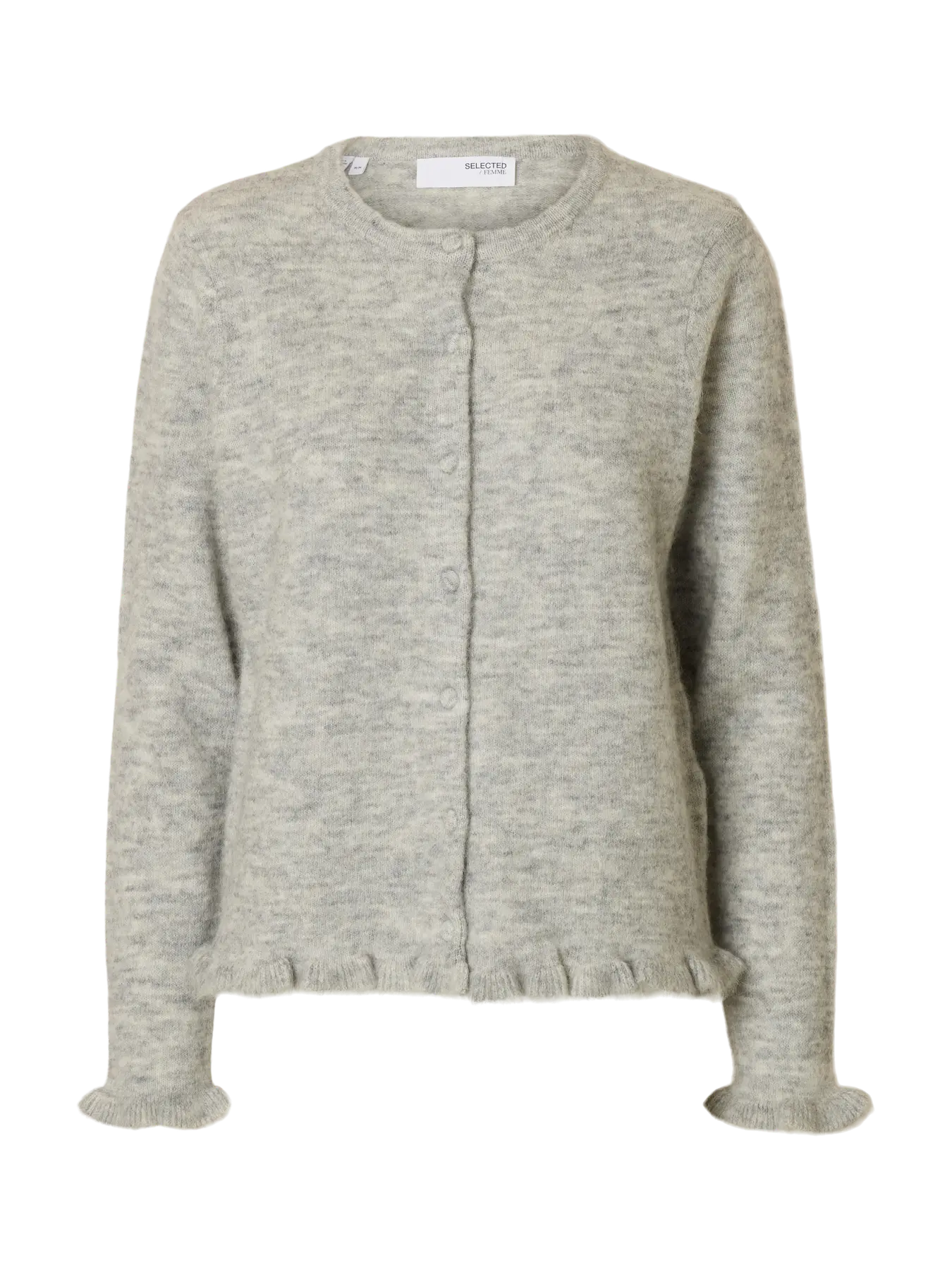 "Lulu Frill Knit Cardigan" fra Selected Femme. En feminin cardigan i myk, børstet kvalitet med delikate volanger langs kantene. Designet har rund hals, ton-i-ton knapper og rett passform som faller flatterende på kroppen. Lulu Frill Ls Knit Cardigan gir et romantisk uttrykk og passer perfekt over en enkel topp eller kjole.