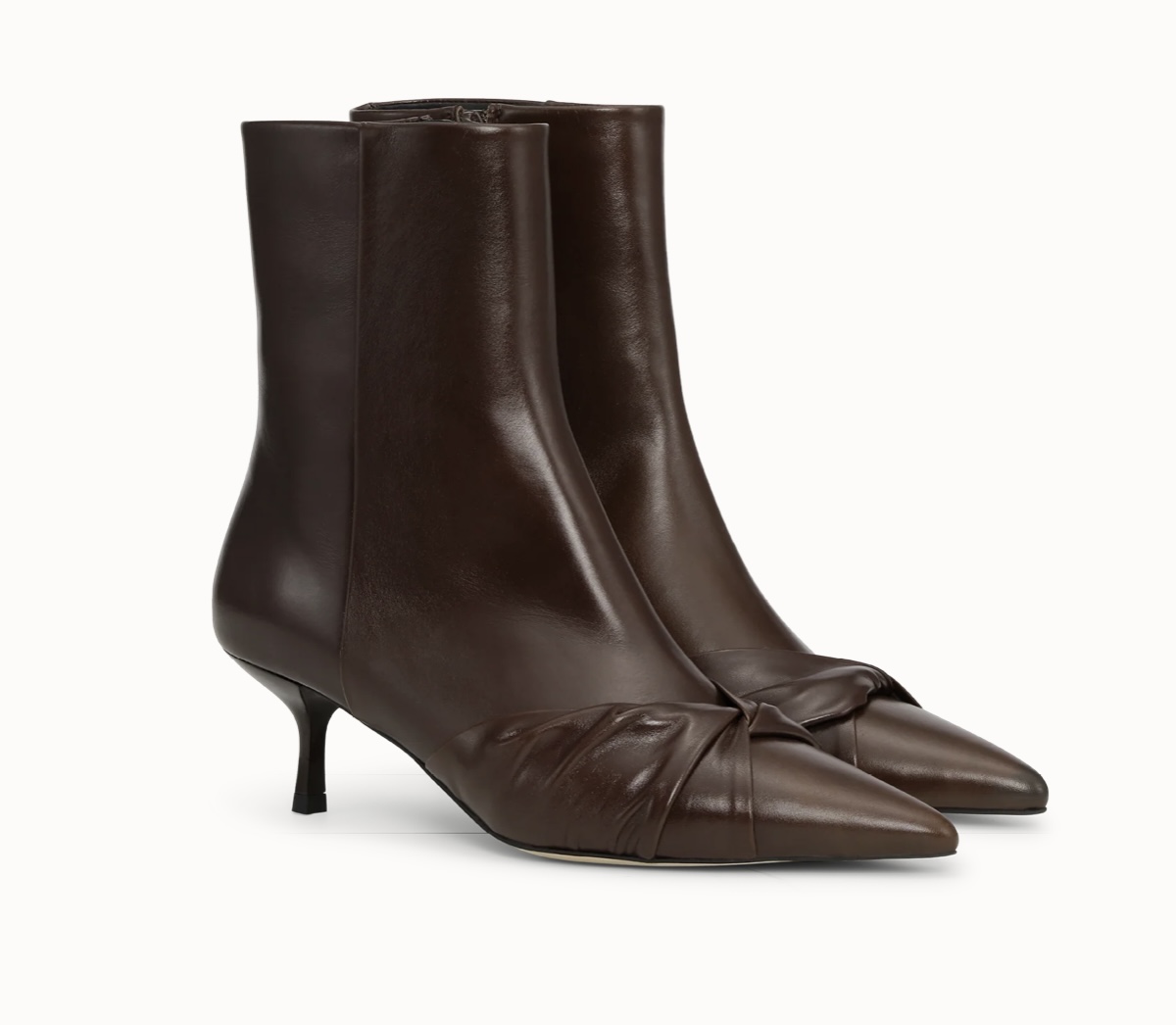«Velissia» fra Custommade er lekre ankelstøvelen i brune. Silhuetten er ren og sofistikert, formet i glatt, sjokoladebrunt skinn med en naturlig glans som fanger lyset uten å overdrive. Over vristen samles skinnet i en subtil vridd detalj, som en diskret knutetekstur som gir skoen dybde og karakter. En detalj som gjør henne unik, uten å rope om oppmerksomhet.